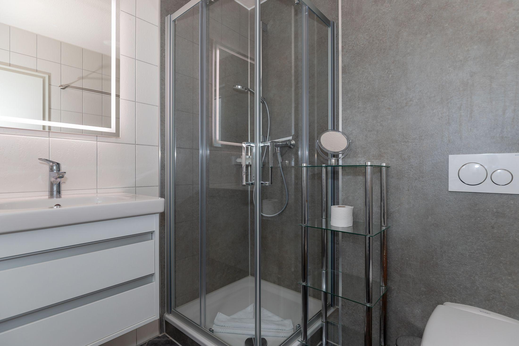 Das Badezimmer ist mit einer Dusche, einem Waschbecken mit Unterschrank für Ihre Badutensilien sowieein WC ausgestattet.
