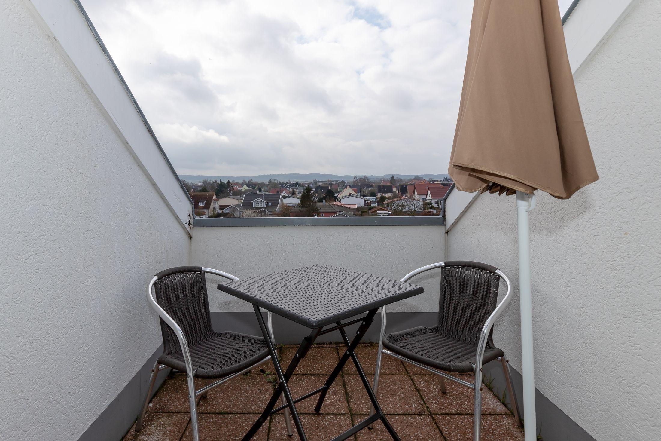 An Ihre Wohnung grenzt eine Loggia, die Sie direkt von Ihrem Wohnzimmer aus betreten können. Das Besondere ist die Südausrichtung der Loggia, so dass Sie den ganzen Tag über Sonne genießen können. Die Loggia ist nicht einsichtig, Sie können sich hier frei entfalten. Mit Blick auf die "Kühlung" macht es wirklich Freude, dort morgens zu frühstücken oder abends ein Glas kühlen Wein zu genießen. Sie ist neu ausgestattet mit einem Tisch, 4 Stühlen und 2 Liegen sowie einer Wäschespinne.