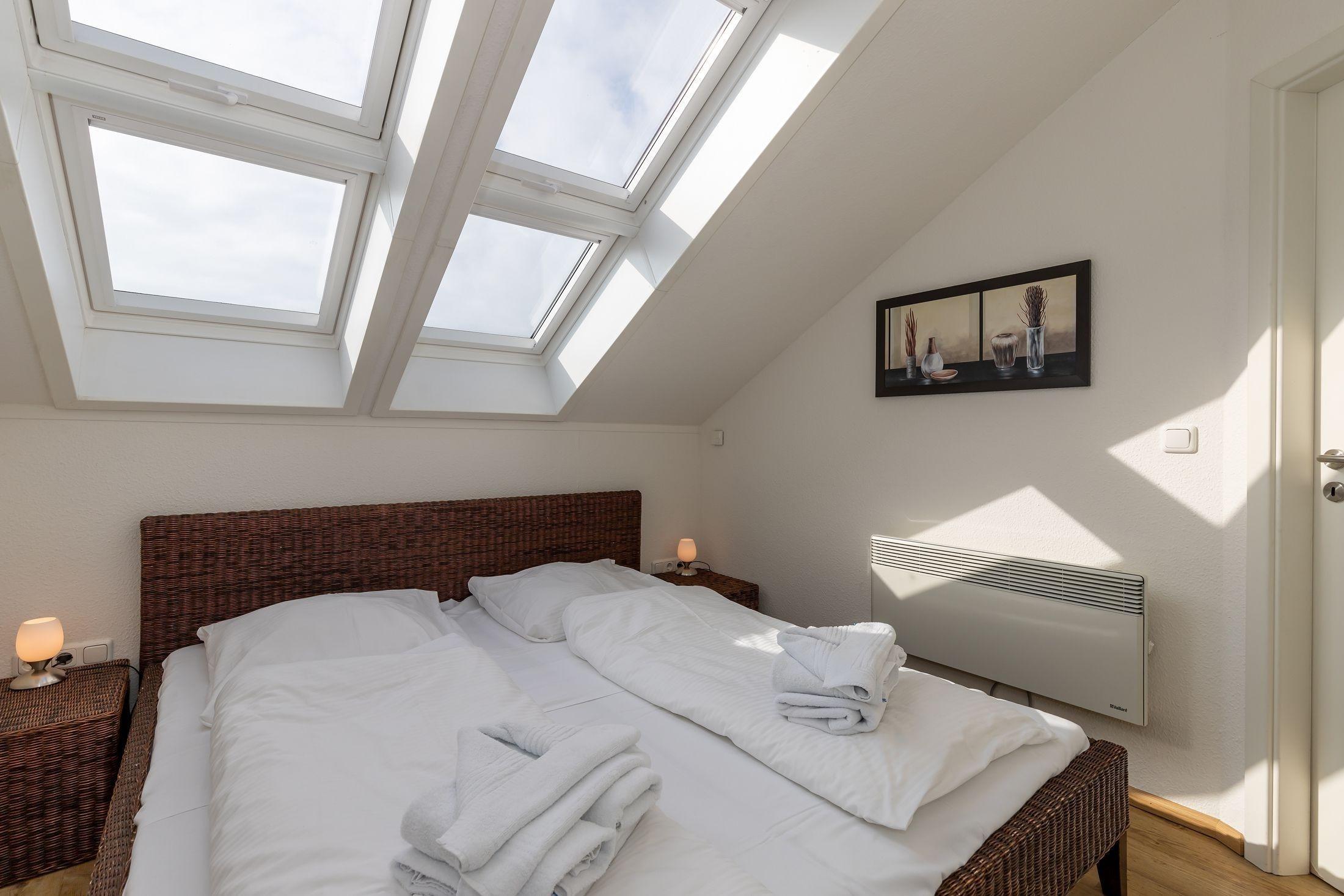 Das Apartment verfügt über ein separates Schlafzimmer mit Doppelbett und dazugehörigem begehbaren Kleiderschrank. Es können aber bequem auch 4 Personen "einziehen", da das Sofa auch als Schlafsofa genutzt werden kann.