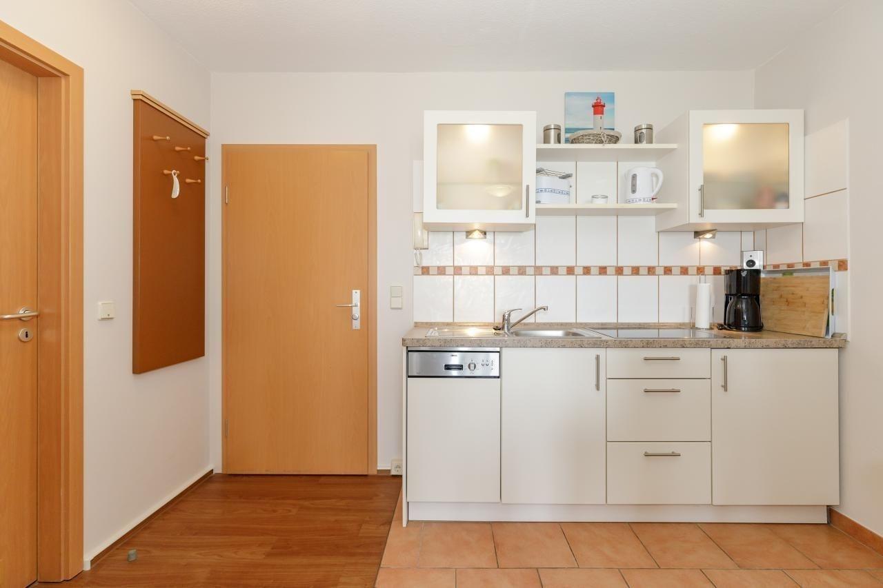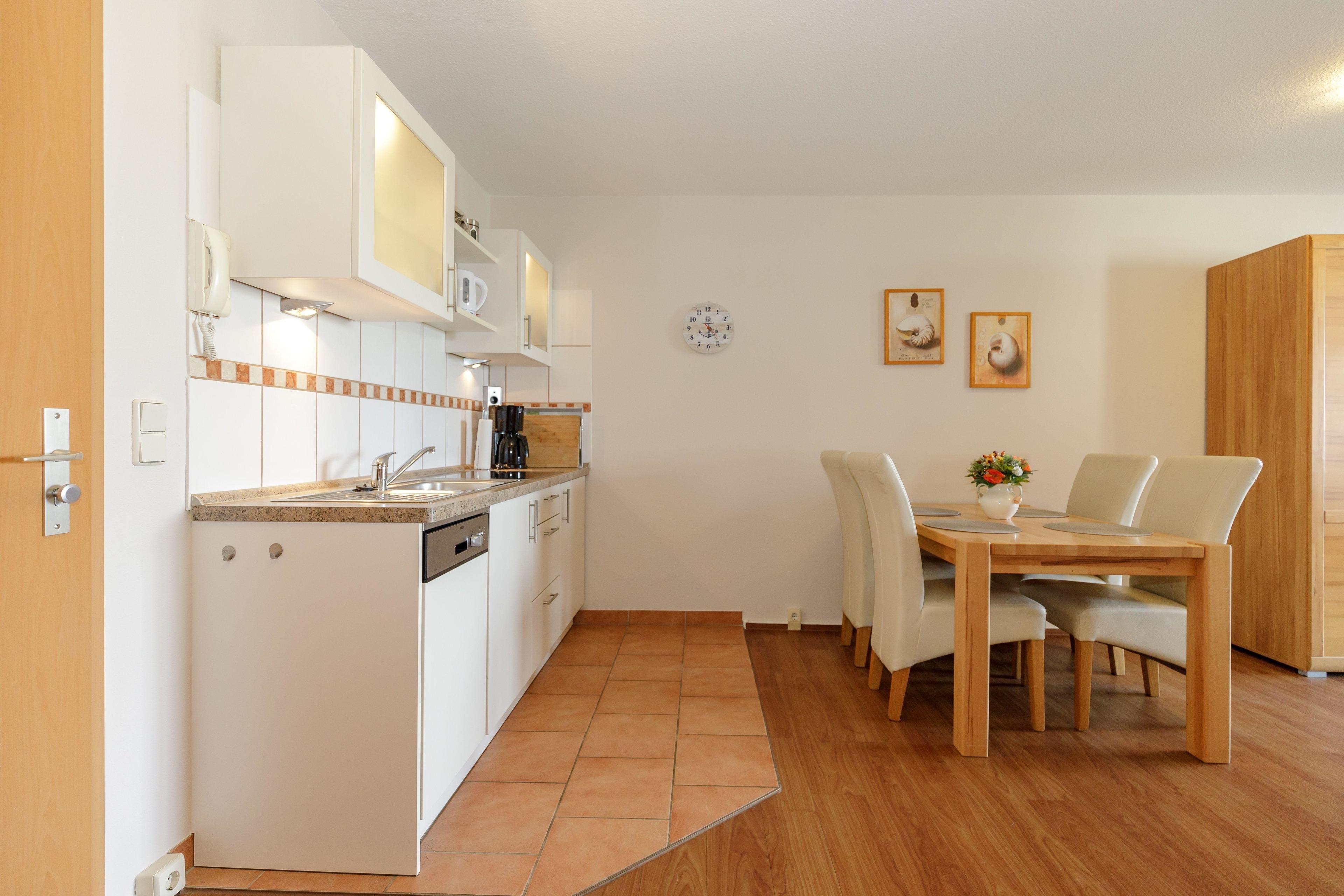 An den Wohnbereich grenzt die moderne und voll ausgestattete Küchenzeile. Vom Ceranfeld-Herd über Geschirrspüler, Kaffeemaschine, Toaster, Wasserkocher bis hin zu ausreichend Geschirr und Besteck.
