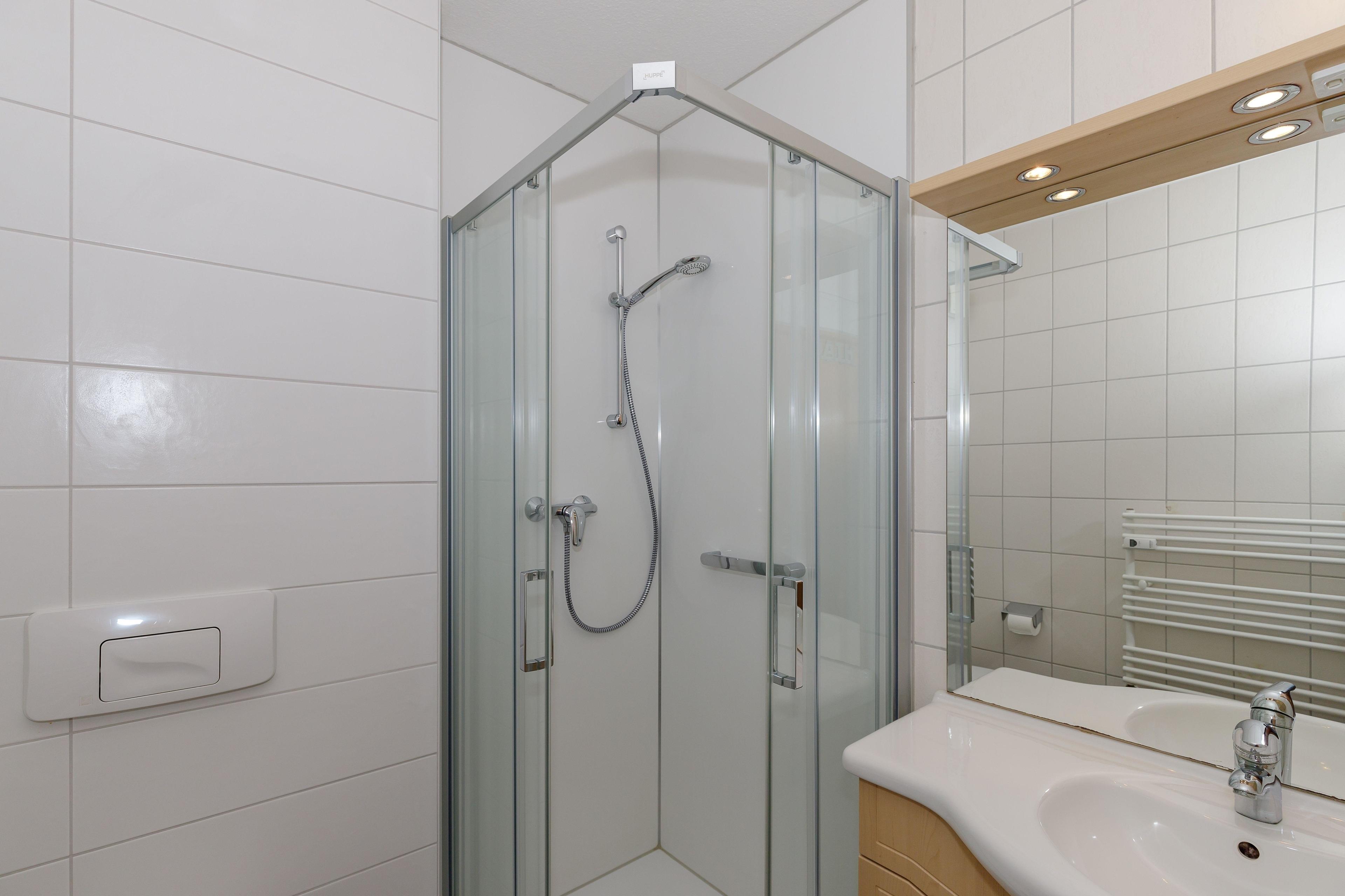 Das Badezimmer ist mit einer Dusche und WC ausgestattet; der moderne Badblock mit Waschtisch und großer Spiegelwand bietet in den Schränken genügend Platz für Ihre Badutensilien. Ein Föhn ist ebenfalls vorhanden.
