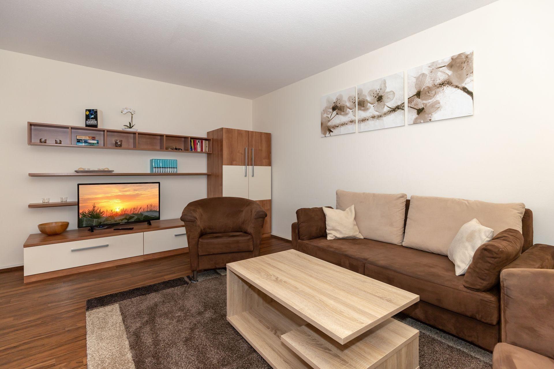Der komfortable Wohnbereich ist mit einer Sofa- und Sesselecke sowie einem Fernseher ausgestattet. Nach einem garantiert ereignisreichen Urlaubstag können Sie in diesem Bereich die Seele baumeln lassen.