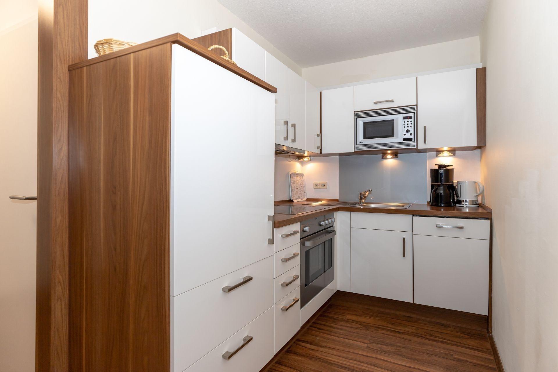An den Wohnbereich grenzt die Küche, welche voll ausgestattet ist mit allen erforderlichen Geräten sowie ein 4-Platten-Kochherd mit Ceranfeld und natürlich ausreichend Geschirr .