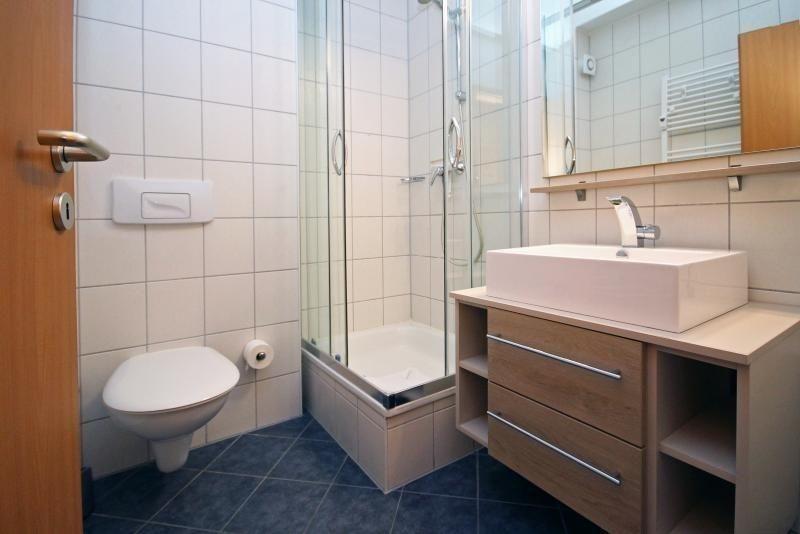 Das Badezimmer verfügt über eine Dusche, ein WC, einen Handtuchheizkörper sowie ein Waschbecken mit Unterschrank für Ihre Badutensilien.