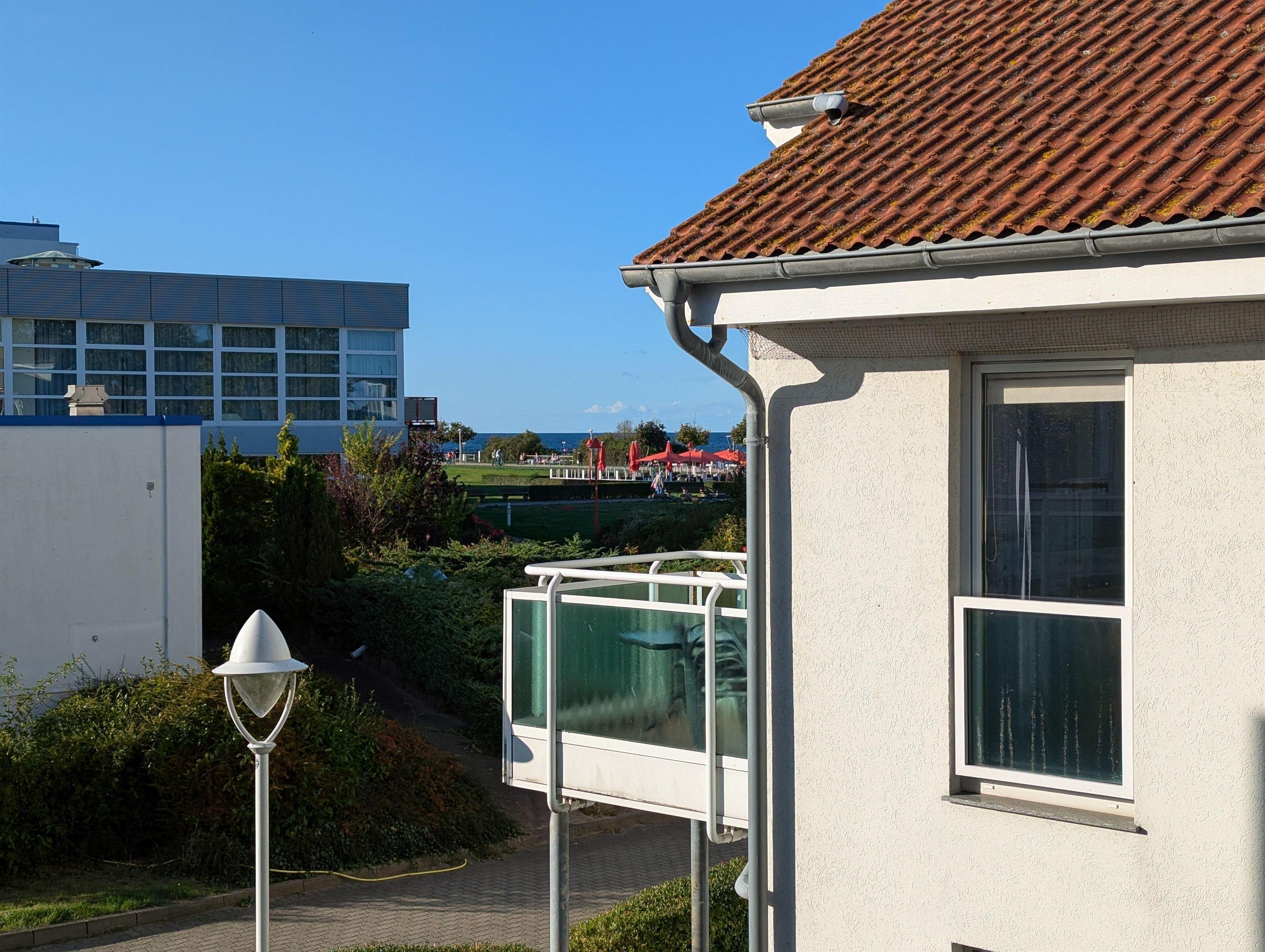 An Ihre Wohnung grenzt ein Balkon zur Nordseite, den Sie direkt von Ihrem Wohnzimmer aus betreten können. Ausgestattet mit Möbeln und einem Balkontisch, können Sie hier die Ostseeluft genießen und am Abend einen ereignisreichen Tag gemütlich ausklingen lassen.