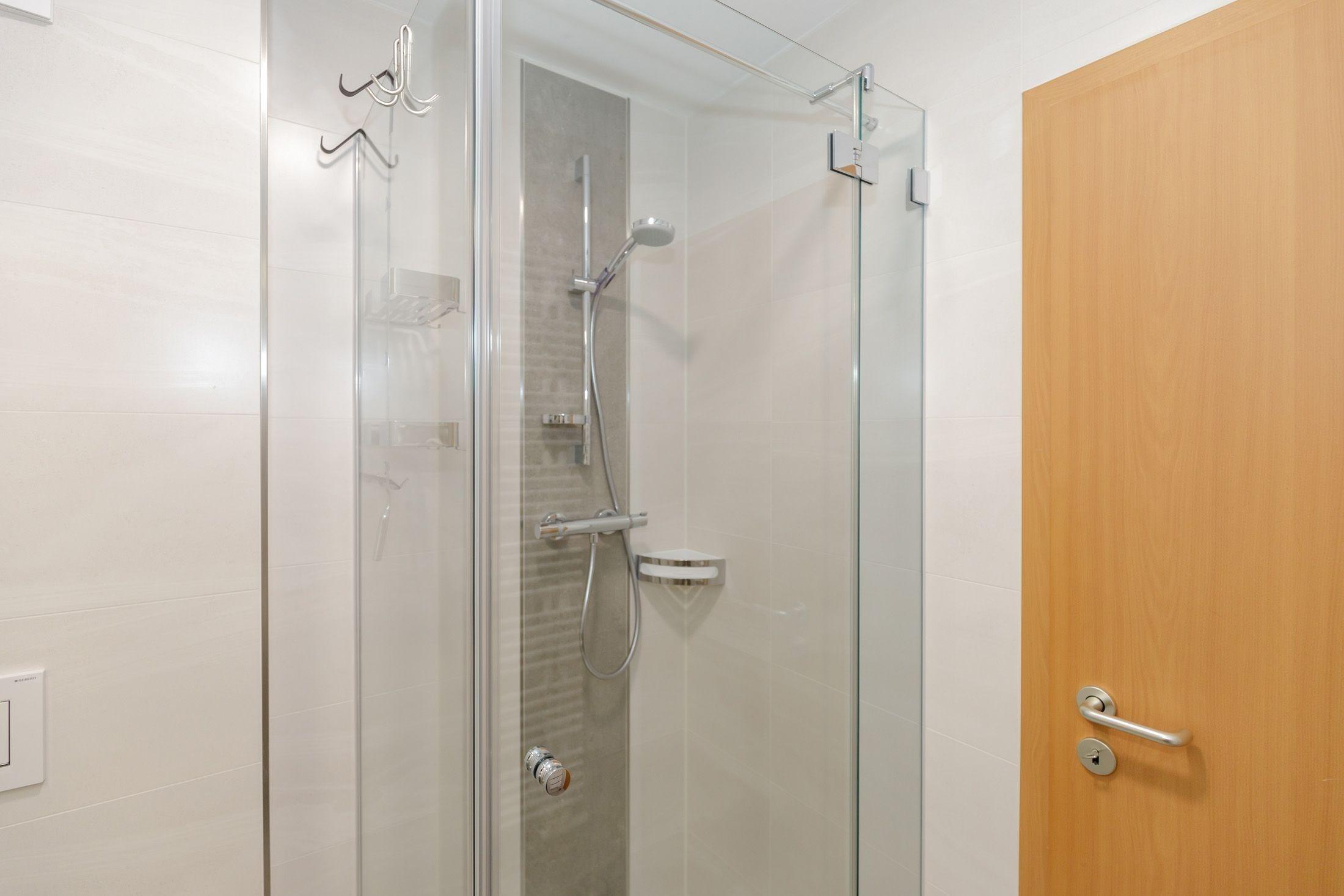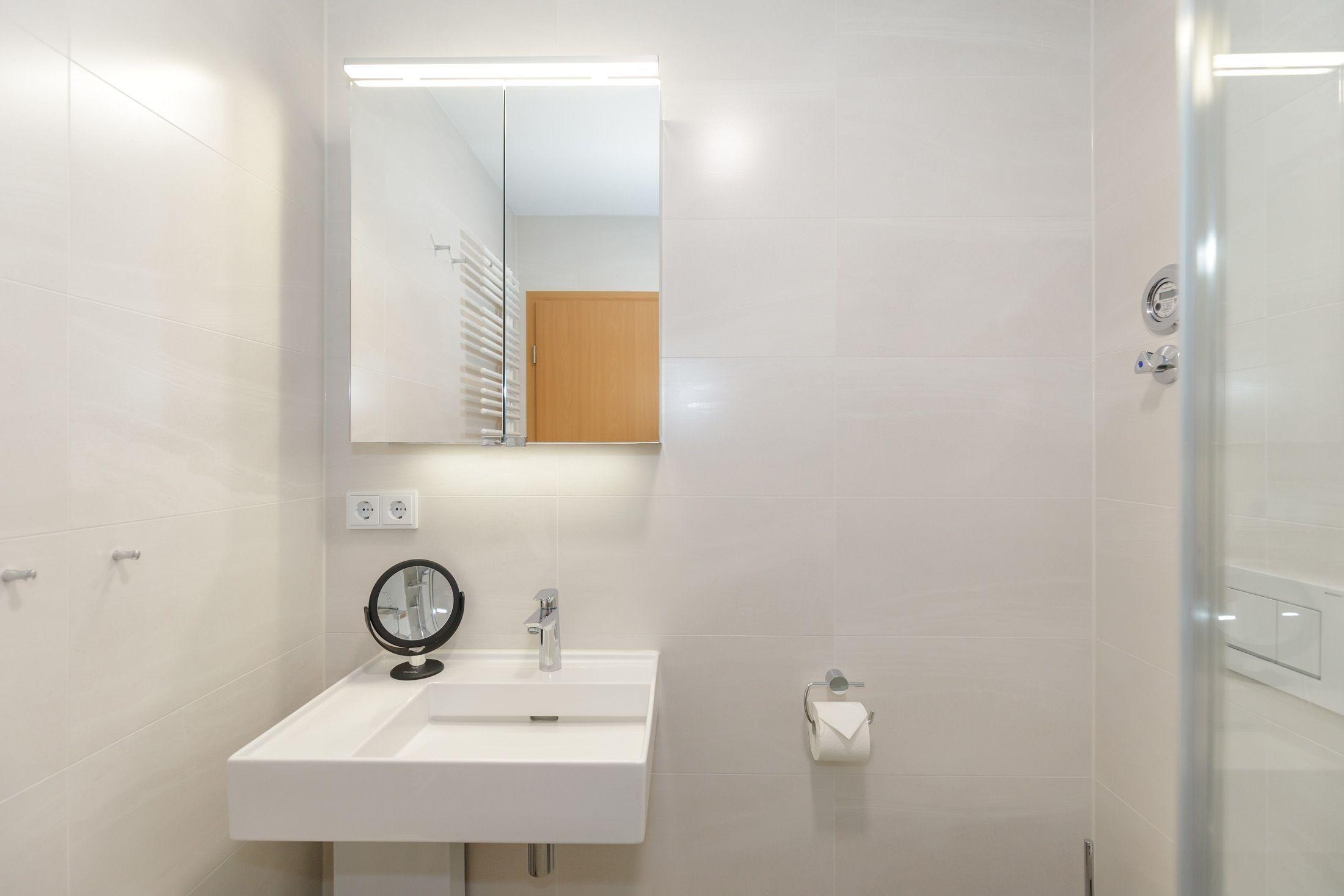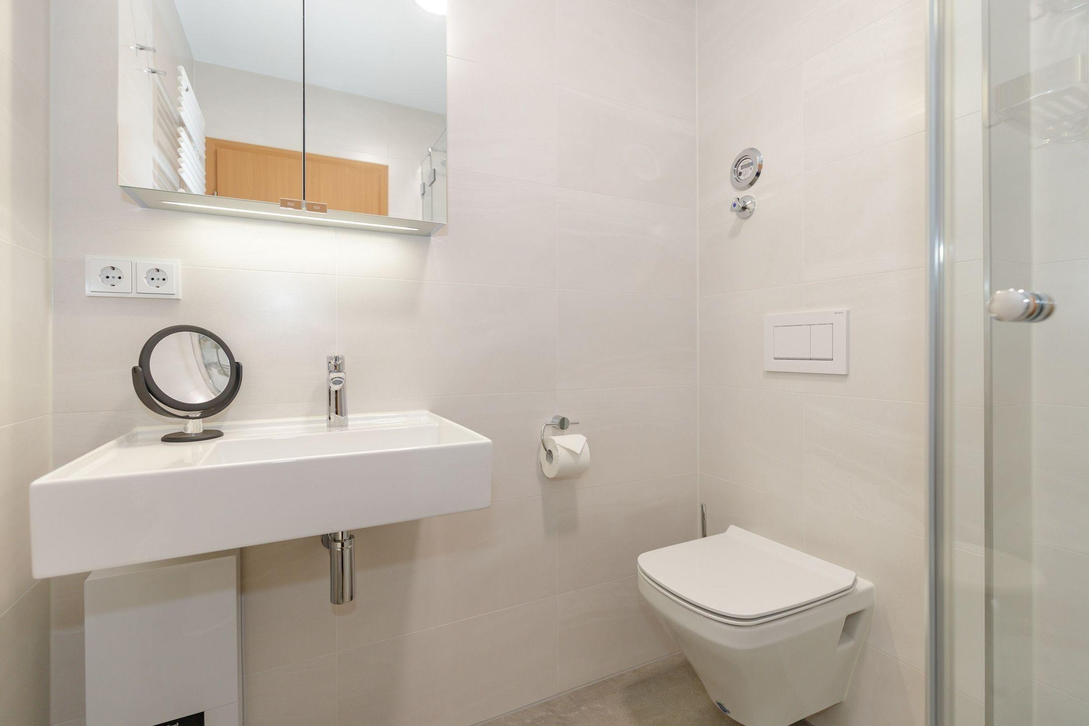Das hochwertige Badezimmer ist mit einer Dusche, einem Waschbecken und einem WC ausgestattet.