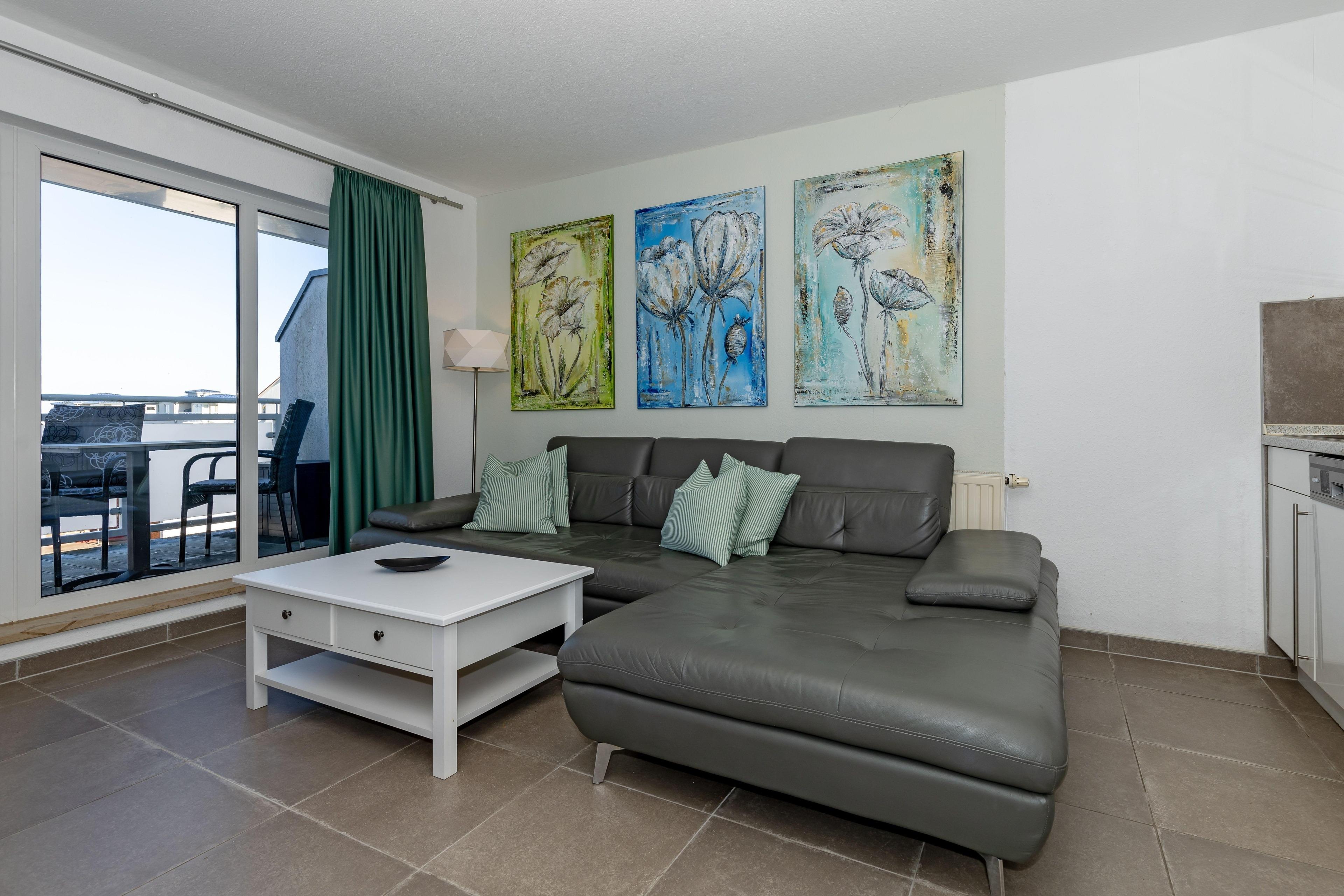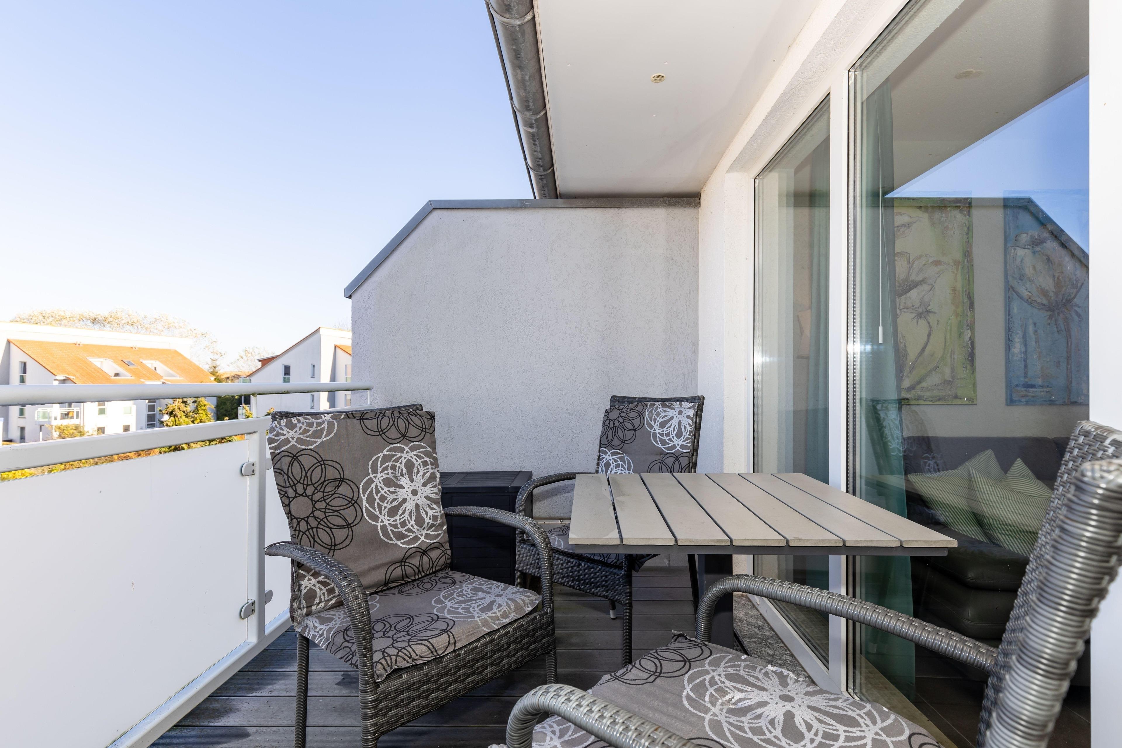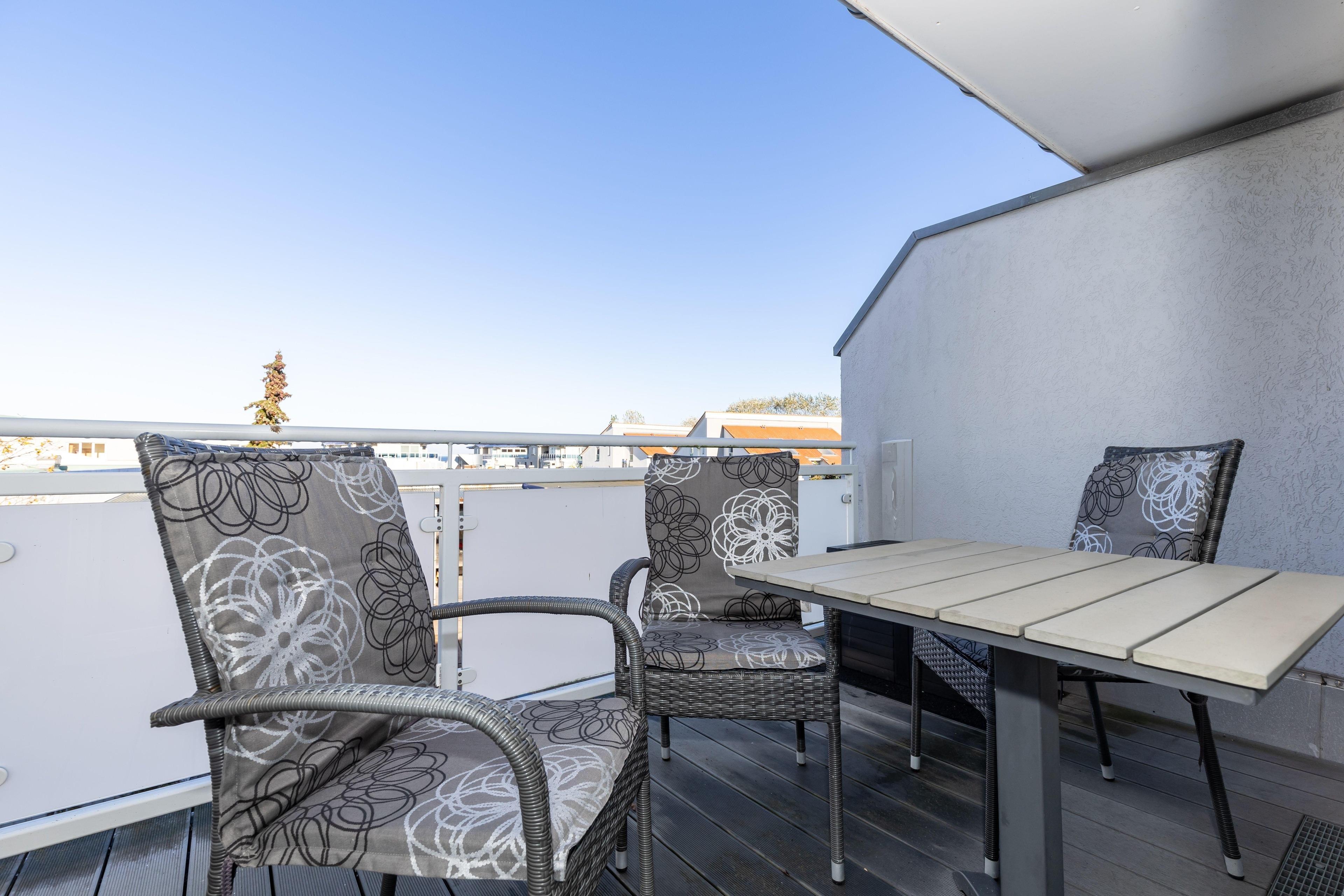 ein großzügiger Balkon mit modernen Balkonmöbeln lädt zum Entspannen ein. Hier können Sie die Seele baumeln lassen und am Abend gemeinsam einen ereignisreichen Tag bei einem leckeren Getränk Revue passieren lassen.
