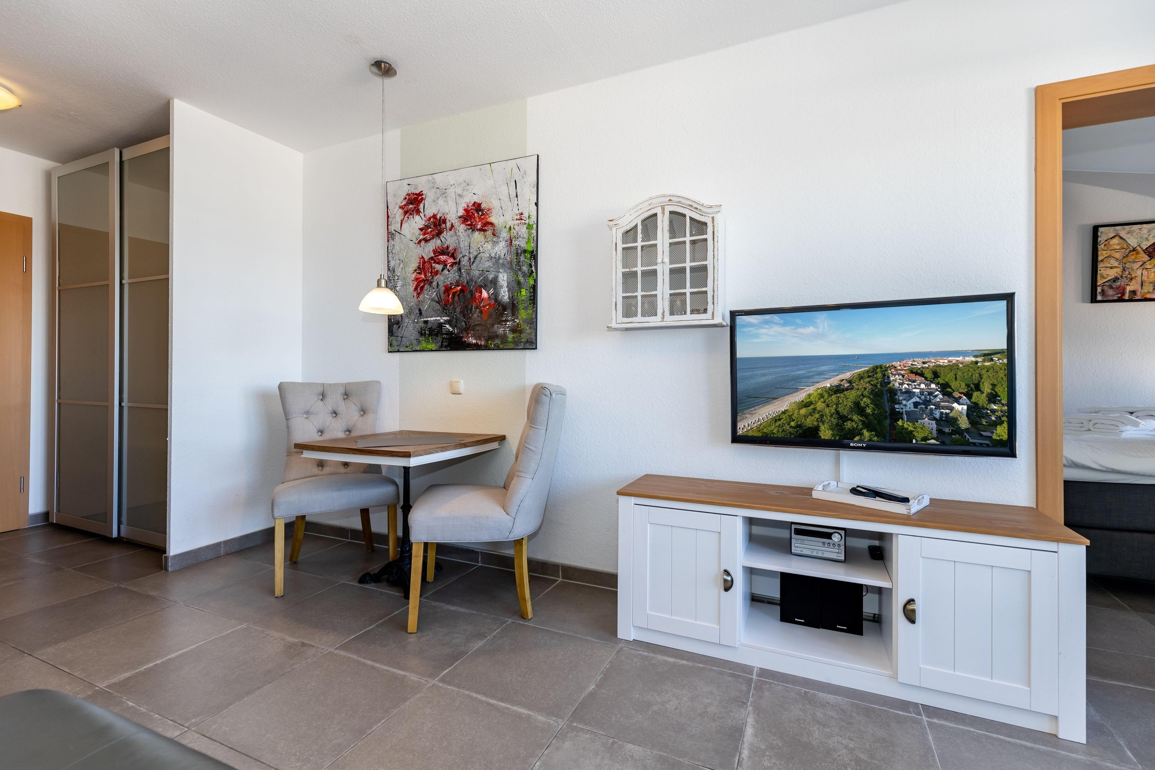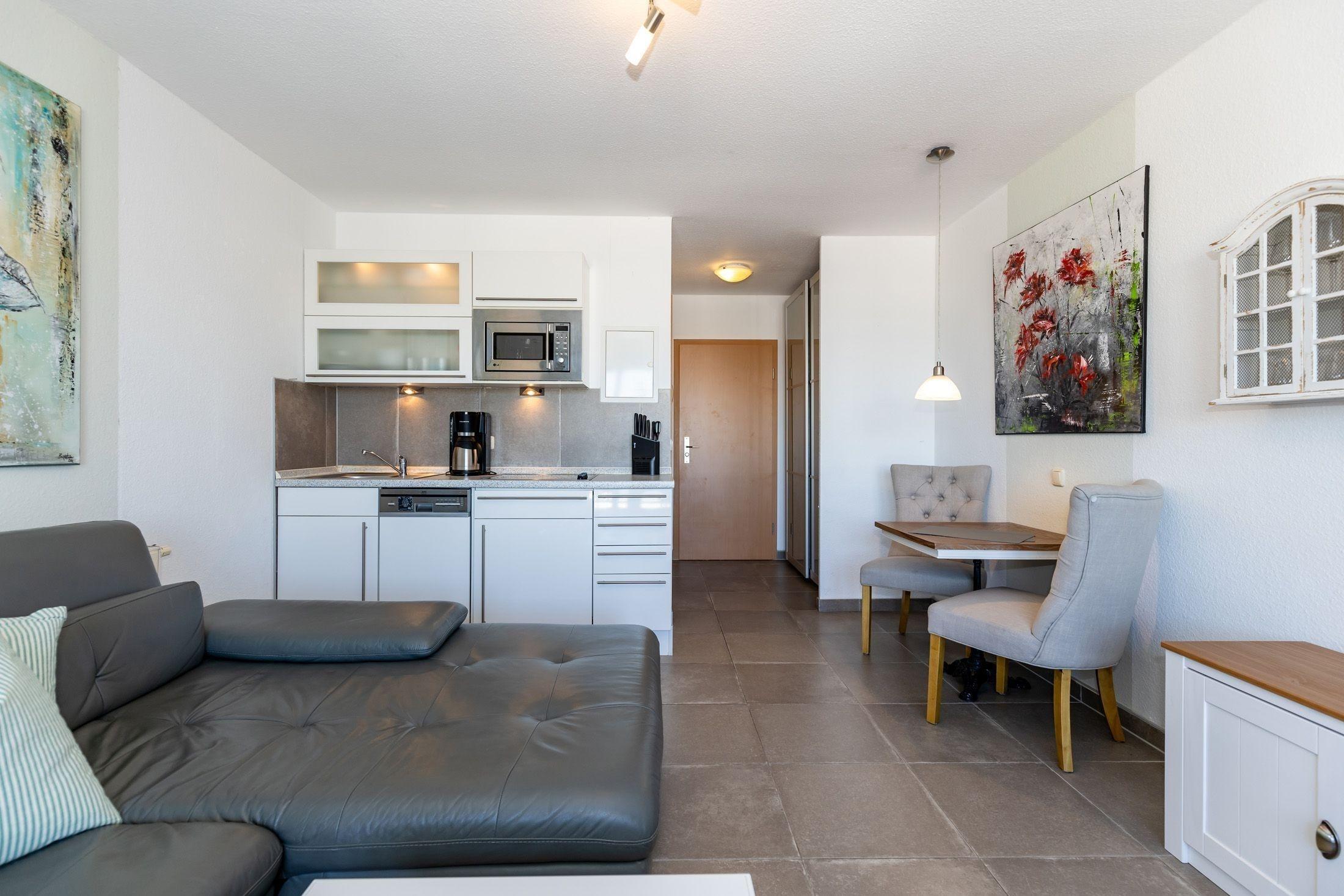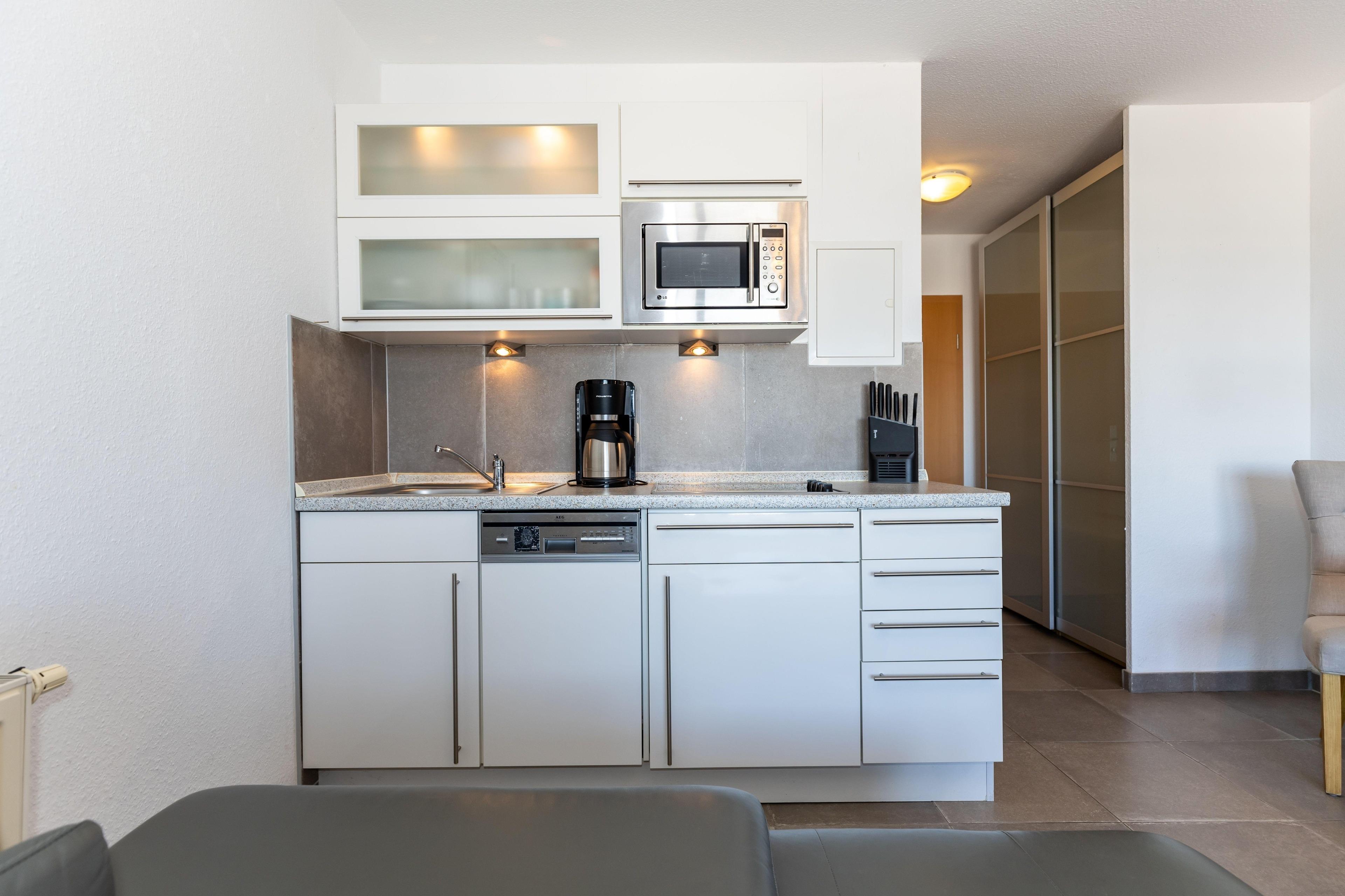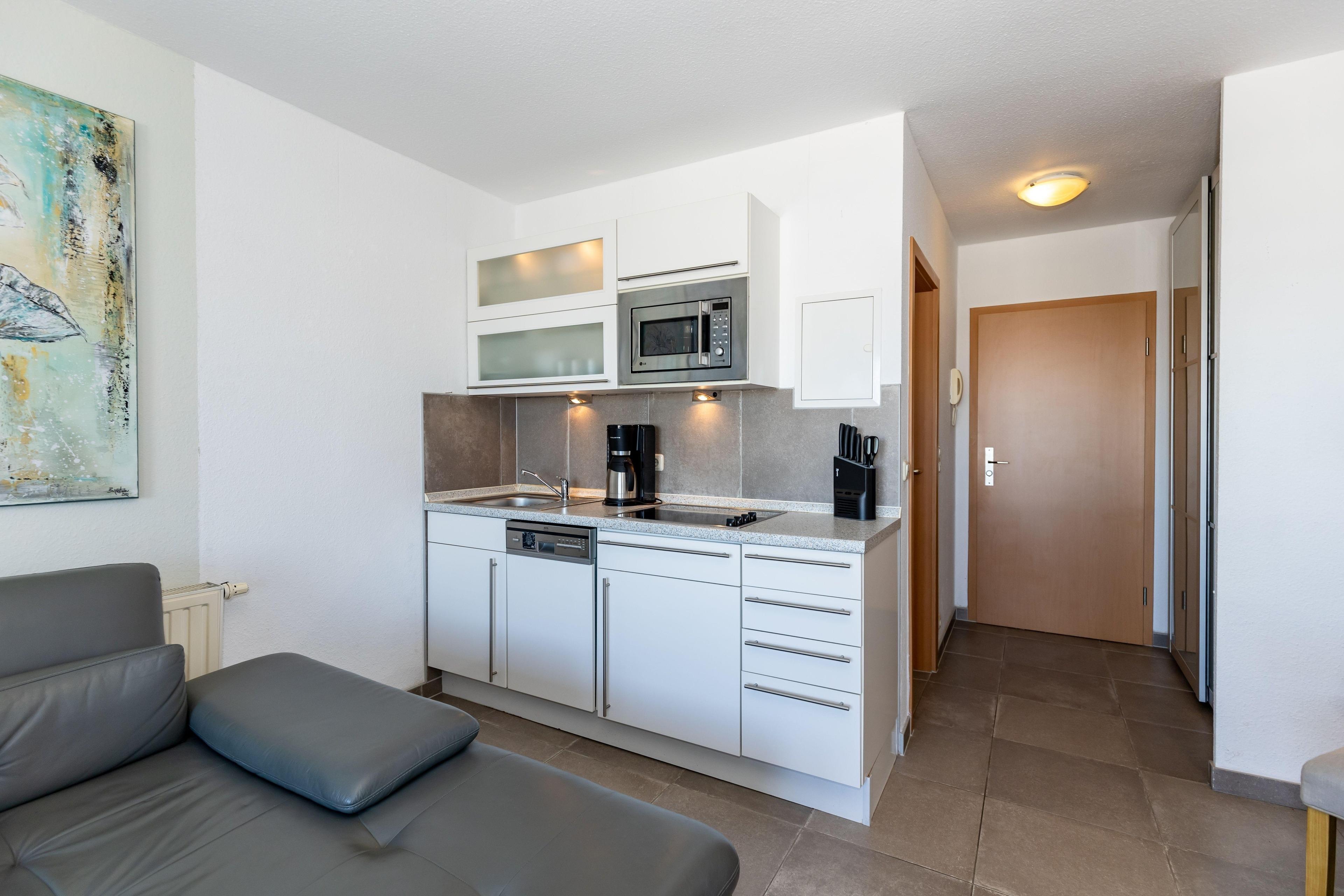 An den Wohnbereich grenzt die kleine, voll ausgestattete Küchenzeile, hier müssen Sie für die Zubereitung Ihrer Mahlzeiten auf nichts verzichten. Diese können Sie bequem am vorhandenen Esstisch einnehmen.