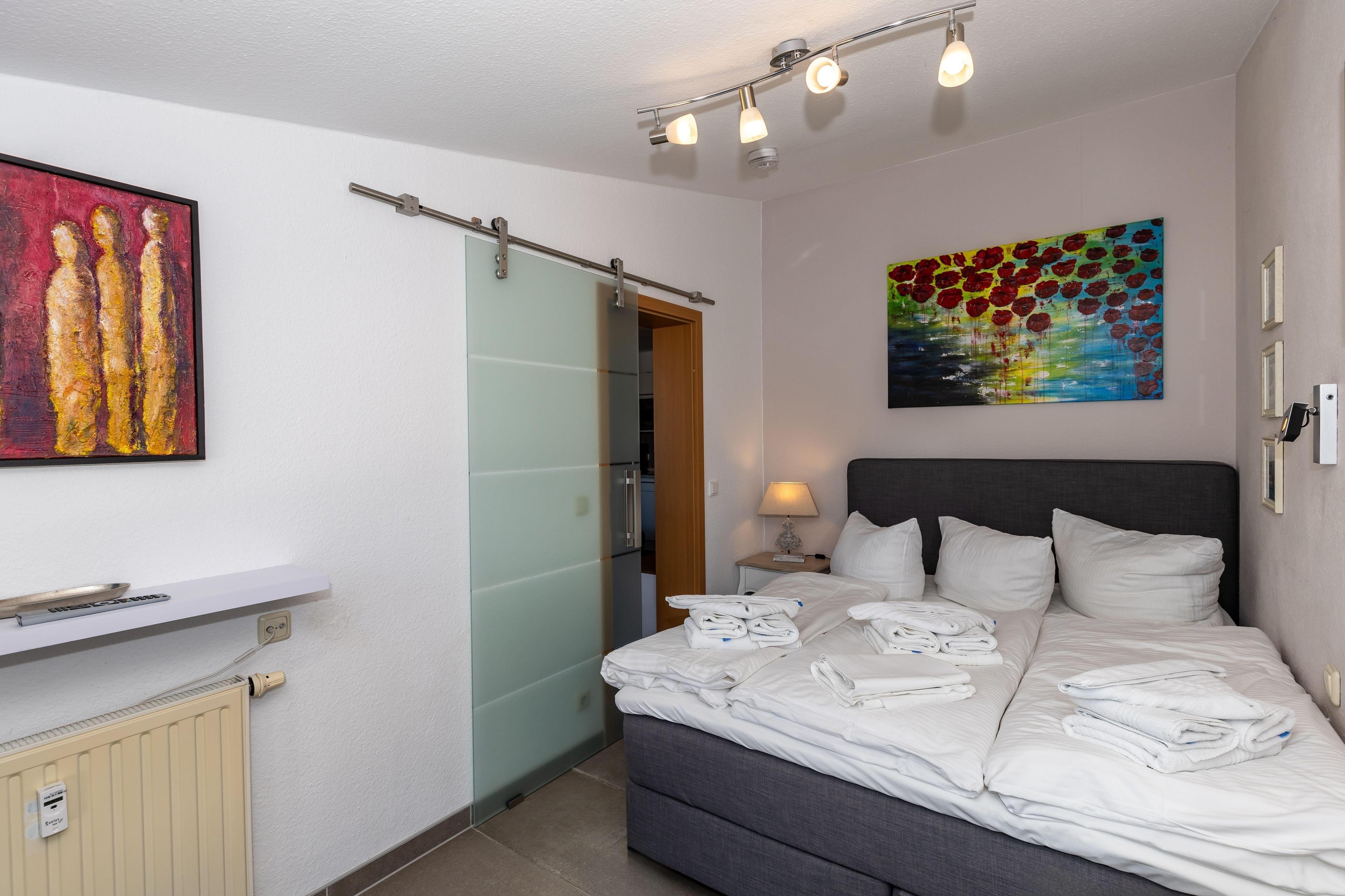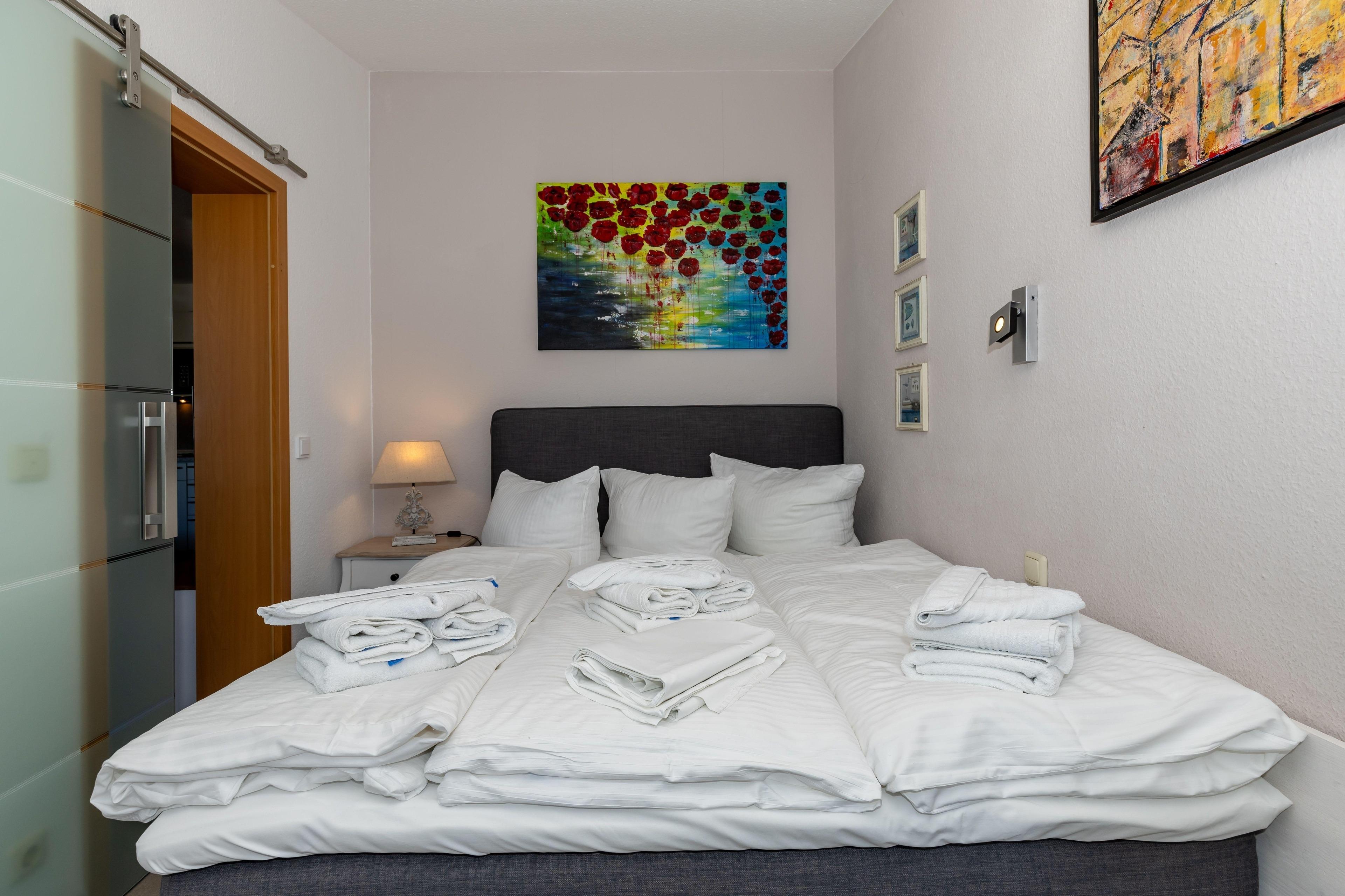 Das separate Schlafzimmer ist mit einem bequemen Doppelbett eingerichtet. Ein geräumiger Kleiderschrank sorgt für die Unterbringung Ihrer Urlaubsgarderobe. Ein hübscher Sekretär rundet das gemütliche Ambiente in diesem Bereich ab.