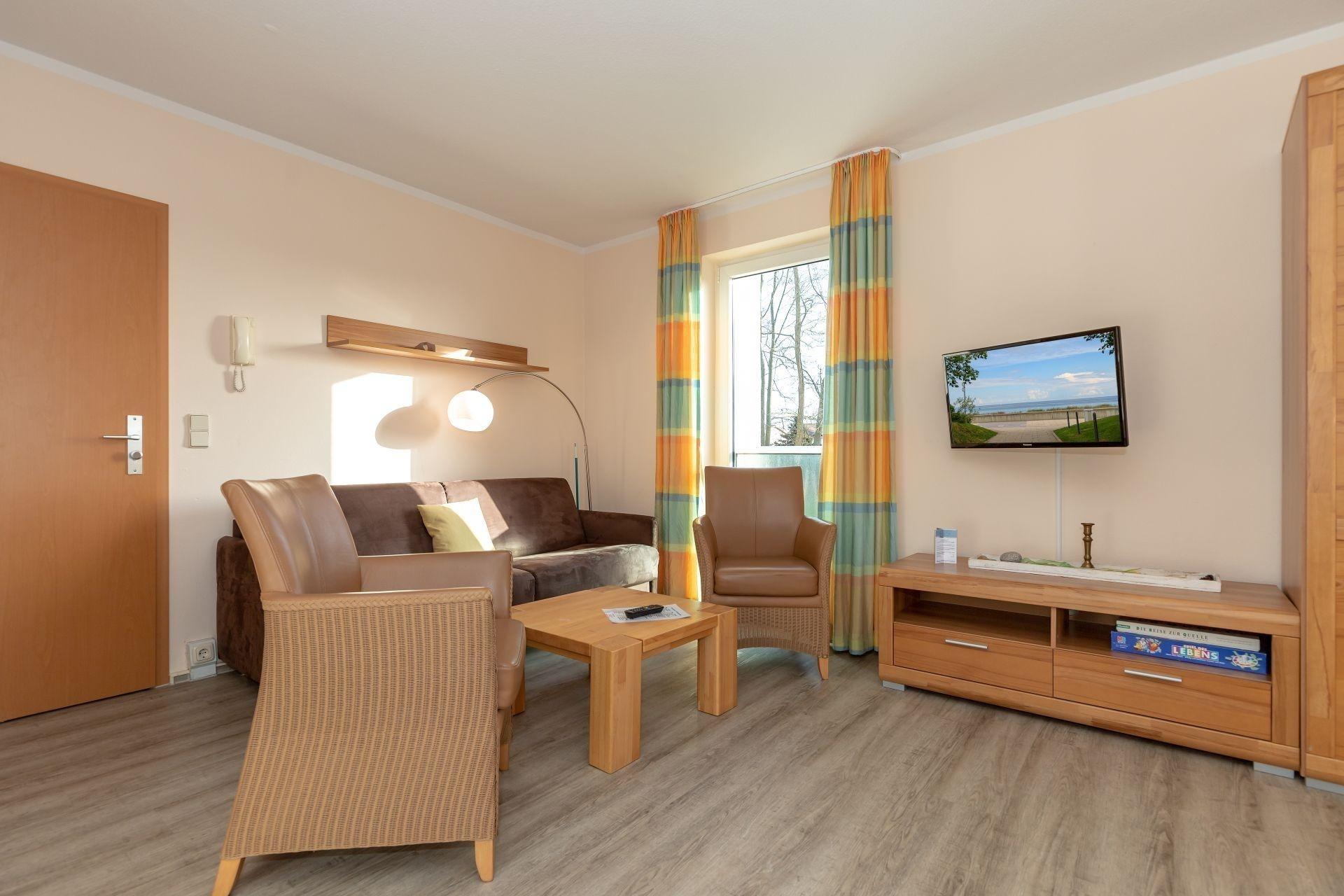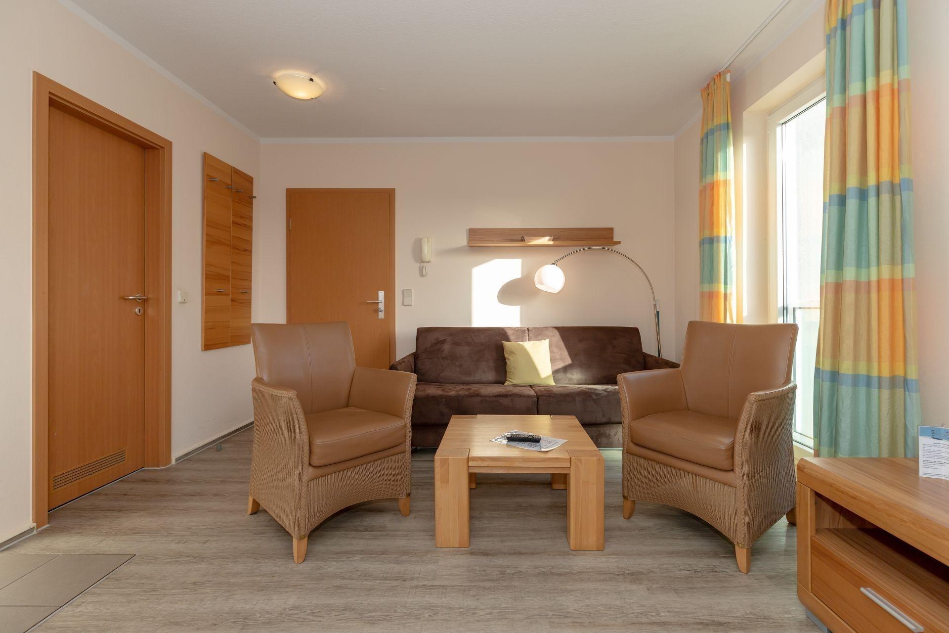 Der ansprechende Wohnbereich ist mit einer Sofa- und einer Sesselecke eingerichtet. Das Sofa ist ausziehbar, sodass hier ein Schlafplatz für 2 Personen entsteht. In diesem Bereich können Sie gemütlich zusammensitzen und Ihre Urlaubstage in vollen Zügen genießen. Zur Ihrer Unterhaltung steht Ihnen ein Flachbildschirm-TV zur Verfügung.