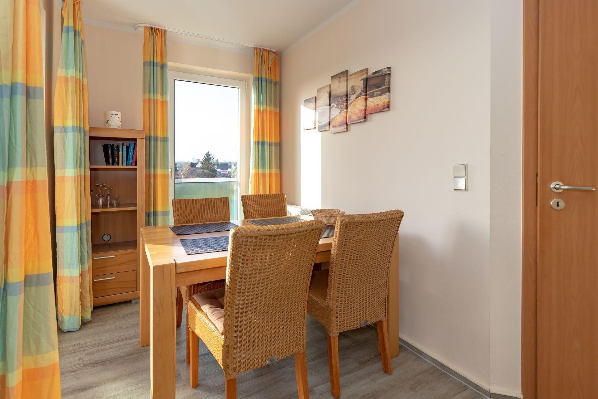 Im Anschluss an den Wohnbereich grenzt ein Esstisch mit 4 Stühlen für Ihre gemeinsamen Mahlzeiten. Diese können Sie in der kleinen, aber voll ausgestatteten Küchenzeile herrichten. Es stehen Ihnen alle Bequemlichkeiten einer modernen Küche zur Verfügung.