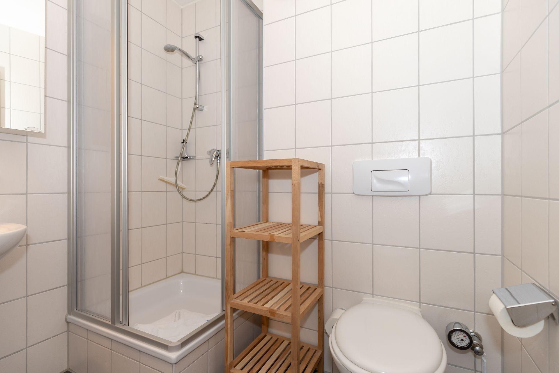 Das Badezimmer ist mit einer Dusche, einem Waschbecken und einem WC ausgestattet.