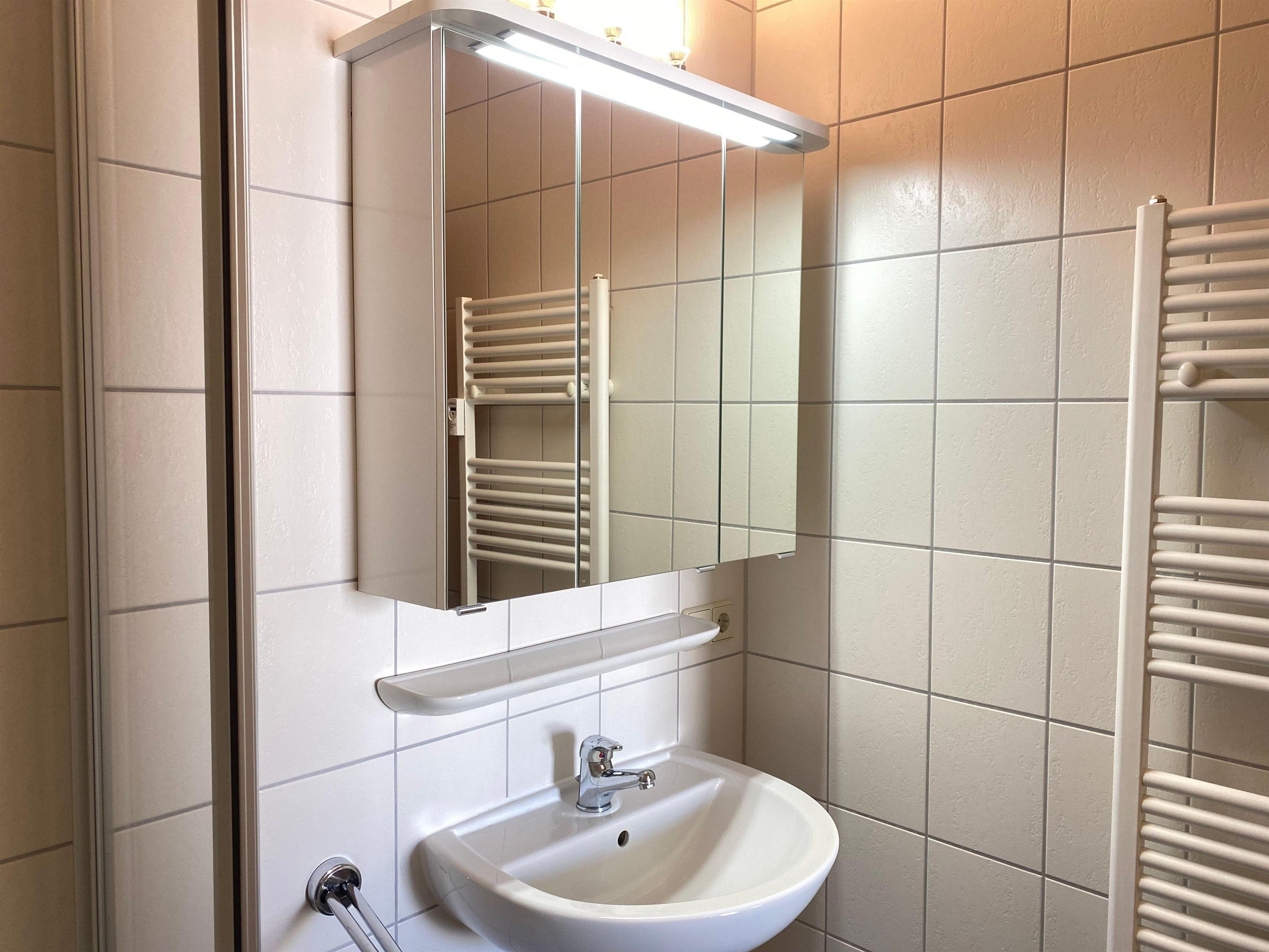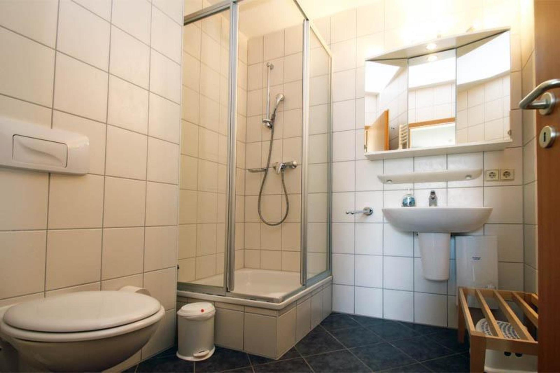 Das Badezimmer ist mit einer Dusche, einem Waschbecken und einem WC ausgestattet.