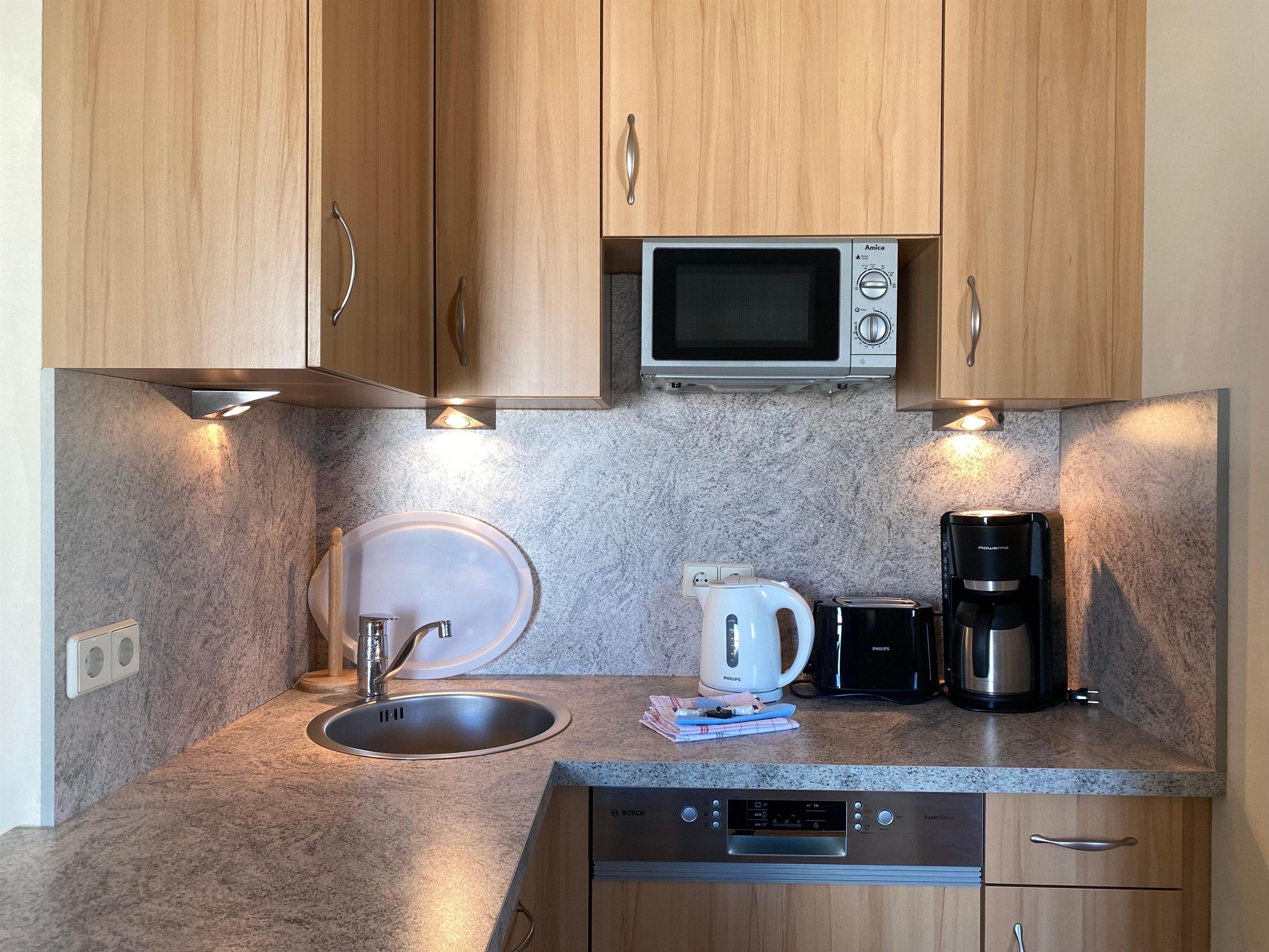 An den Wohnbereich grenzt die kleine, voll ausgestattete Küchenzeile, schnell und bequem können Sie hier Ihre Lieblingsmahlzeit zaubern.