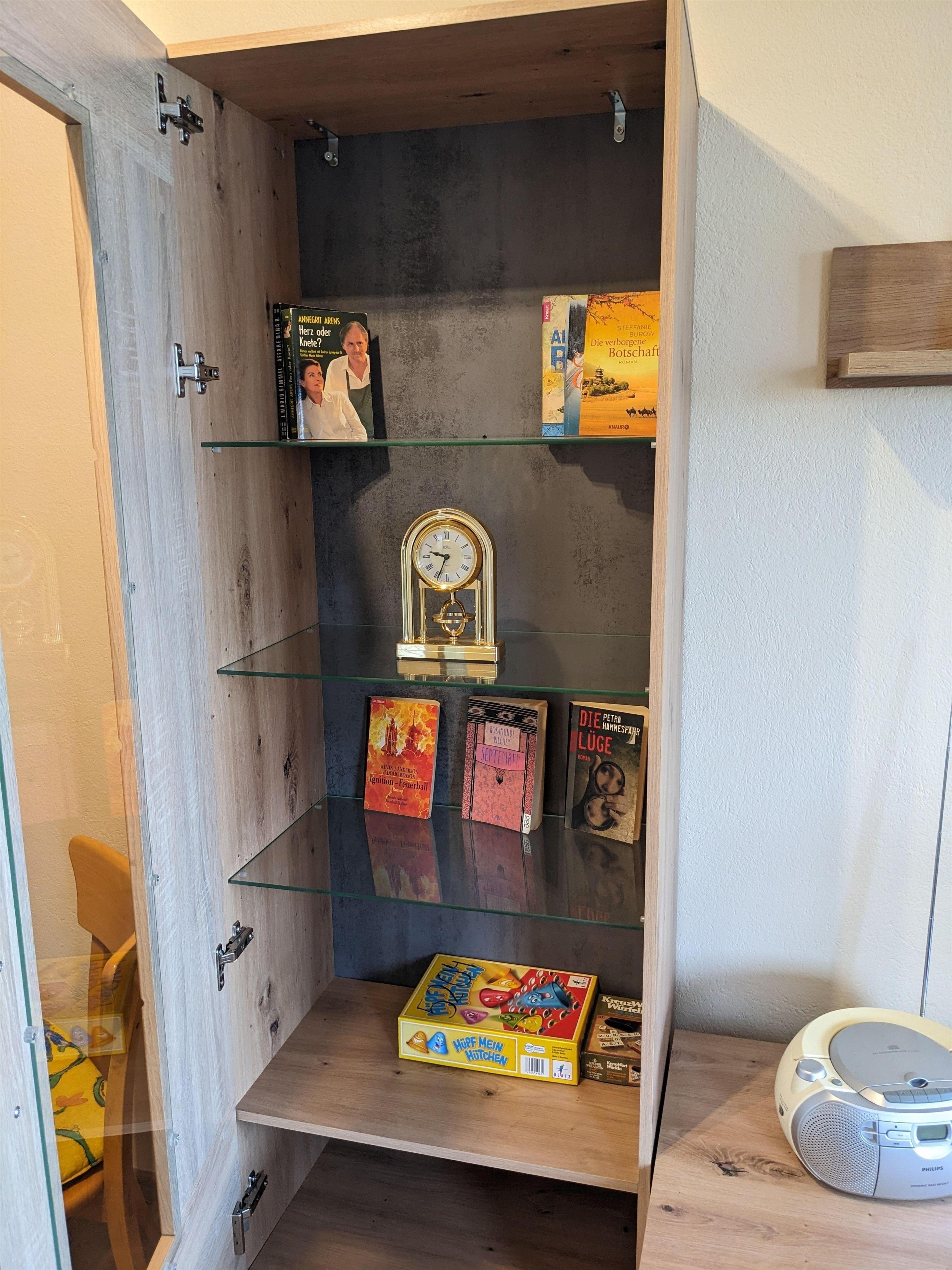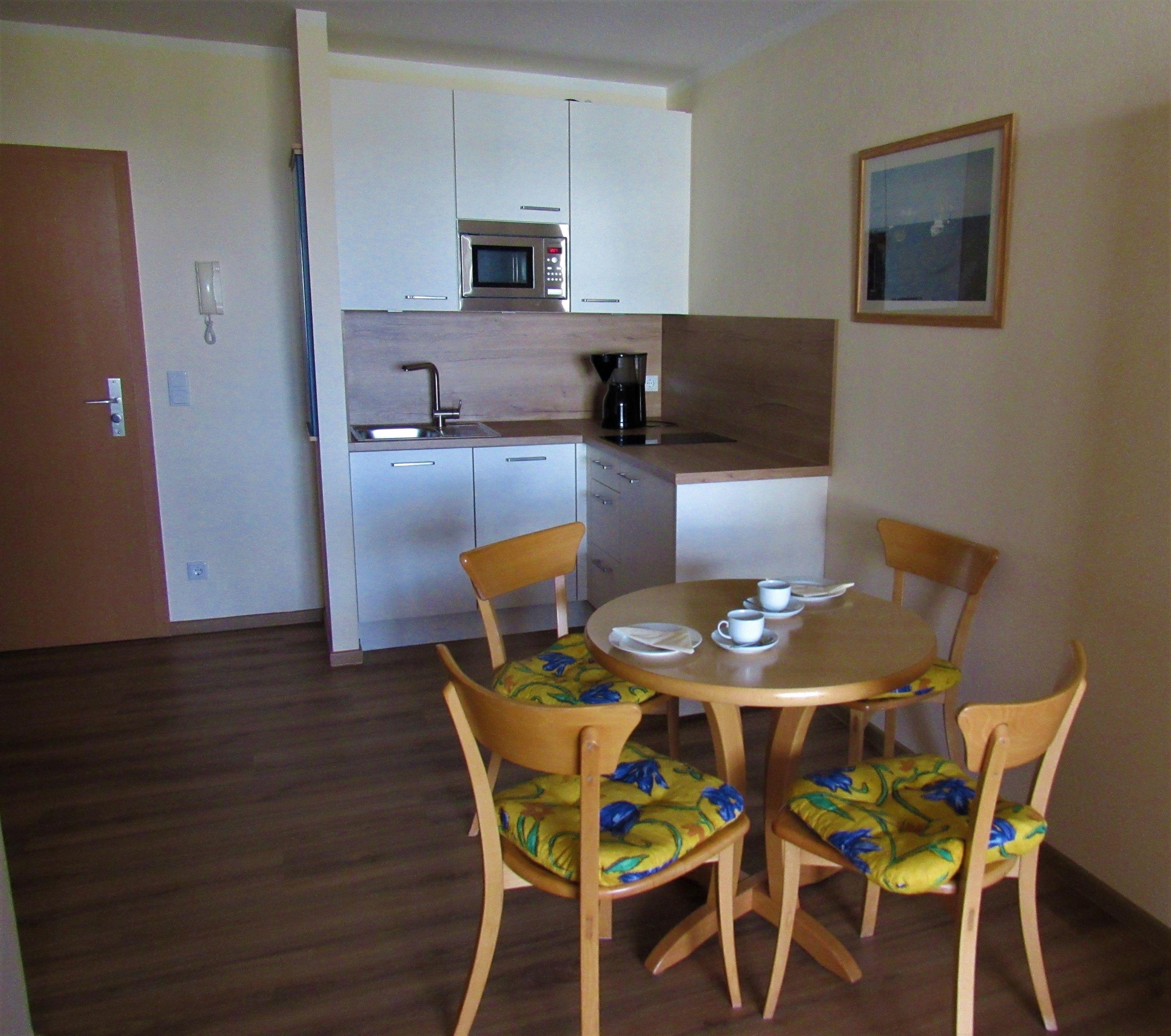 An das Wohnzimmer grenzt der Küchen-/Essbereich. Die kleine Küchenzeile ist voll ausgestattet, hier müssen Sie auf nichts verzichten. Am Esstisch mit 4 Stühlen können die gemeinsamen Mahlzeiten eingenommen werden.