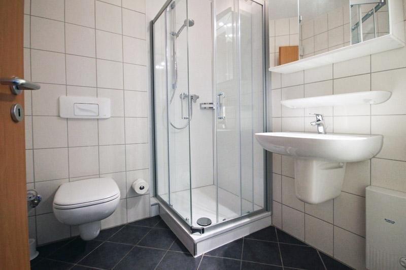 Das Badezimmer ist mit einer Dusche, einem Waschbecken und einem WC ausgestattet.