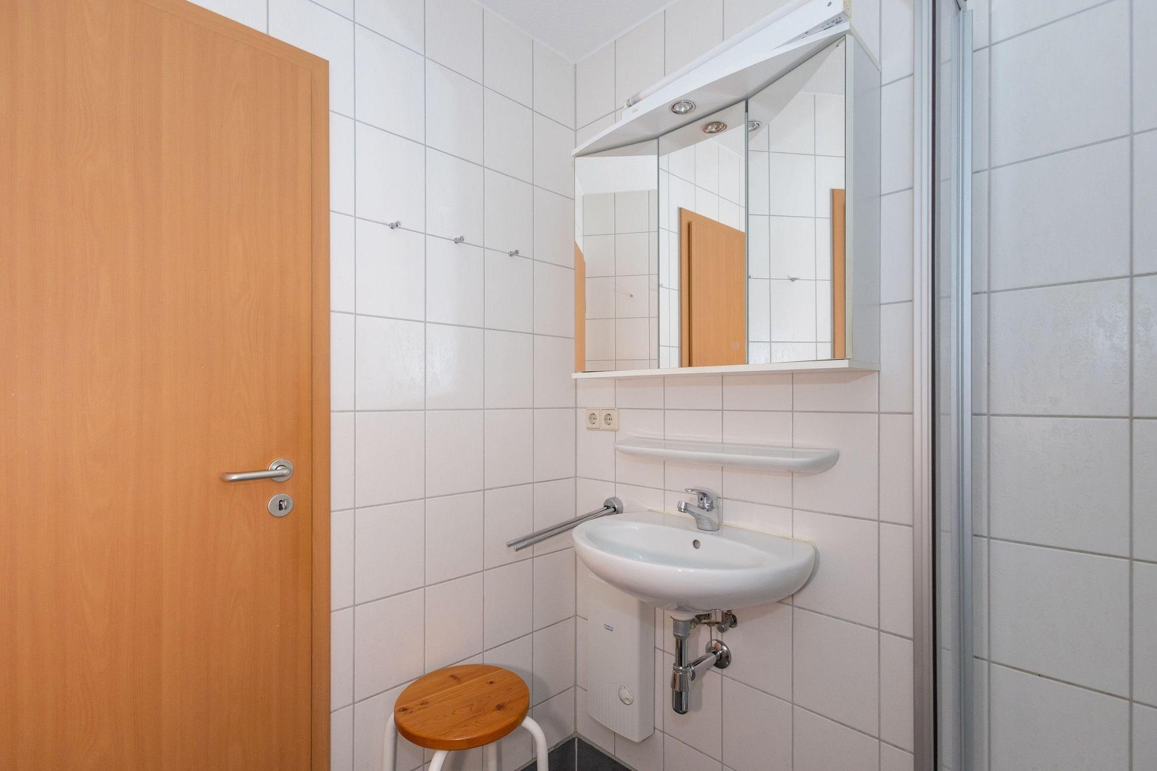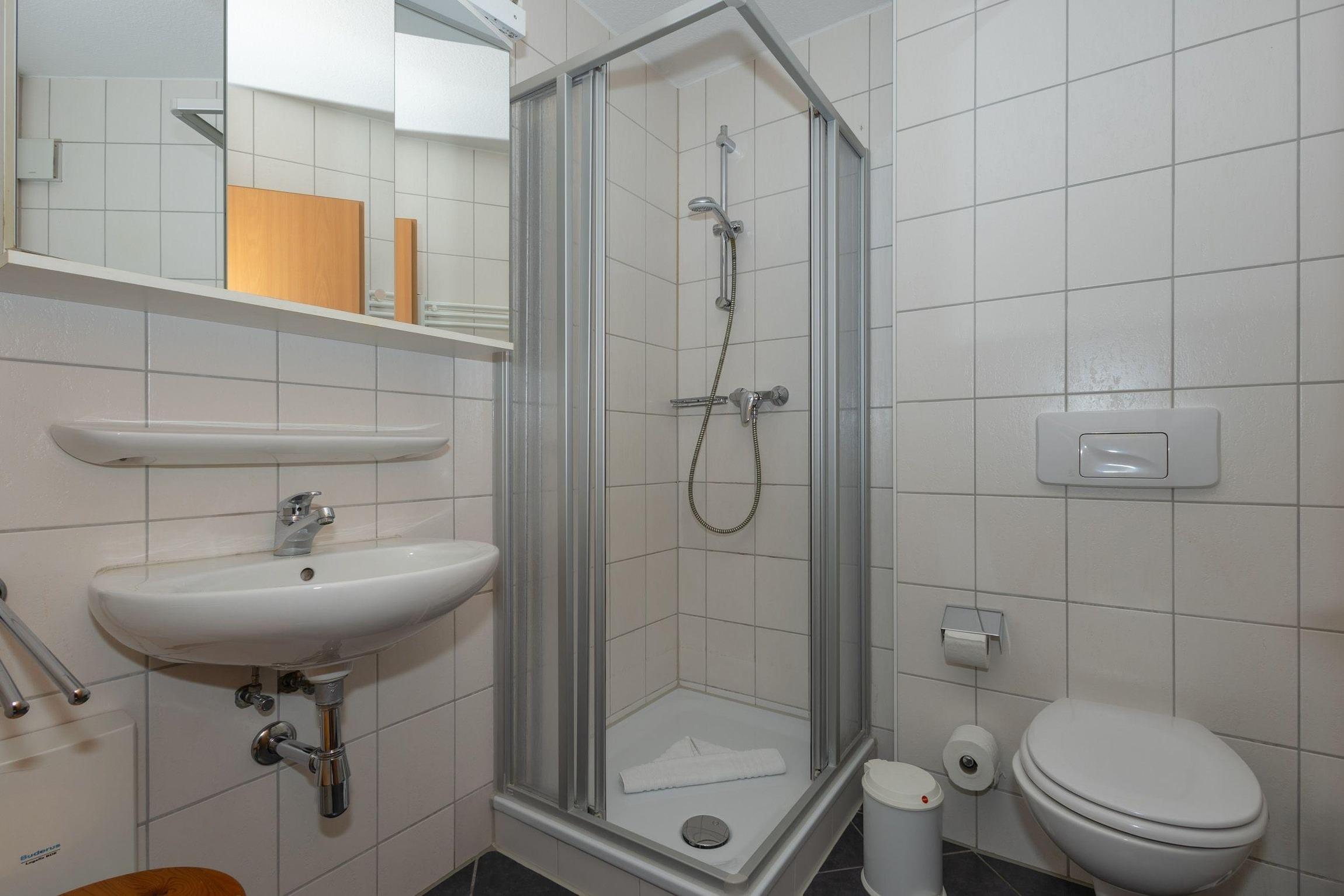 Das Badezimmer ist mit einer Dusche, einem WC, einem Waschbecken und einem Handtuchheizkörper ausgestattet.