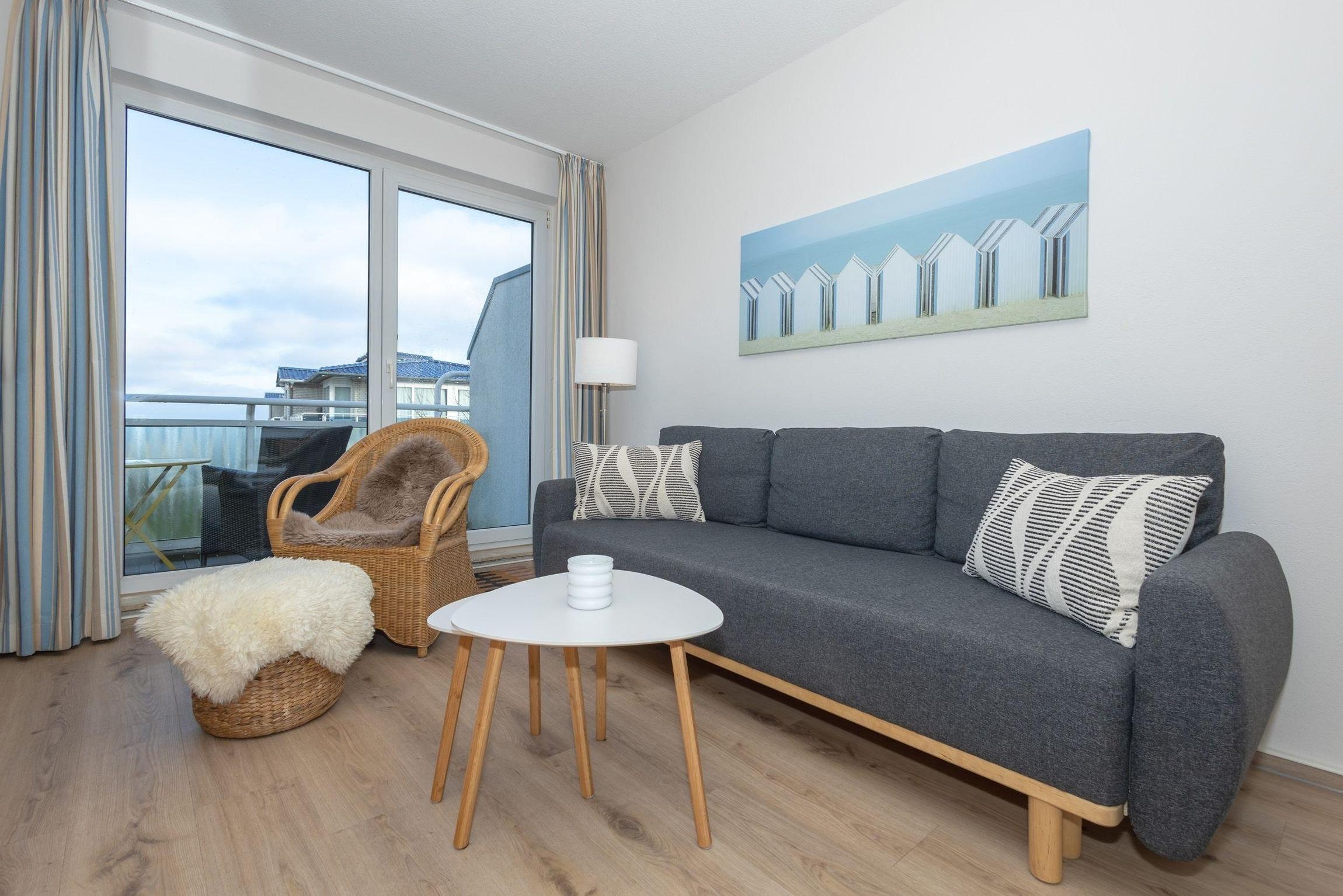 An Ihre Wohnung grenzt ein Balkon zur Nordseite mit Meerblick. Mit hübschen Möbeln ausgestattet, lädt der Balkon zum gemeinsamen Verweilen ein, so können Sie ein wenig Sonne genießen und bei einem leckeren Getränk am Abend einen ereignisreichen Tag gemütlich ausklingen lassen.