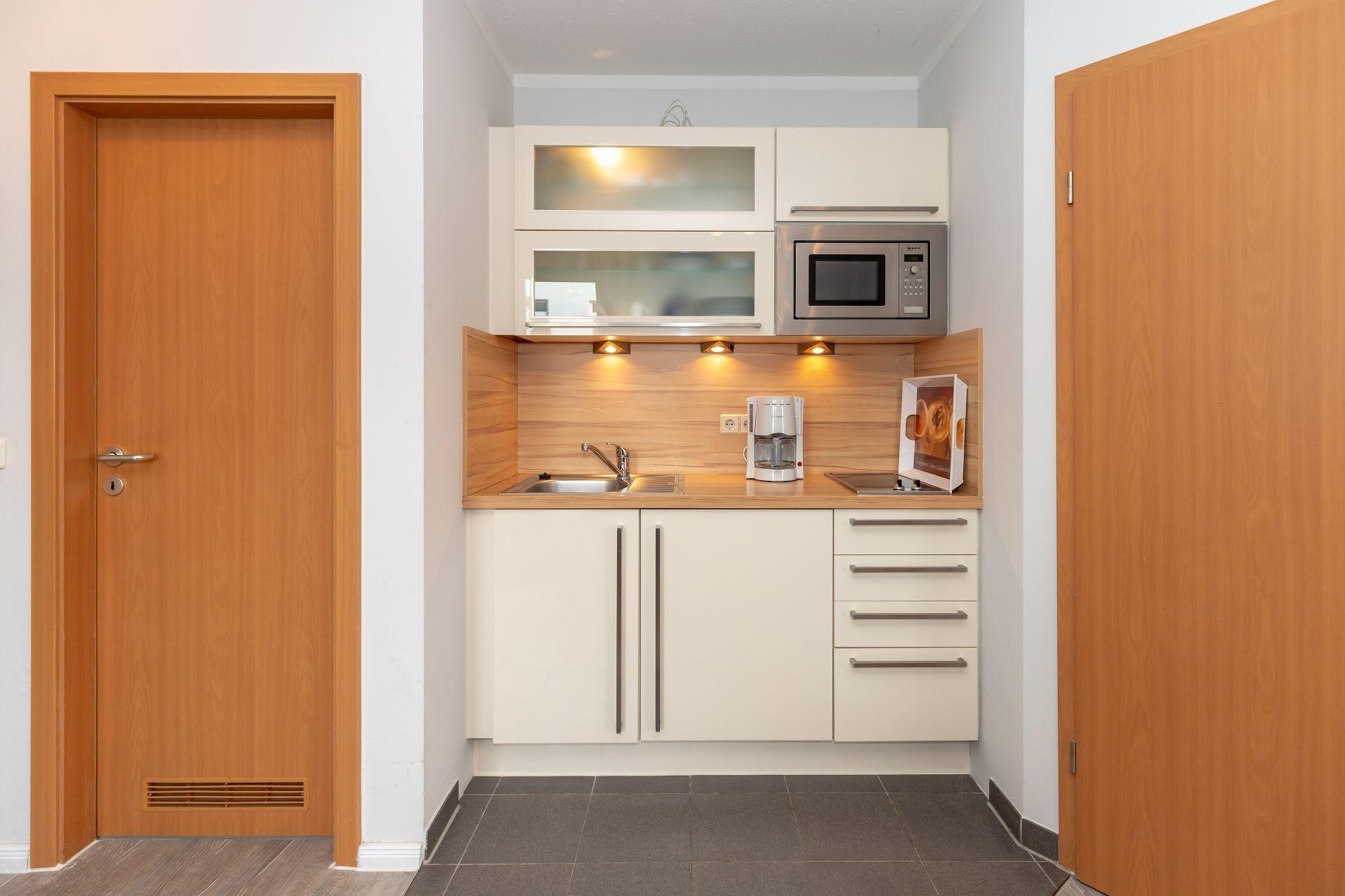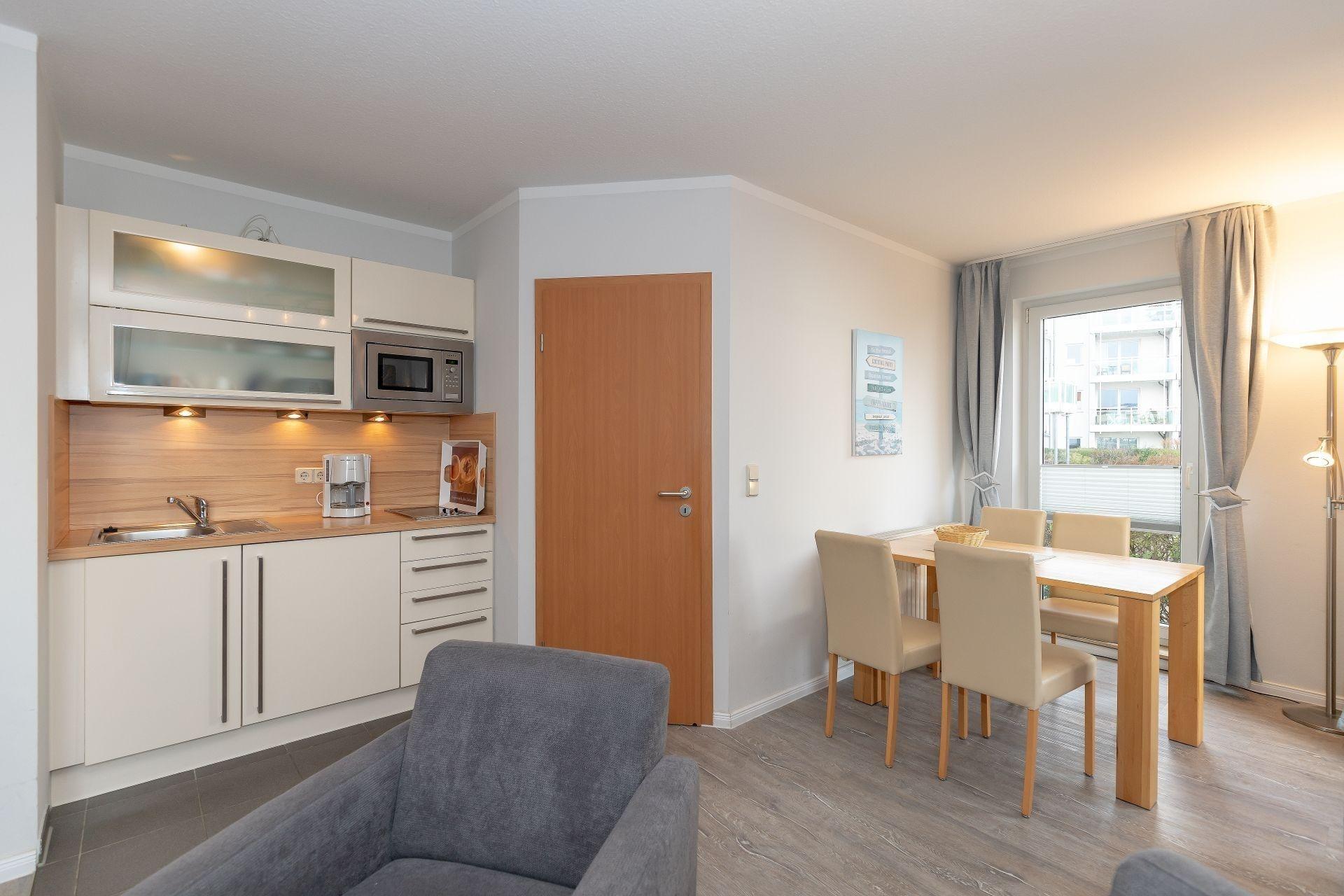 An den Wohnbereich grenzt die kleine Küchenzeile, welche voll ausgestattet ist. Schnell und einfach haben Sie hier Ihre Mahlzeiten zubereitet, die Sie am angrenzenden Esstisch einnehmen können.