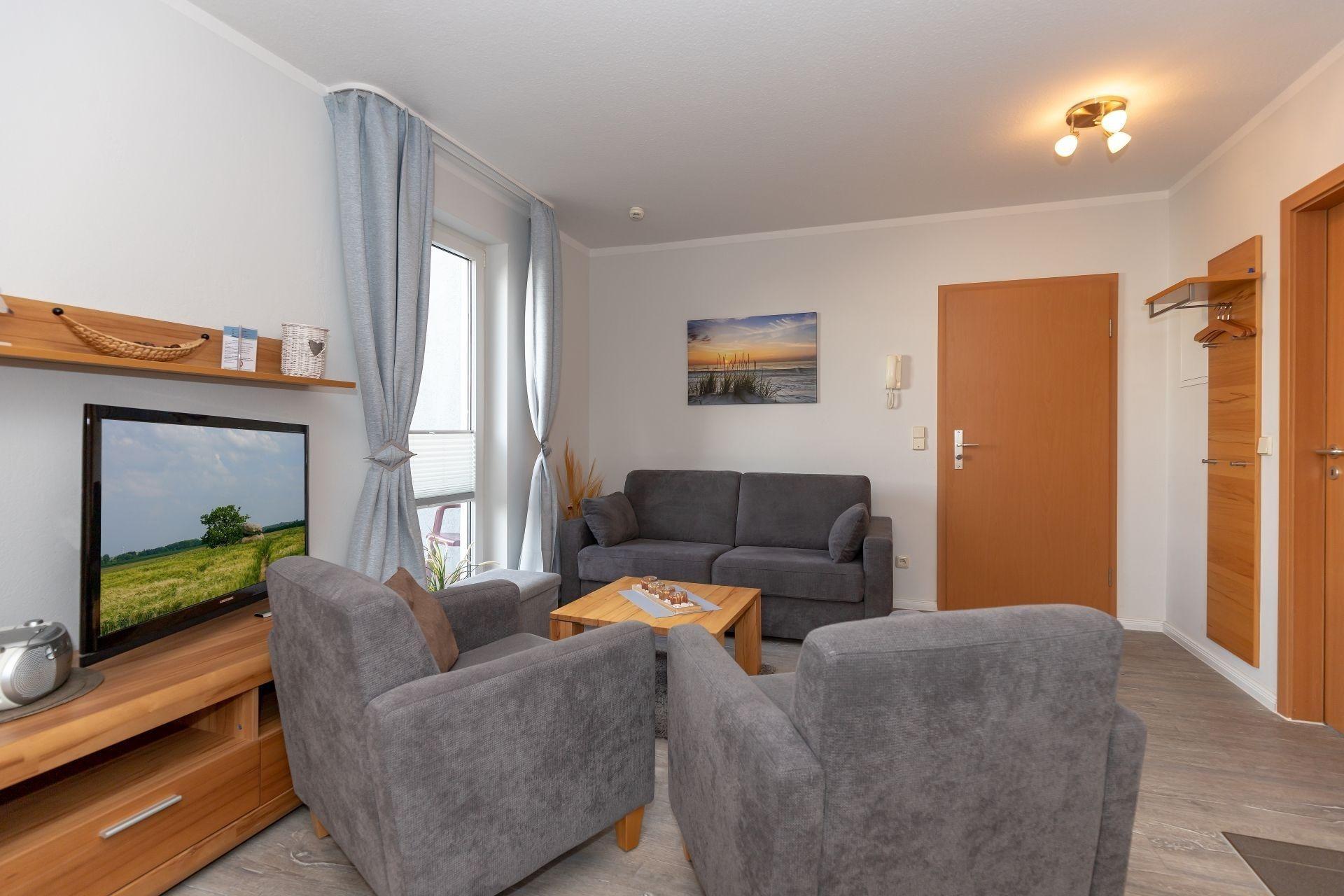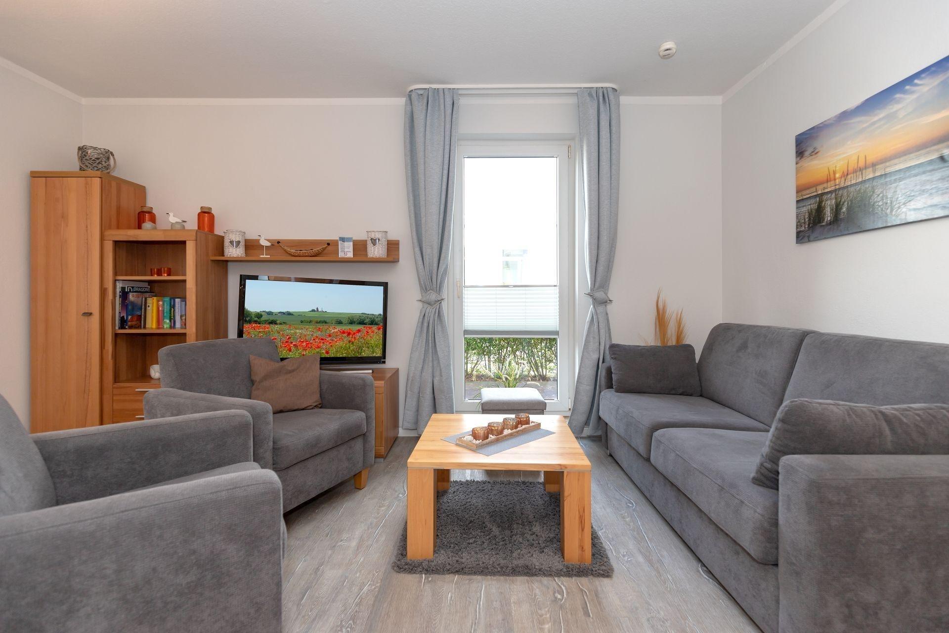 Alle Einrichtungsgegenstände im Wohnbereich strahlen Wärme und Behaglichkeit aus. Mit einer gemütlichen Sofa- und Sesselecke eingerichtet, lädt dieser Bereich nach einem ereignisreichen Tag zum Relaxen ein. Zusätzlich sorgt ein Flachbildschirm-Gerät für Ihre abendliche Unterhaltung.