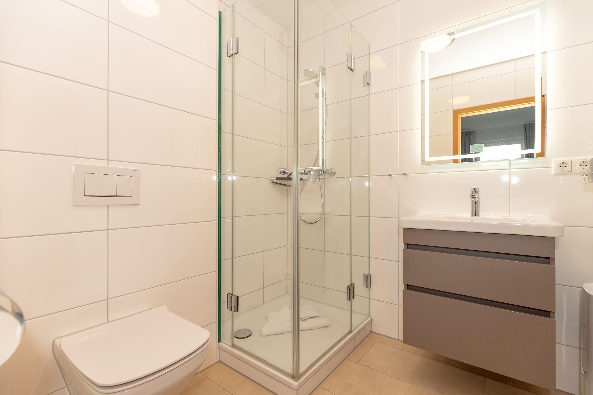 Das Badezimmer ist mit einer Dusche, einem WC, einem Fön und einem Waschbecken mit Unterschrank für Ihre Badutensilien ausgestattet.