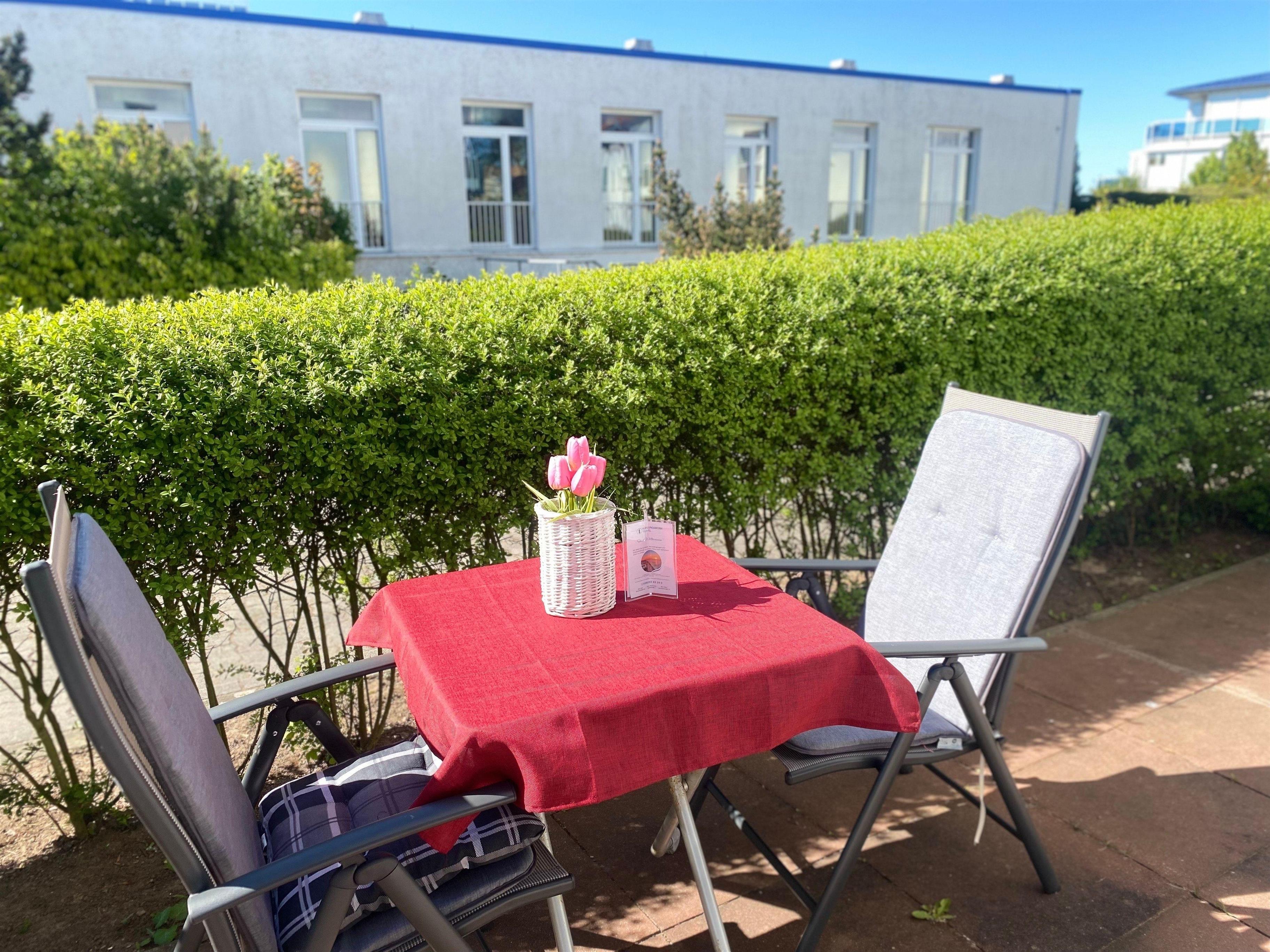 An Ihre Wohnung grenzt eine charmante Terrasse zur Südwestseite, welche Sie direkt von Ihrem Wohnzimmer aus betreten können. Auf einladenden Möbeln können Sie hier ausgiebig in der Sonne relaxen - der Alltagsstress ist schnell vergessen!