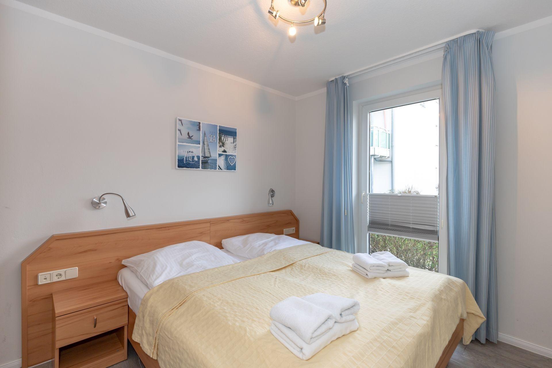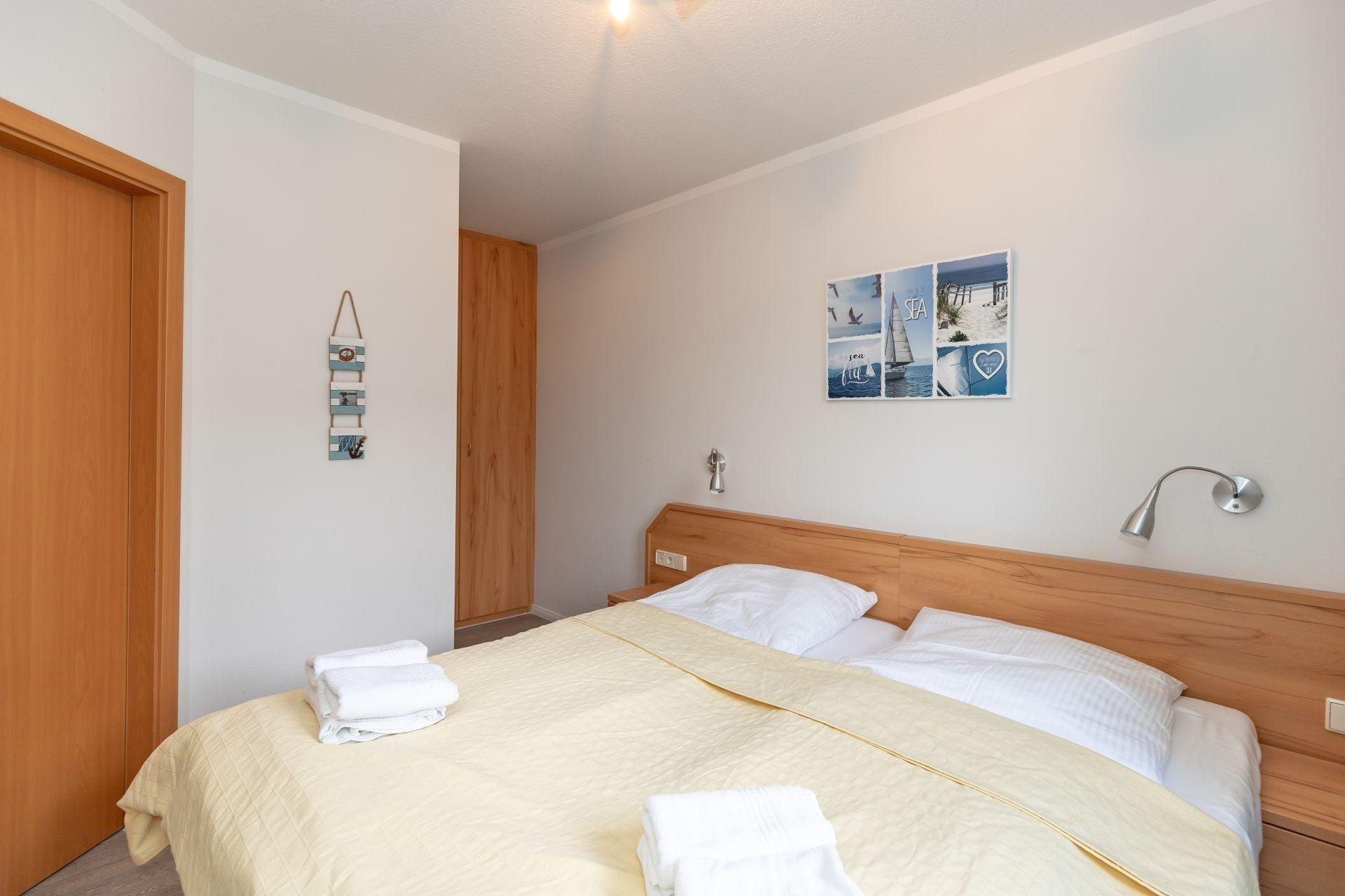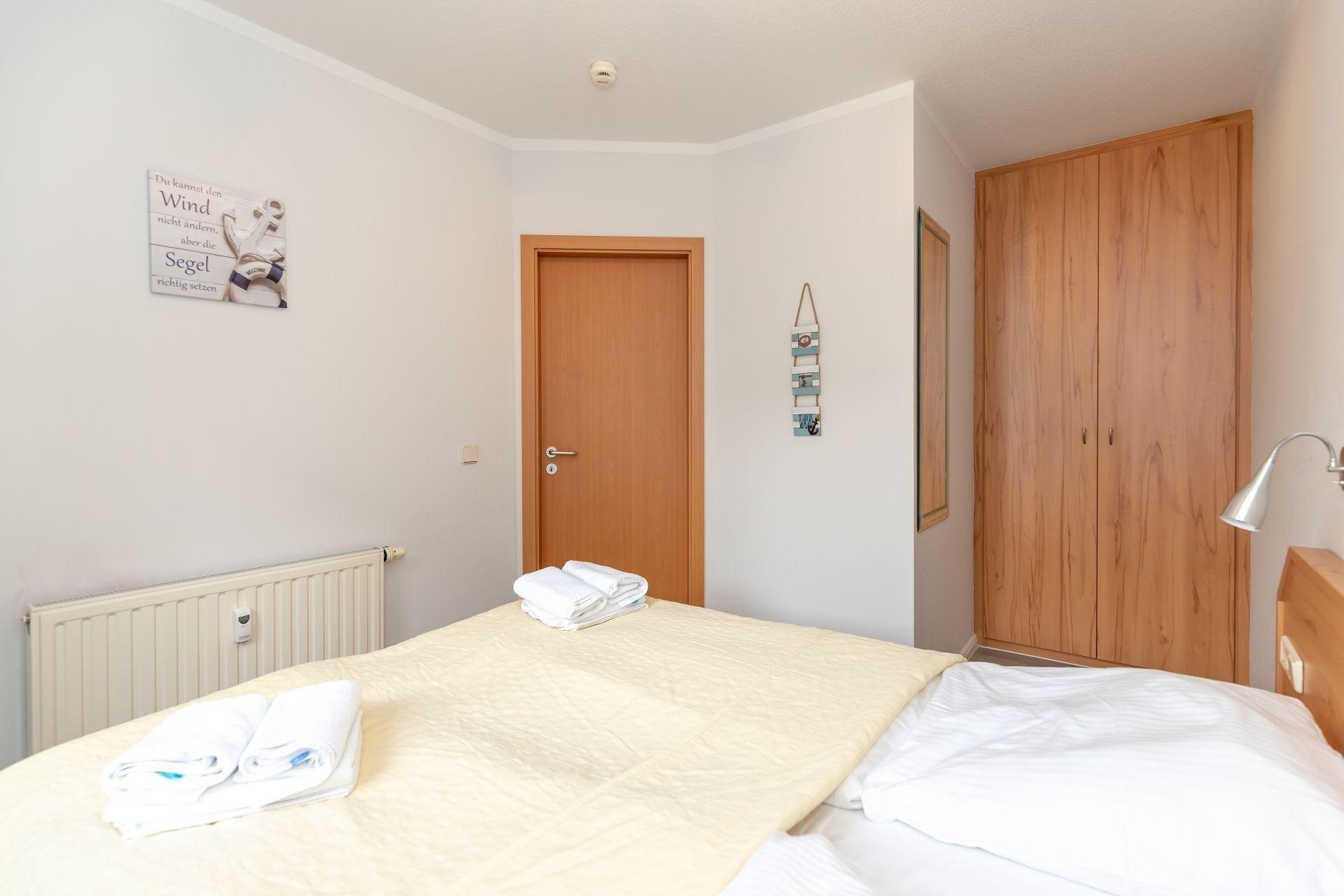 Das separate Schlafzimmer ist mit einem bequemen Doppelbett eingerichtet. Ein geräumiger Kleiderschrank bietet ausreichend Platz für Ihre Urlaubsgarderobe.