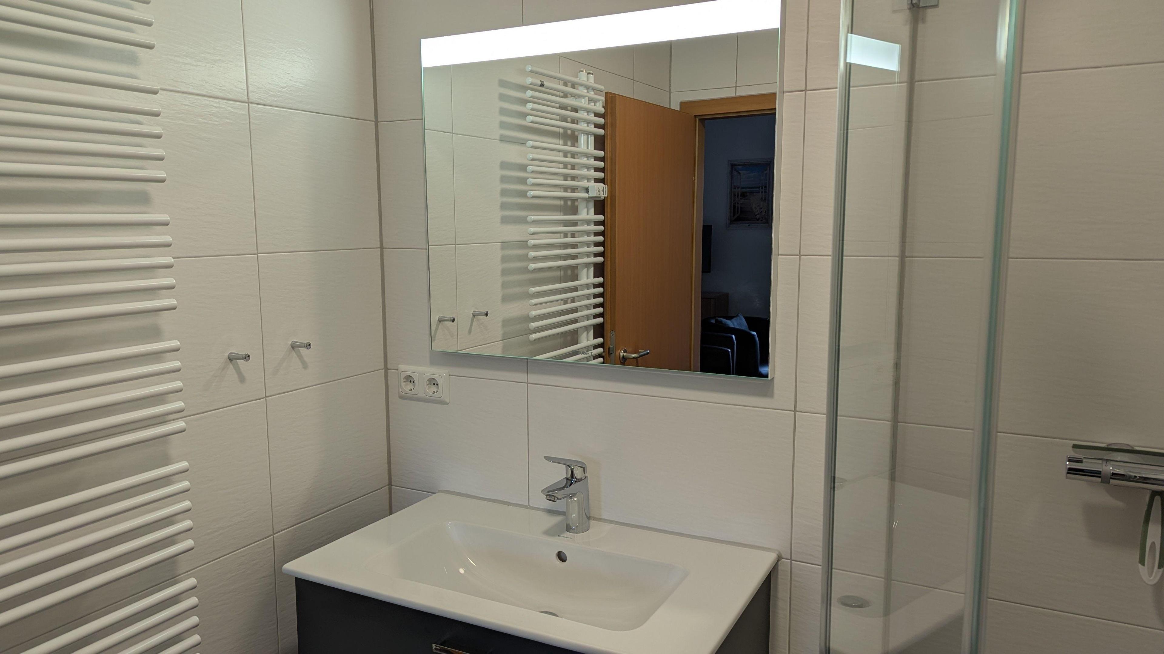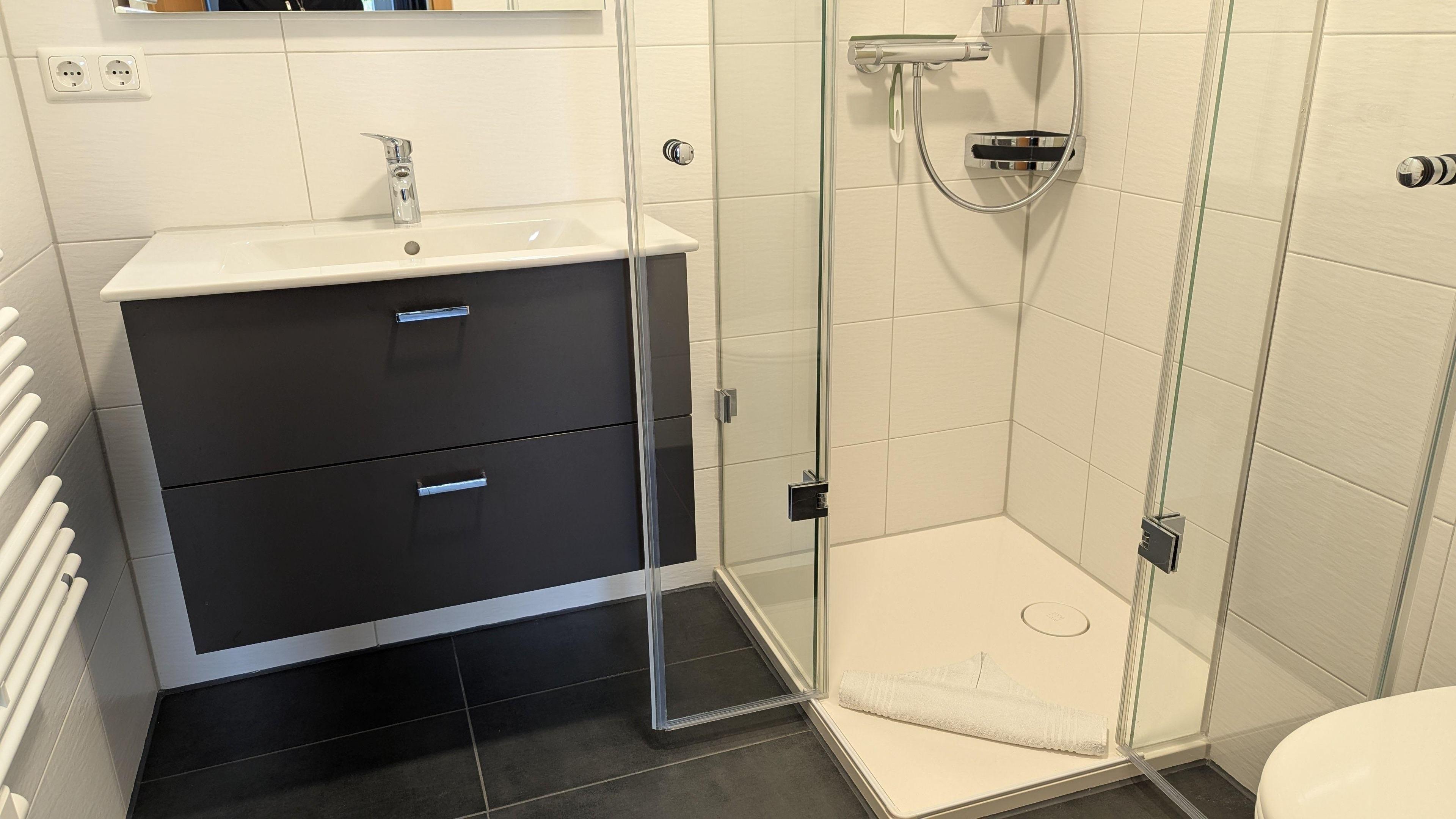 Das neue Badezimmer verfügt über eine nahezu ebenerdige Dusche, ein WC, ein Waschbecken mit Unterschrank für Ihre Badutensilien sowie einen Handtuchheizkörper.