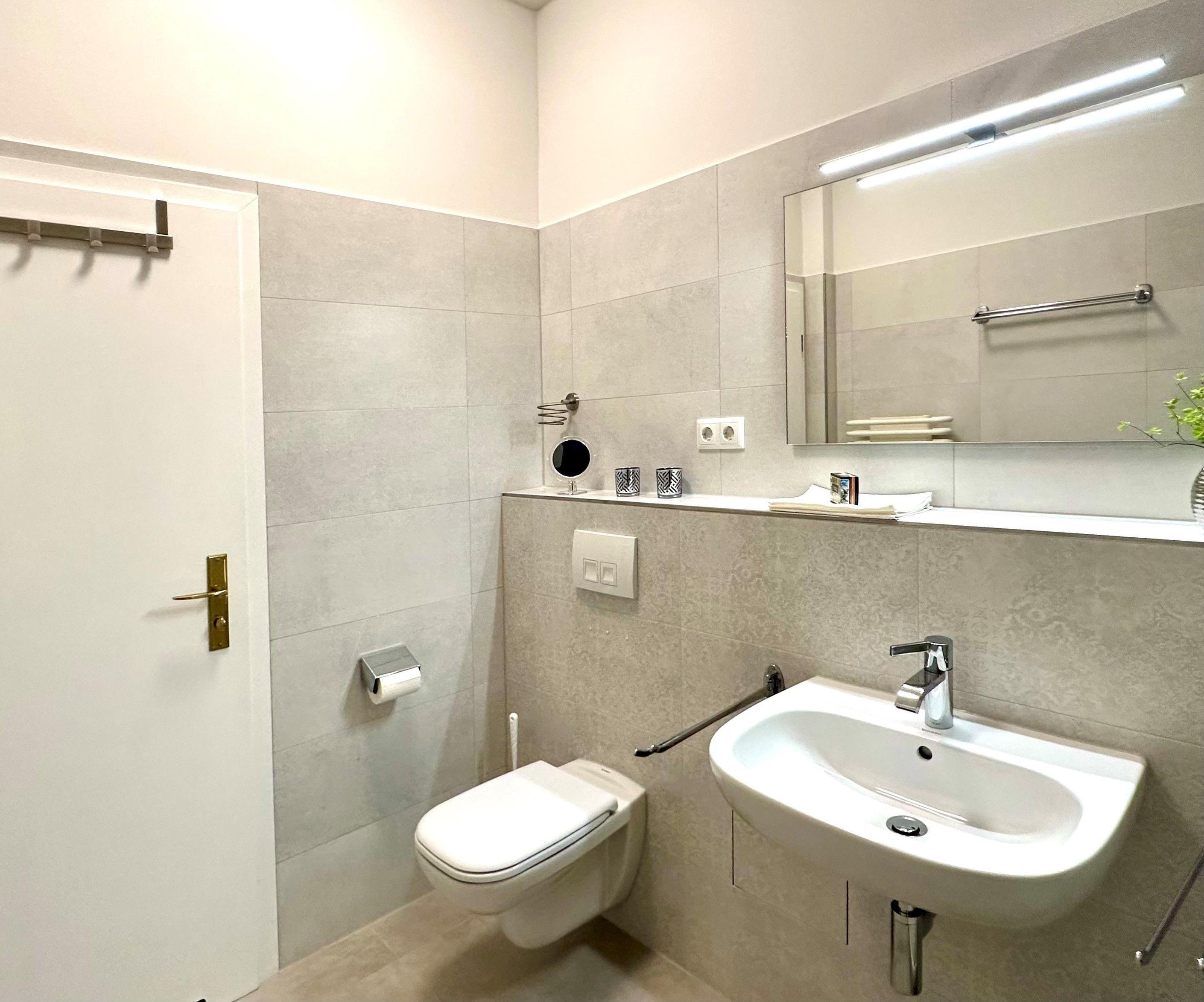 Das helle geräumige Bad mit großer Walk-In-Dusche verfügt über einen großen Spiegel, viele Ablageflächen, Waschbecken, WC und Föhn.