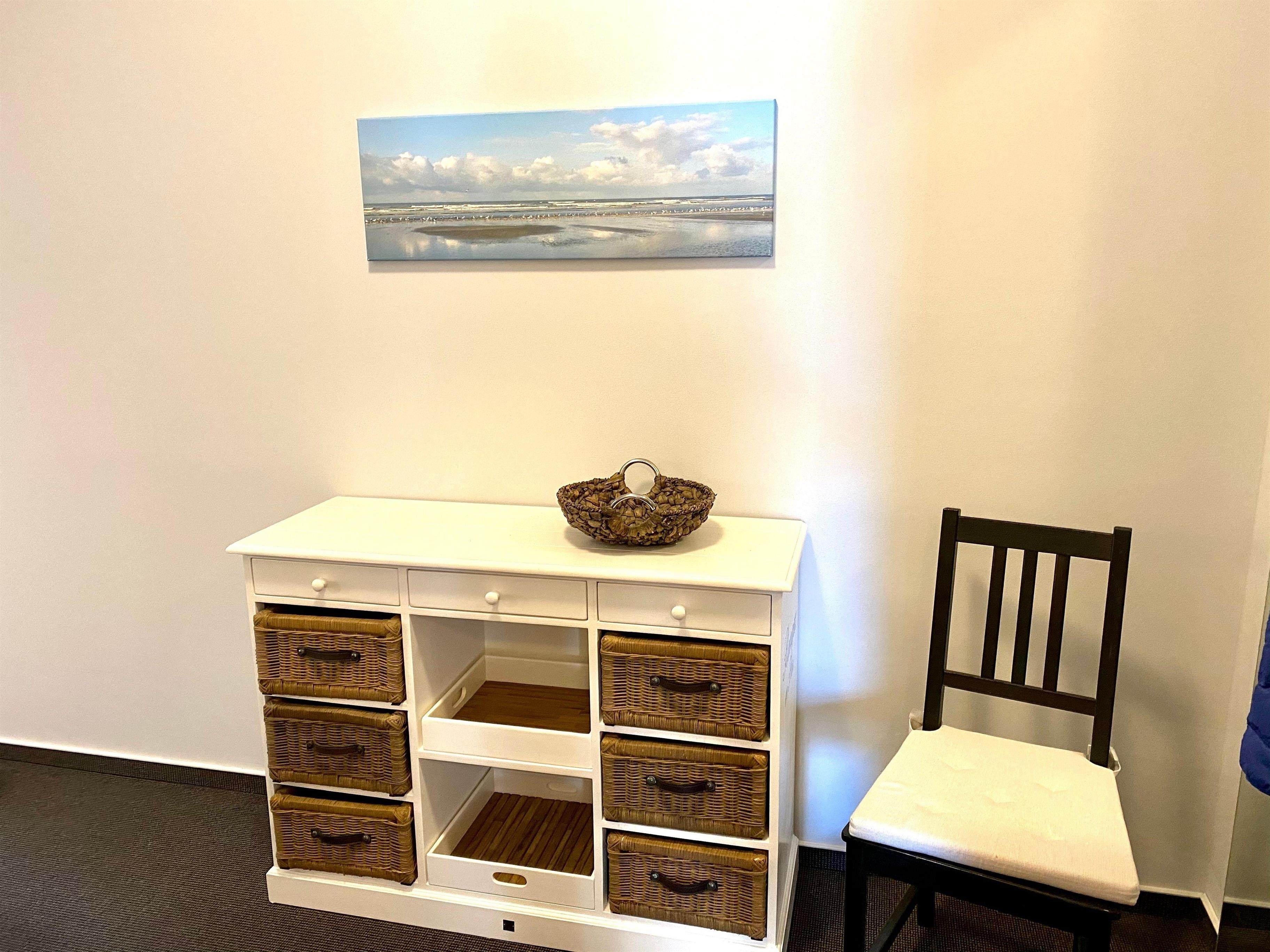Im Eingangsbereich befindet sich eine geräumige Kommode sowie eine Garderobe mit großem Spiegel.