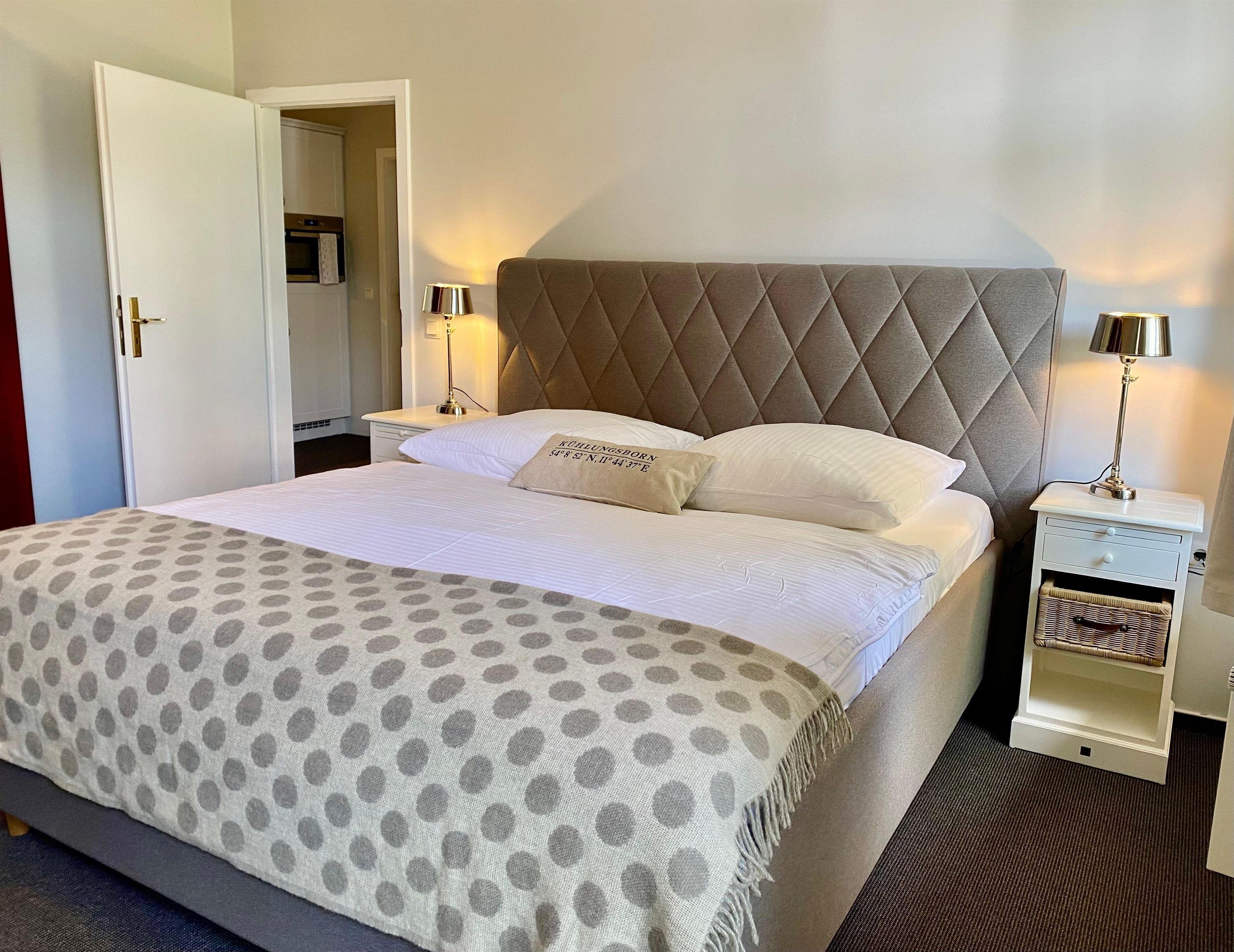 Das geräumige Schlafzimmer verfügt über ein luxuriöses Boxspring-Bett (1,80 x 2,00 m), einen großen Kleiderschrank mit Safe für Ihre Wertsachen, einen zweiten Fernseher sowie eine gemütliche Schreib- und Leseecke.