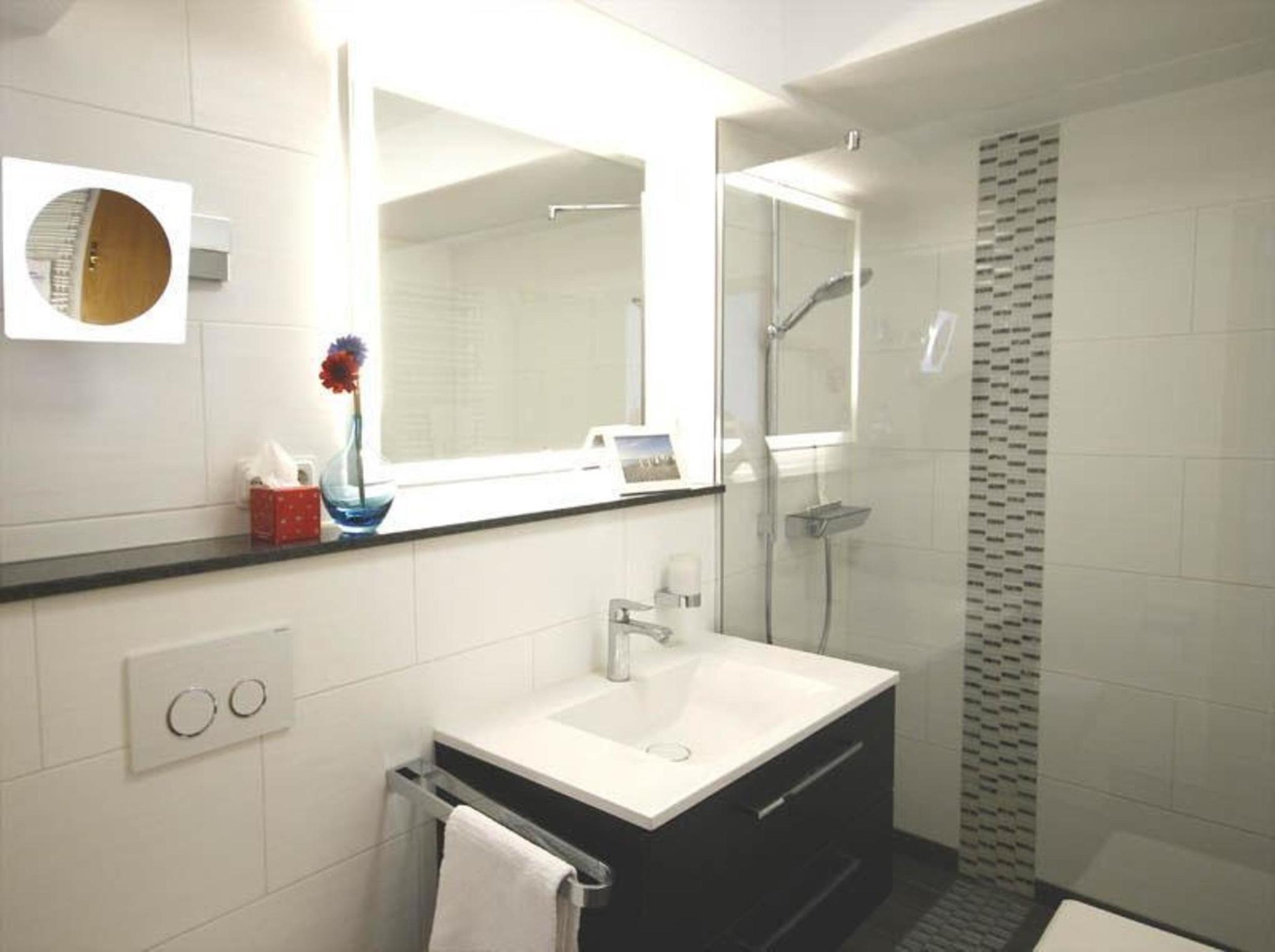 Das großzügig geschnittene, modern geflieste Badezimmer verfügt über eine ebenerdige Dusche, ein Waschbecken mit Unterschrank, ein WC und einen Handtuchheizkörper.
