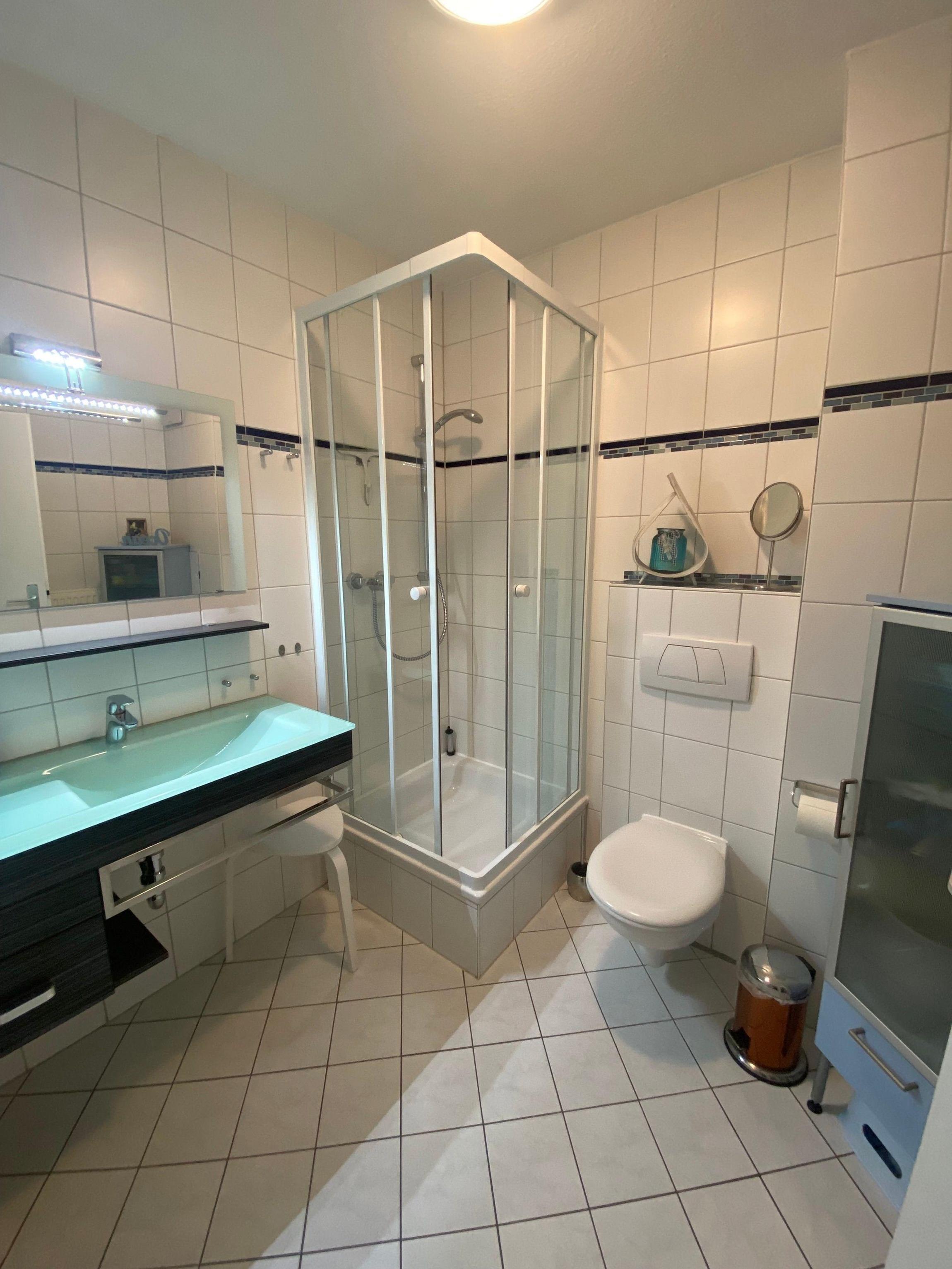 Im Badbereich finden Sie eine Dusche, WC und einen geräumigen Badschrank.