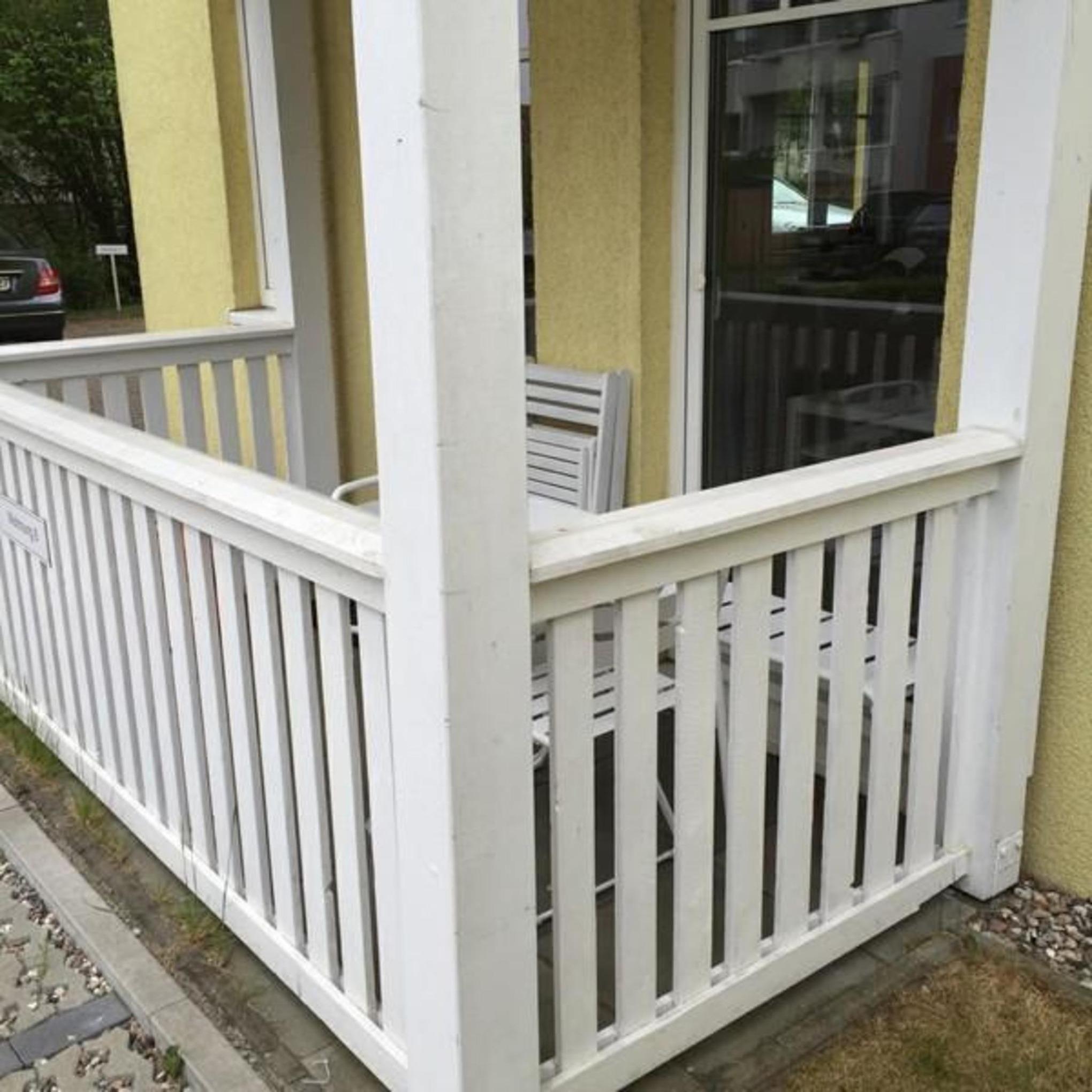 Der Balkon ist mit weißen Balkonmöbeln ausgestattet. Sitzkissen finden Sie in der Sitzbank im Flurbereich.