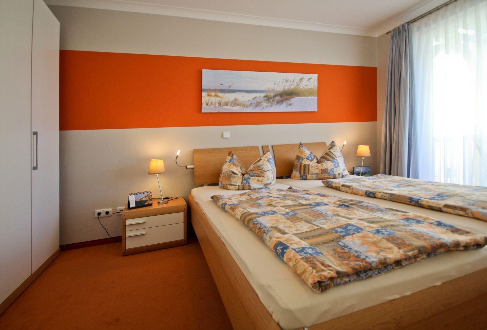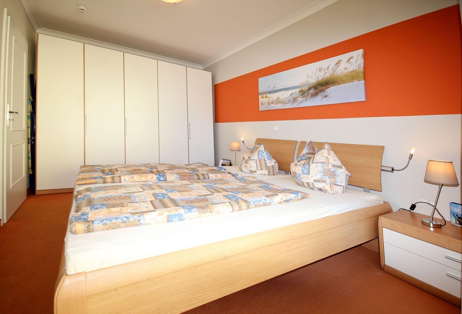 Im Schlafzimmer befinden sich ein großes Doppelbett (180 m x 2,00 m) sowie ein mehrtüriger Schrank mit ausreichend Stauraum für Ihre Urlaubsgarderobe.