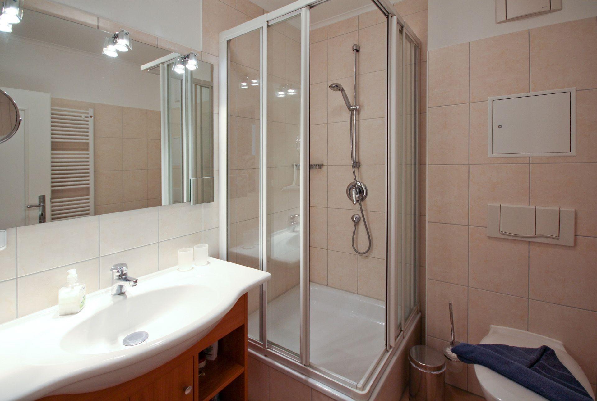 Das helle Badezimmer verfügt über eine Dusche, ein WC, ein Waschbecken mit Unterschrank sowie ein kleines Regal für Ihre Badutensilien.