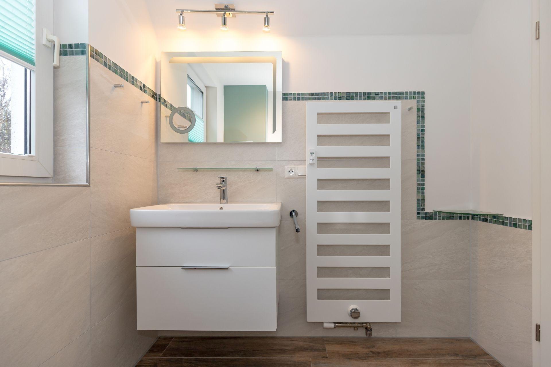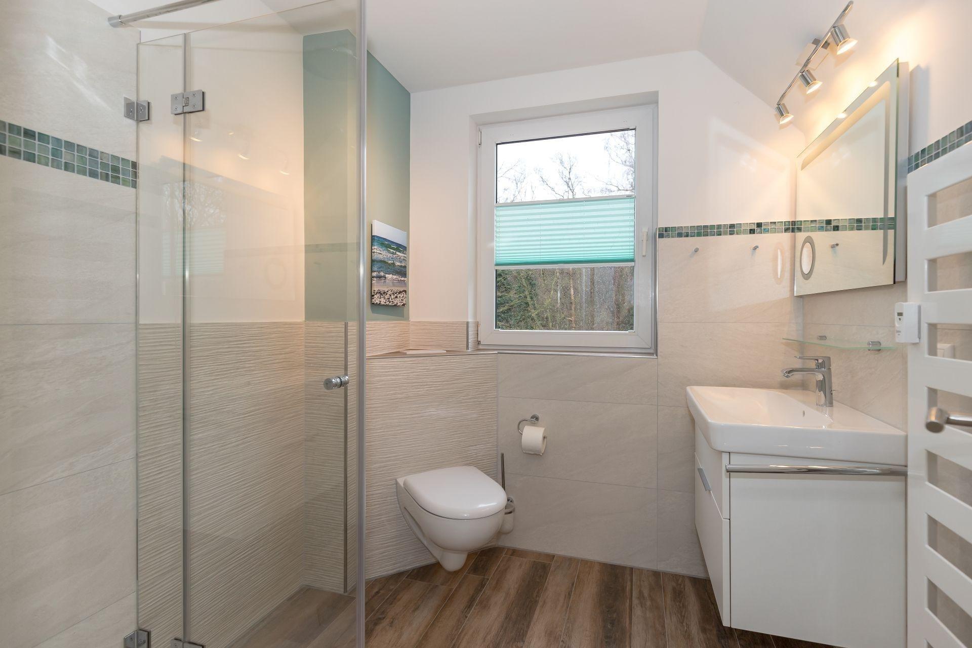 Das frisch renovierte Tageslichtbad verfügt über eine große, bodentiefe Dusche, ein WC, einen Handtuchheizkörper und einen Waschtisch mit Unterschrank für Ihre Badutensilien.