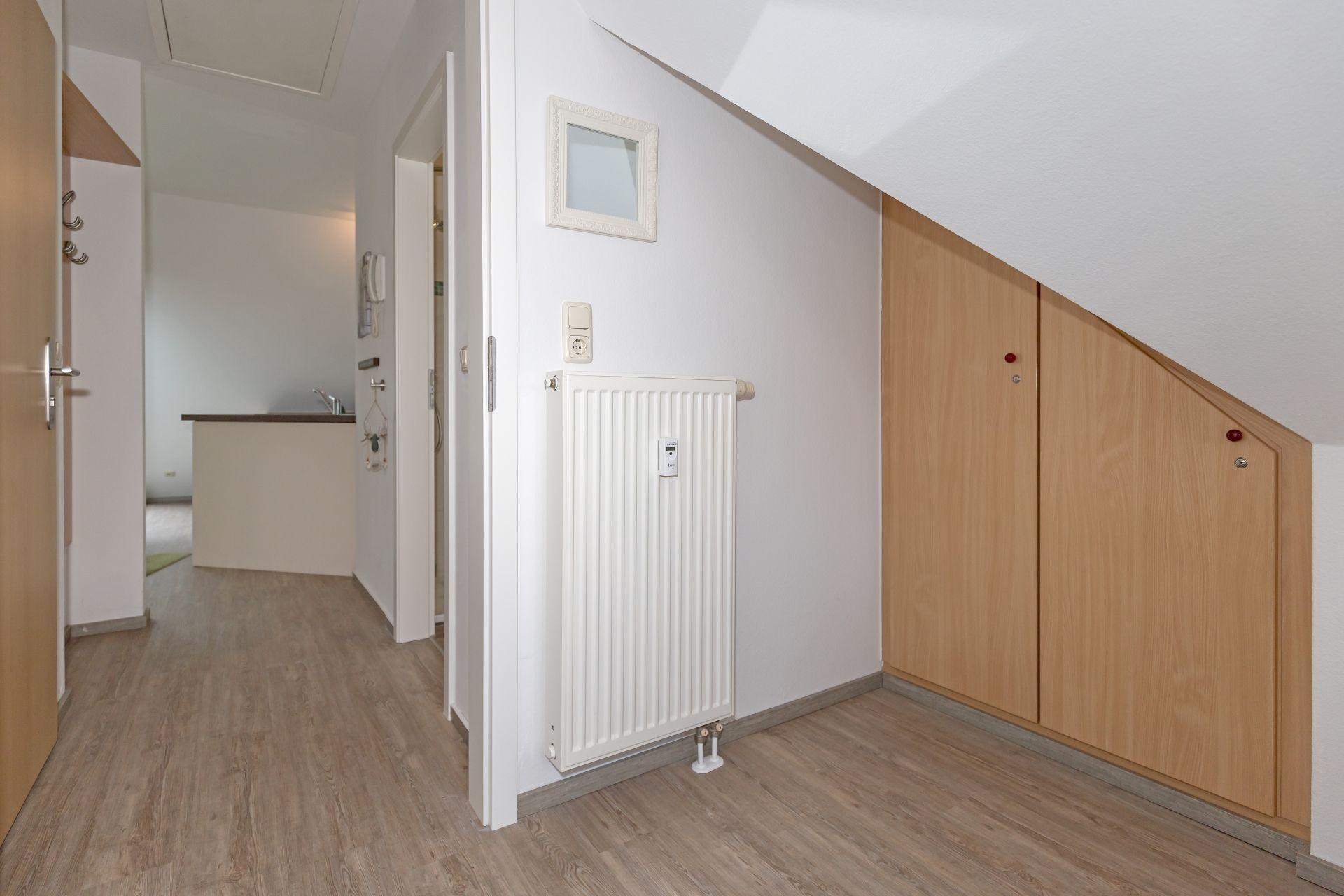 Von dem kleinen Flurbereich mit Garderobe und Spiegel finden Sie den Weg in das Schlafzimmer, das Bad und den Wohnbereich mit hochwertig eingerichteter Küche.