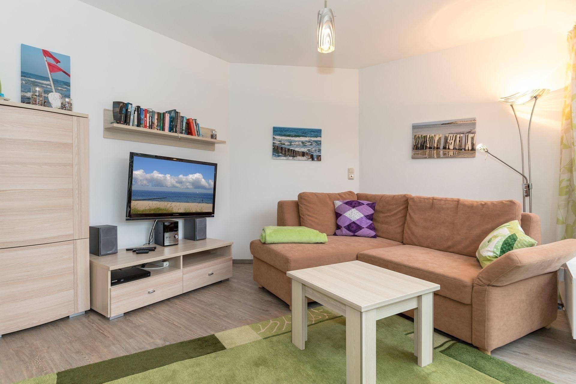 Der Wohnbereich ist geschmackvoll möbliert und liebevoll dekoriert. Das gemütliche Sofa ist mit einer Ausklappfunktion ausgestattet und bietet einen Schlafplatz für eine dritte Person.