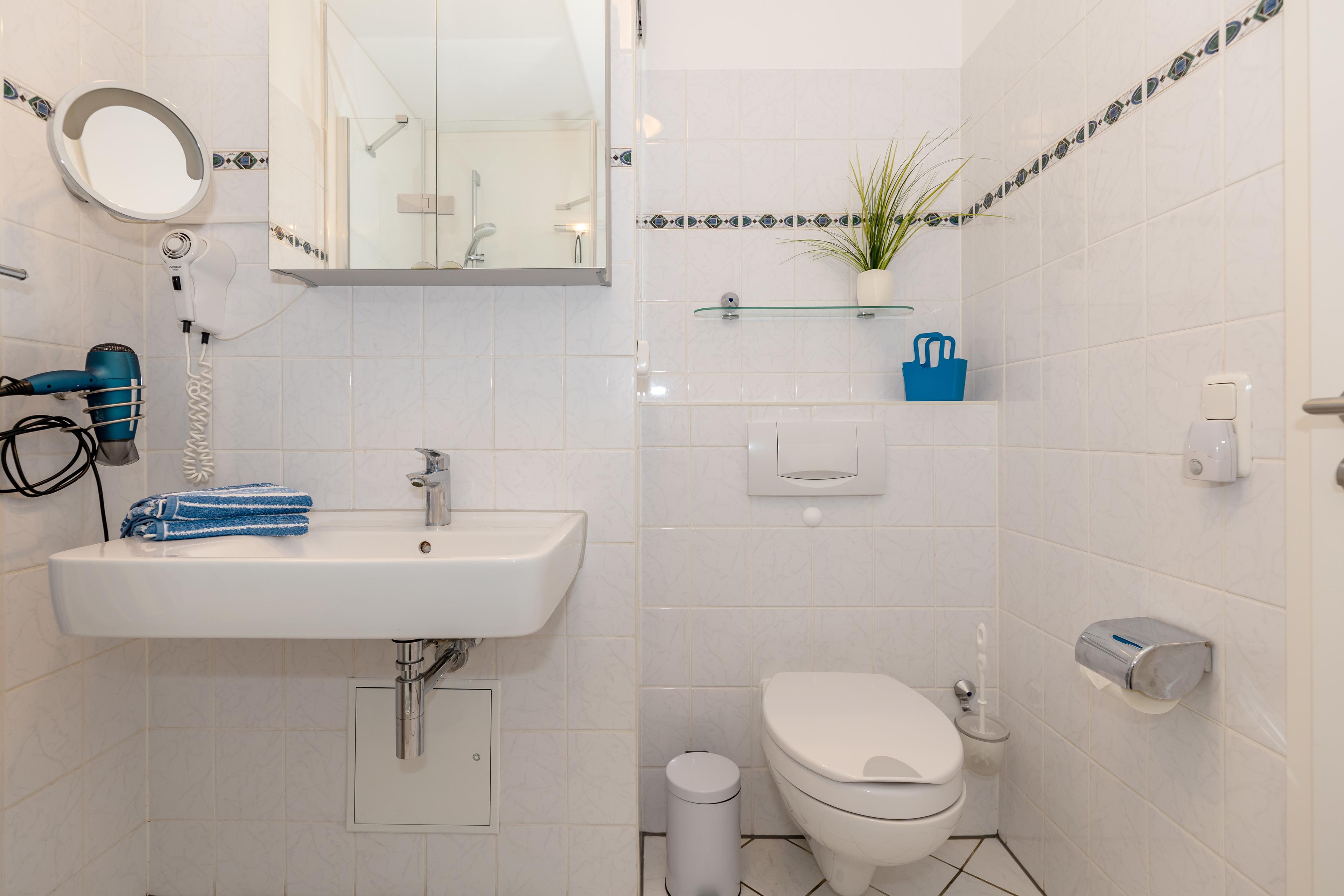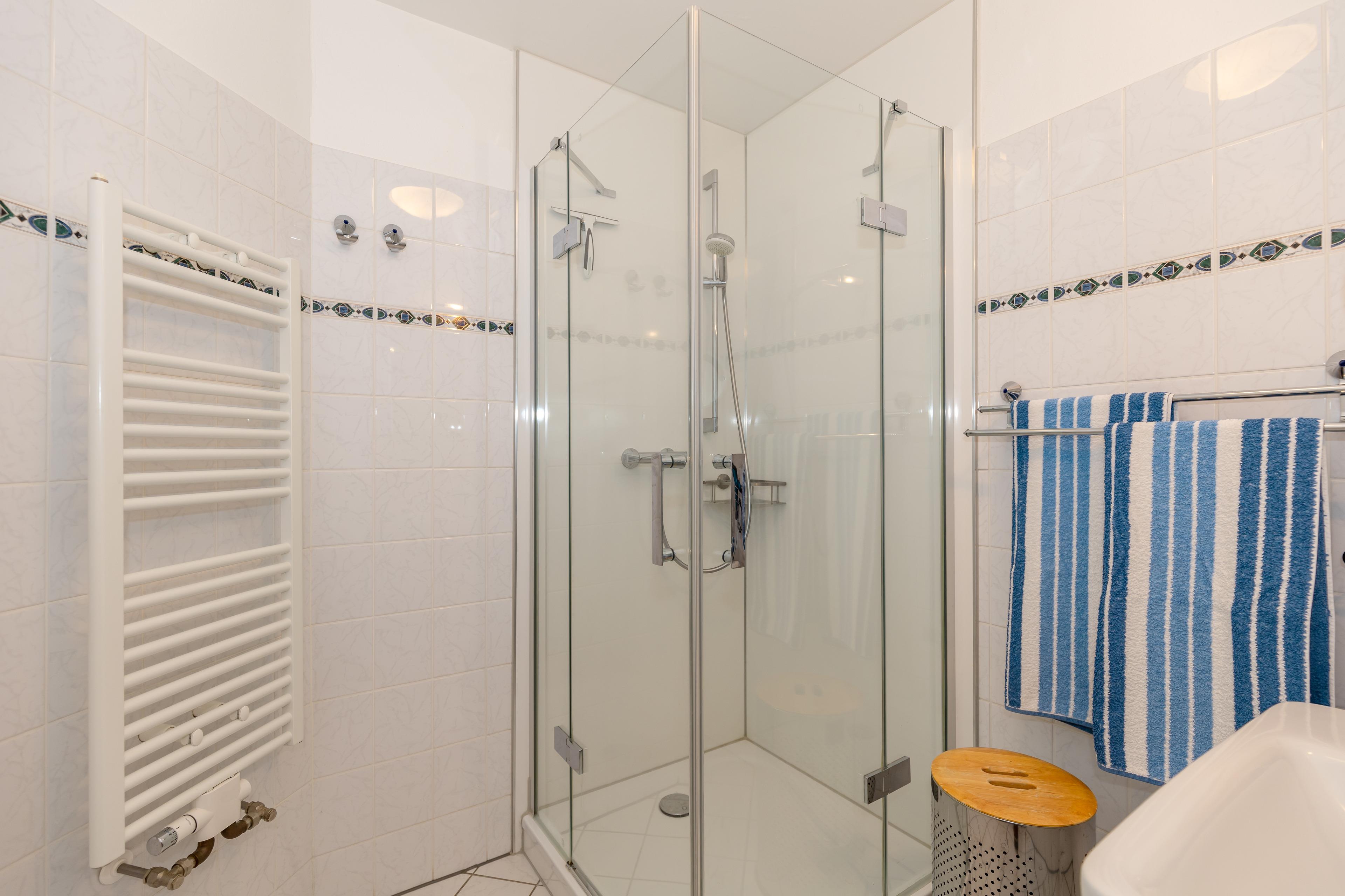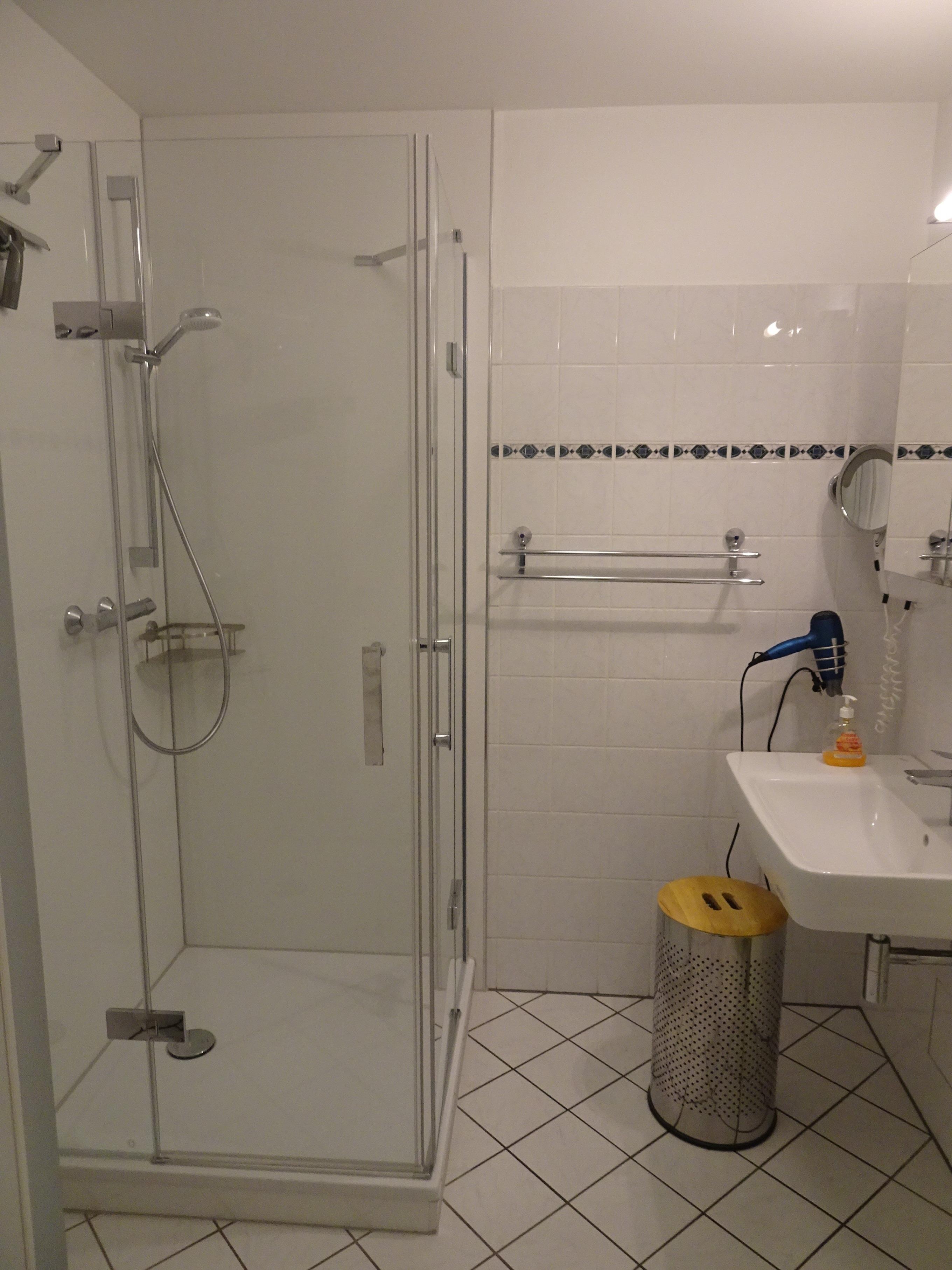 Das Duschbad ist renoviert und modernisiert, hat eine große Dusche mit flachem Einstieg und fugenlosen Wänden, Handtuchtrockner, Waschbecken mit Abstellfläche und einen dreitürigen Spiegelschrank. Die Toilette hat eine bequeme Sitzerhöhung.