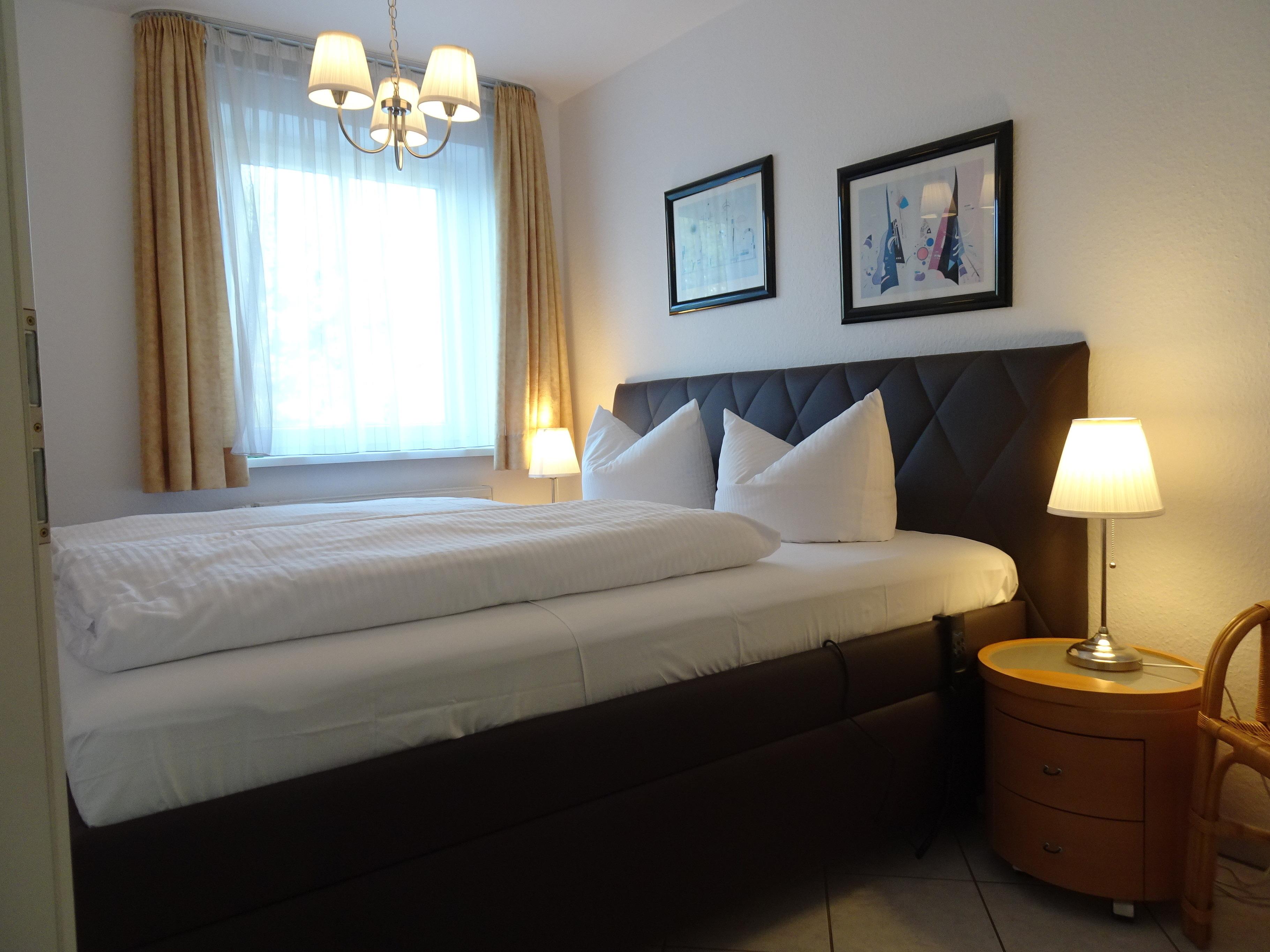Im Schlafzimmer wurde an alles gedacht: Kingsize-Bett (1,80 x 2,00 m) mit erhöhtem Einstieg und geteilten Matratzen, Nachttischen mit Lampen, Radiowecker, Schuhschrank, Herrendiener und Sessel. Vor dem Fenster wurde ein beschichtetes Verdunkelungsrollo angebracht, dass die Hitze aussperrt.