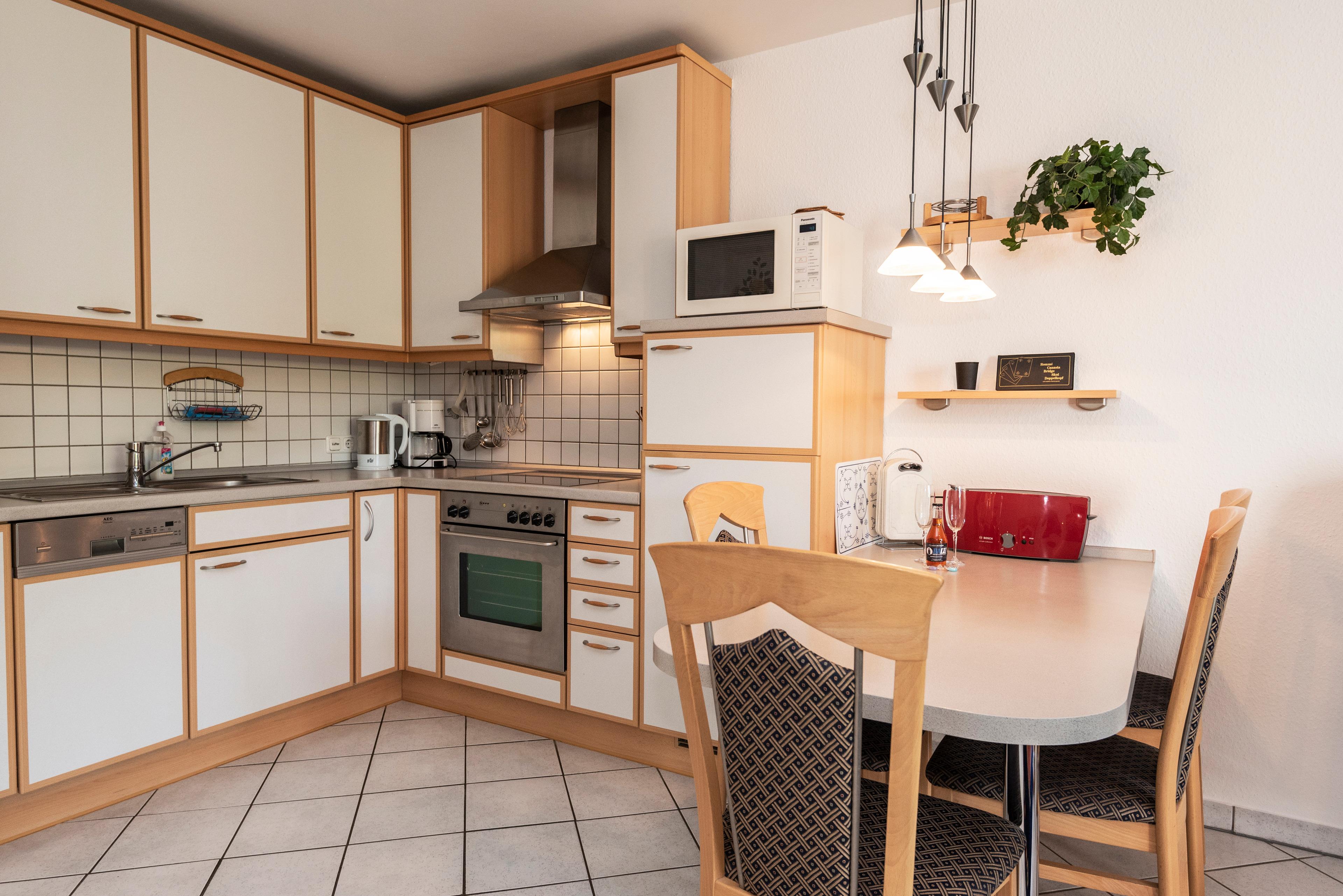 Die im großen Wohnraum integrierte L-Küche ist bestückt mit einem 4-Zonen-Ceranfeld mit zuschaltbarer Erweiterung für große Töpfe, Umluft-Backofen, Kühlschrank mit großem Gefrierfach und einer Spülmaschine, etc.. Steckdosen, alle Küchenutensilien und Geschirr sind in ausreichender Menge vorhanden.
