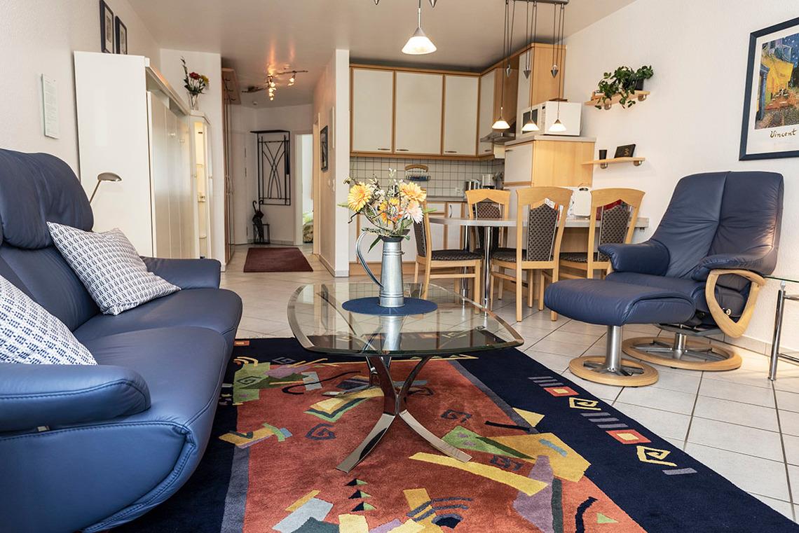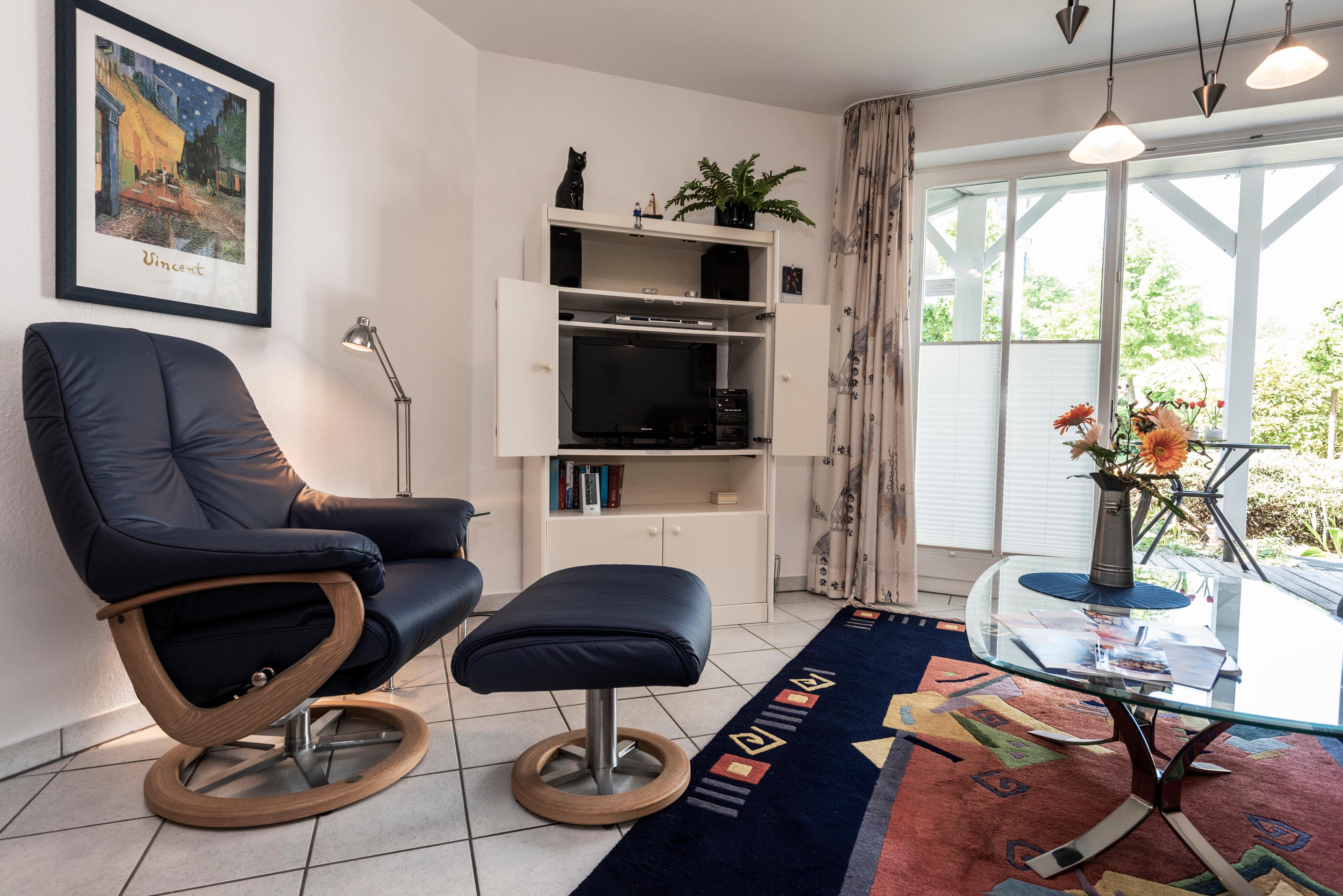 Der Wohnraum ist ausgestattet mit einem Ledersofa mit hohen Rückenlehnen, einem Relaxsessel mit Hocker, kleinem Schreibtisch und im Raum verteilten indirekten Lichtquellen, Medienschrank mit großem TV-Bildschirm, Videorecorder, Blu-Ray-Player, Radio, Soundbar, einige Bücher und diverses Informationsmaterial. Schnelles WLan vorhanden.