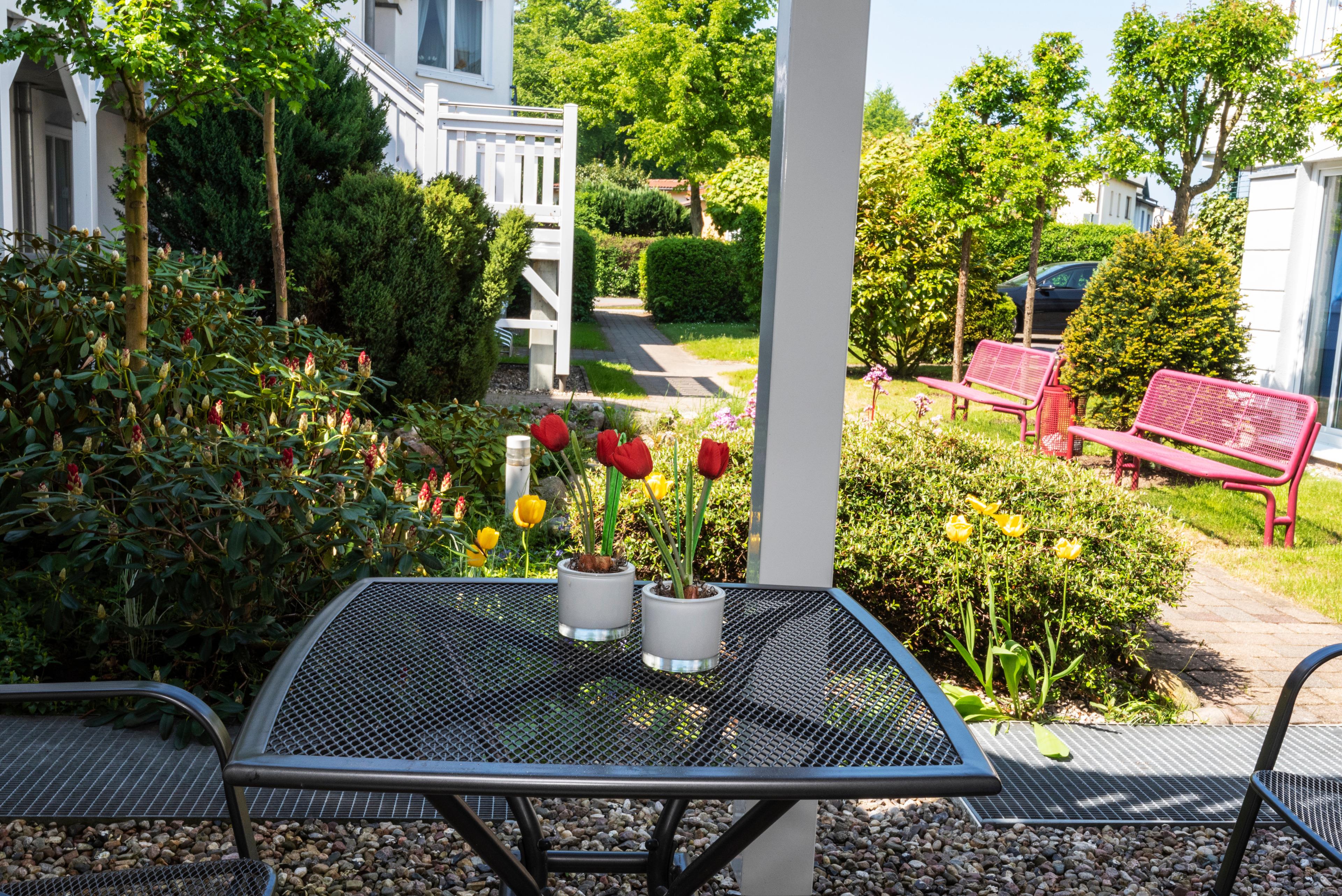 Auf Ihrer möblierten Terrasse, die Sie vom Wohnzimmer aus betreten, schauen Sie in den schön angelegten Gemeinschaftsgarten mit einem kleinen Goldfischteich, Büschen, Bäumen und Rasenflächen.