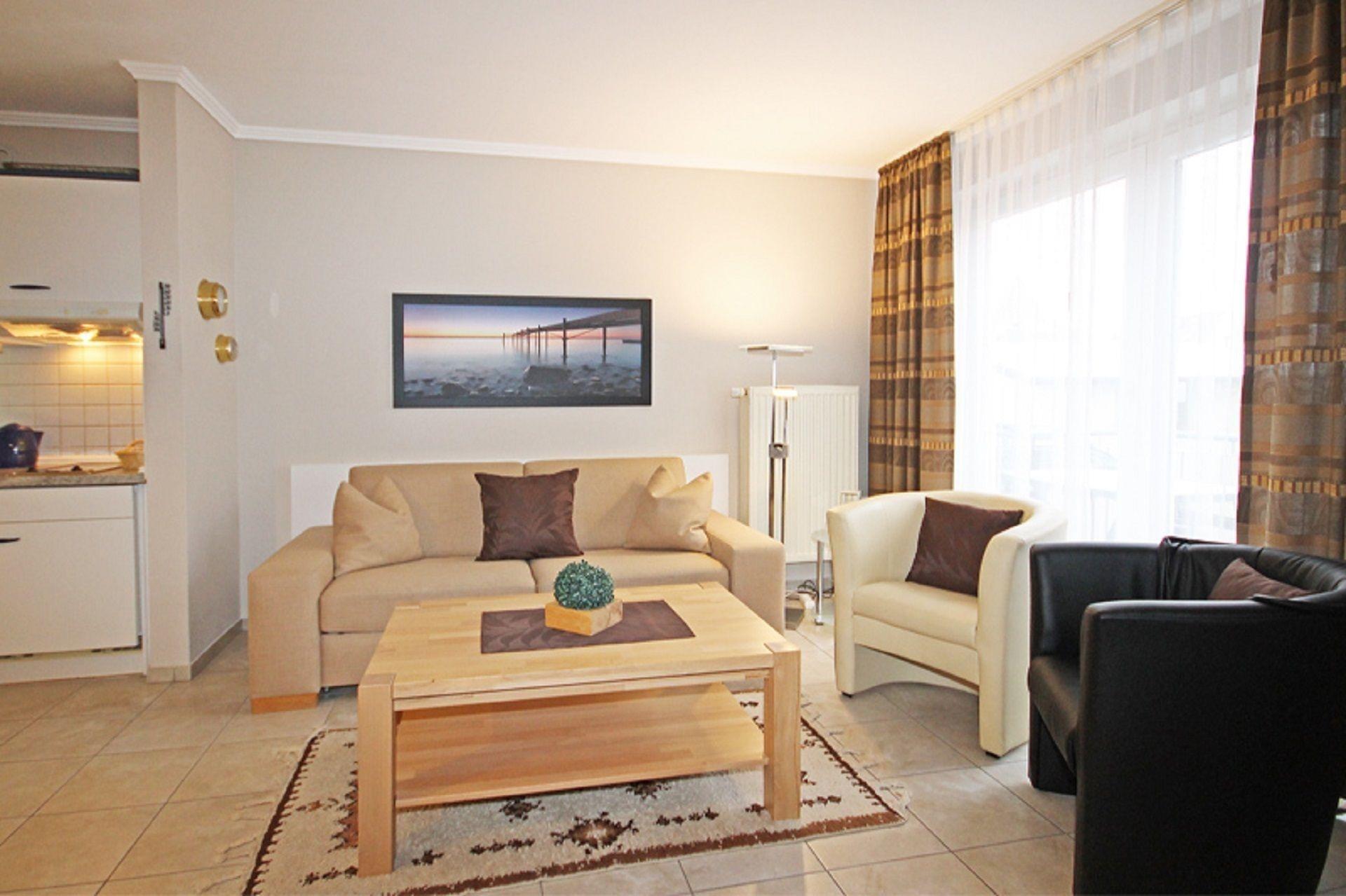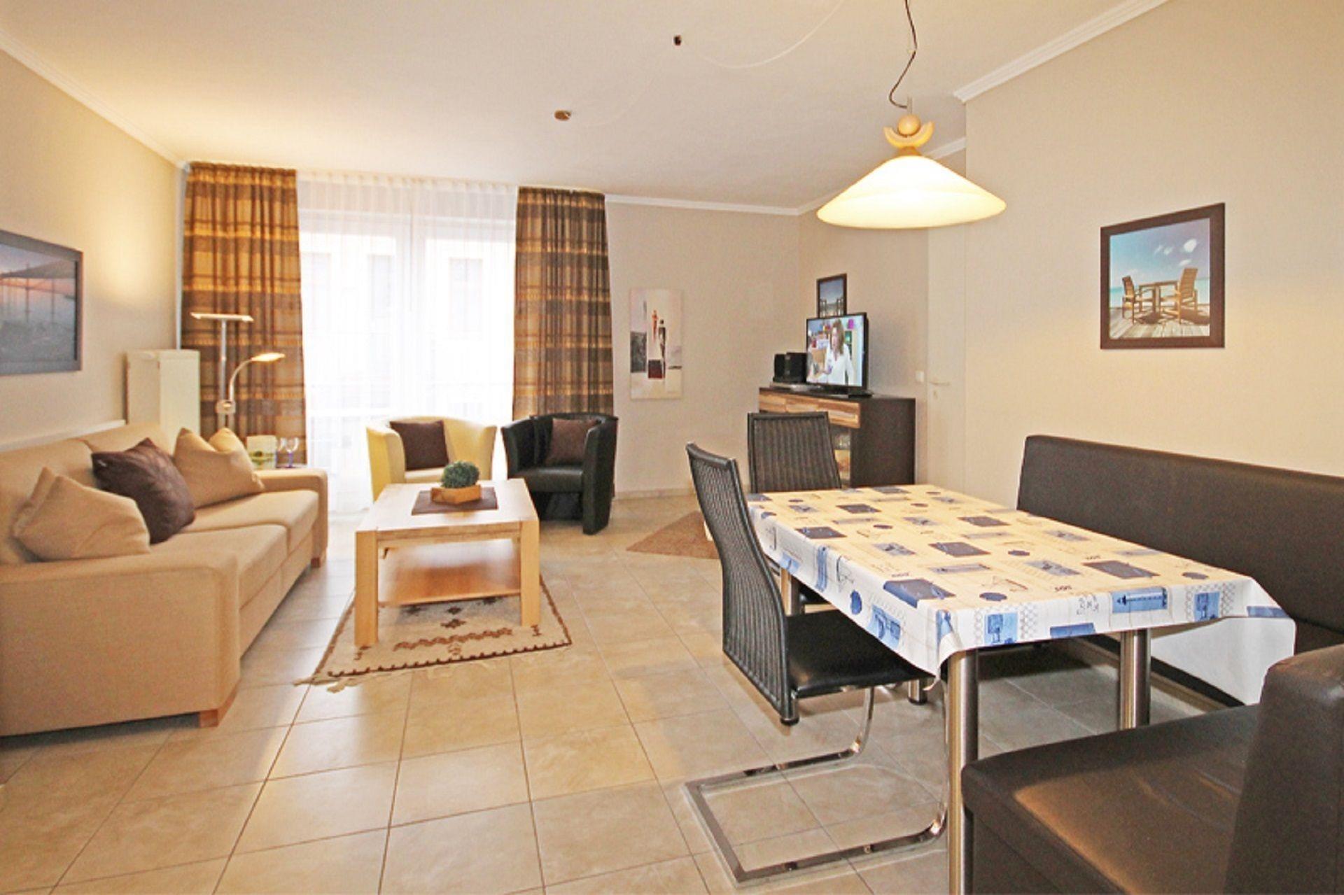 Das Wohnzimmer bietet Ihnen zwei komfortable Sessel und ein bequemes Schlafsofa (145 x 200 cm), welches für eine dritte Person geeignet ist. Für gute Unterhaltung sorgen eine Auswahl an Büchern, ein DVD-Player, eine Stereoanlage sowie ein Flachbild-Fernseher. Eine große Essecke ermöglicht es Ihnen hier gemütlich zusammen zu sitzen. Zudem haben Sie, vom Wohnbereich aus, die Möglichkeit den ersten Balkon zu betreten.