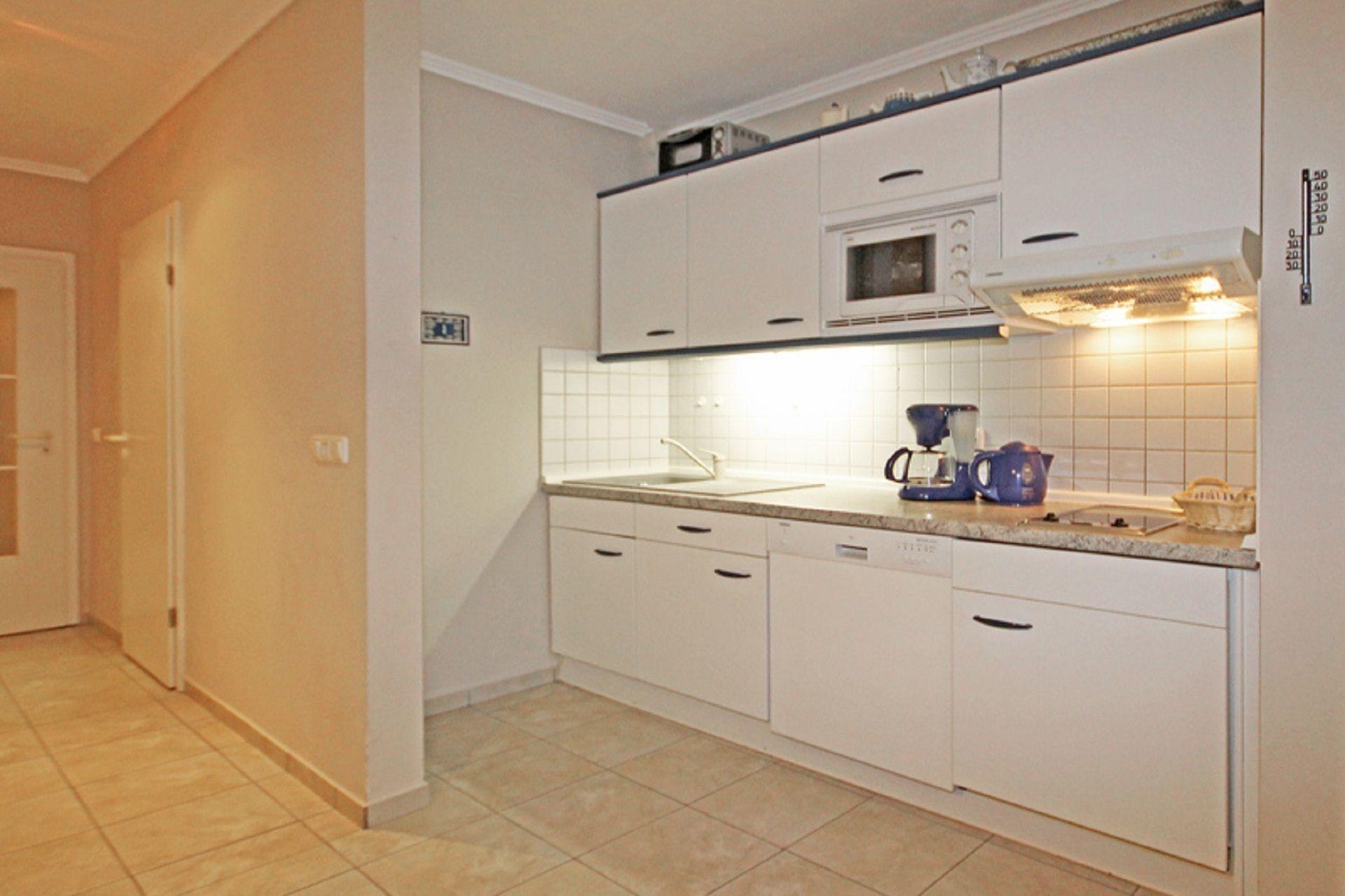 Die integrierte Küchenzeile der Ferienwohnung ist ausgestattet mit einem Kühlschrank mit Gefrierfach, einem Geschirrspüler, einem 2-Platten-Cerankochfeld, einer Mikrowelle mit Grillfunktion, einem Minibackofen, einer Kaffeemaschine, einem Toaster und einem Wasserkocher.