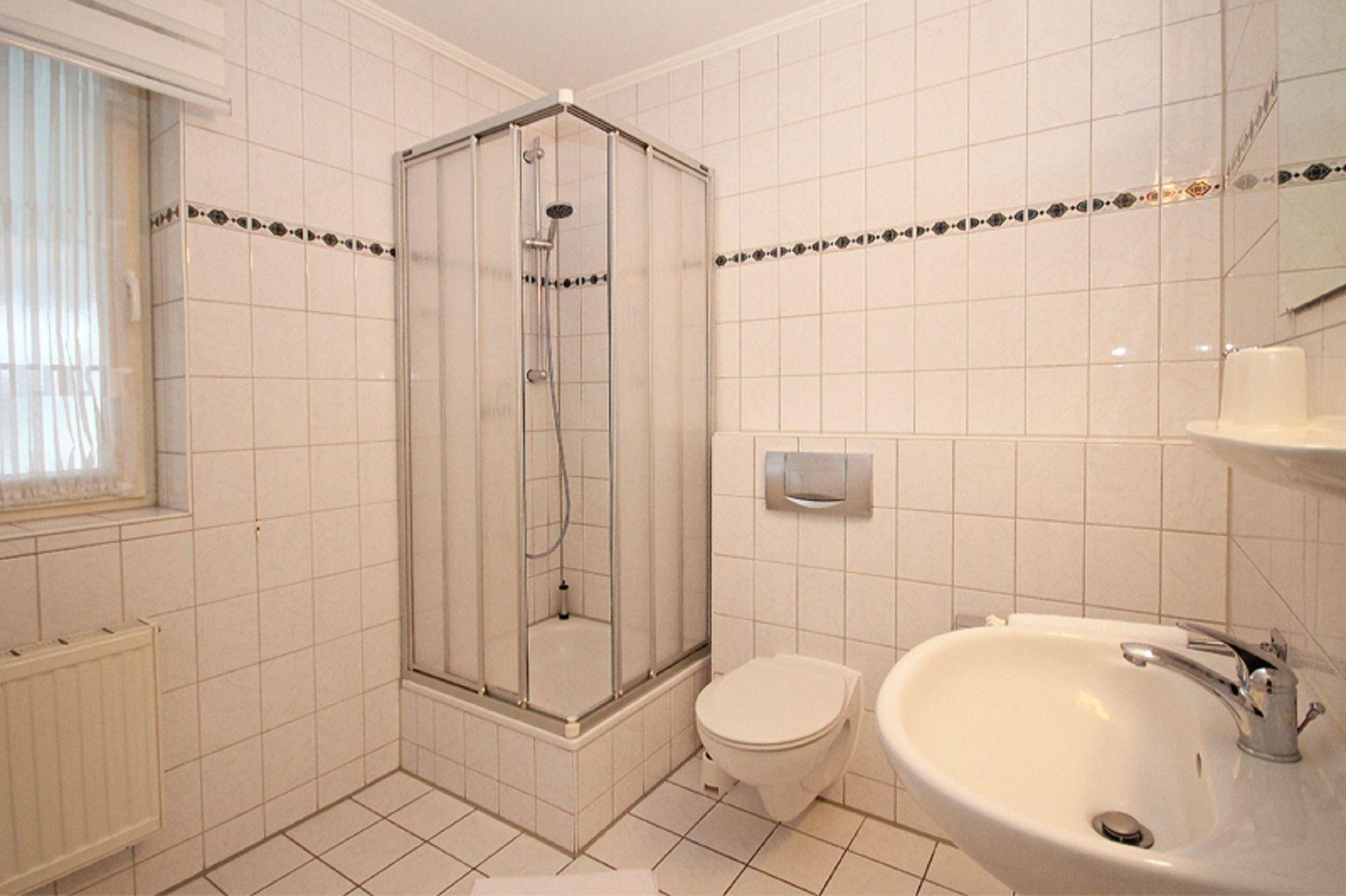 Das helle Tageslichtbad mit Duschbad und WC ist sehr geräumig. In der gesamten Wohnung wurden Fliesen verlegt.