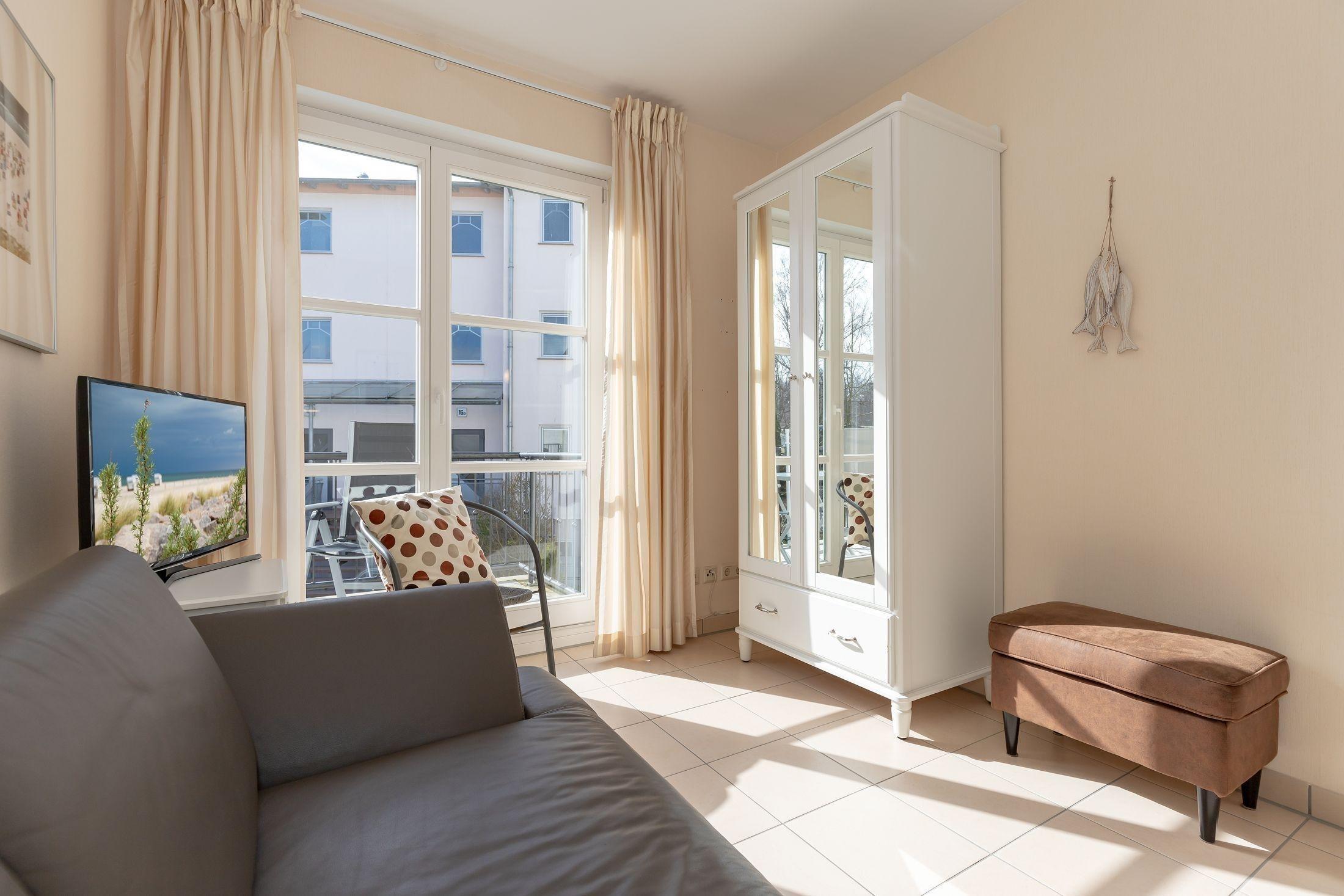 Das zweiten Schlafzimmer bietet eine Couch, welche man mit einfachen Handgriffen als weitere Schlafmöglichkeit umfunktionieren kann. Auch dieser Raum ist mit einem Fernseher ausgestattet, sowie einem Kleiderkrank.
