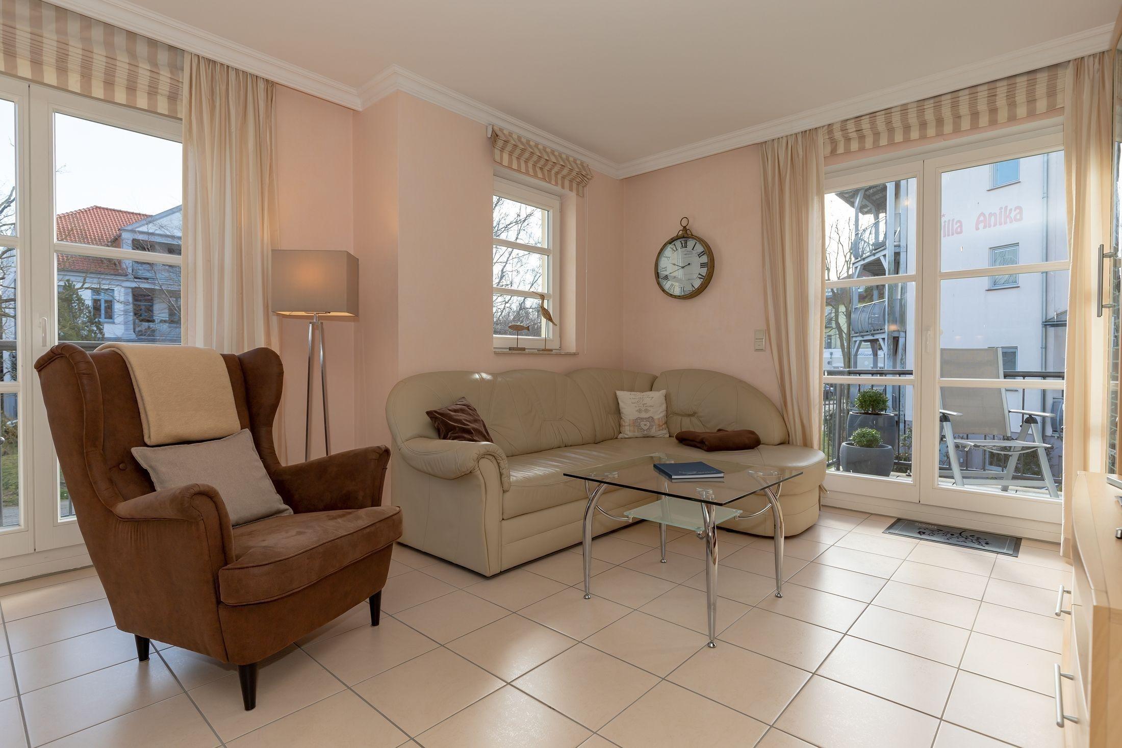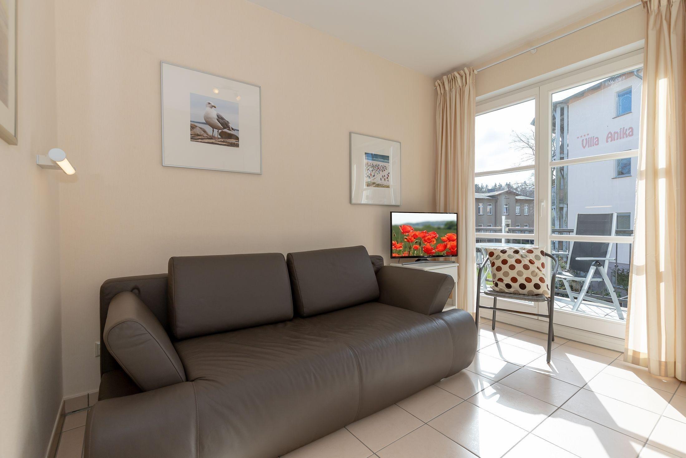 Das helle Wohnzimmer ist mit einer gemütlichen Couch und einem Sessel ausgestattet. Hier finden Sie auch ein Flat TV, eine Musikanlage und sogar Spiele und Bücher.