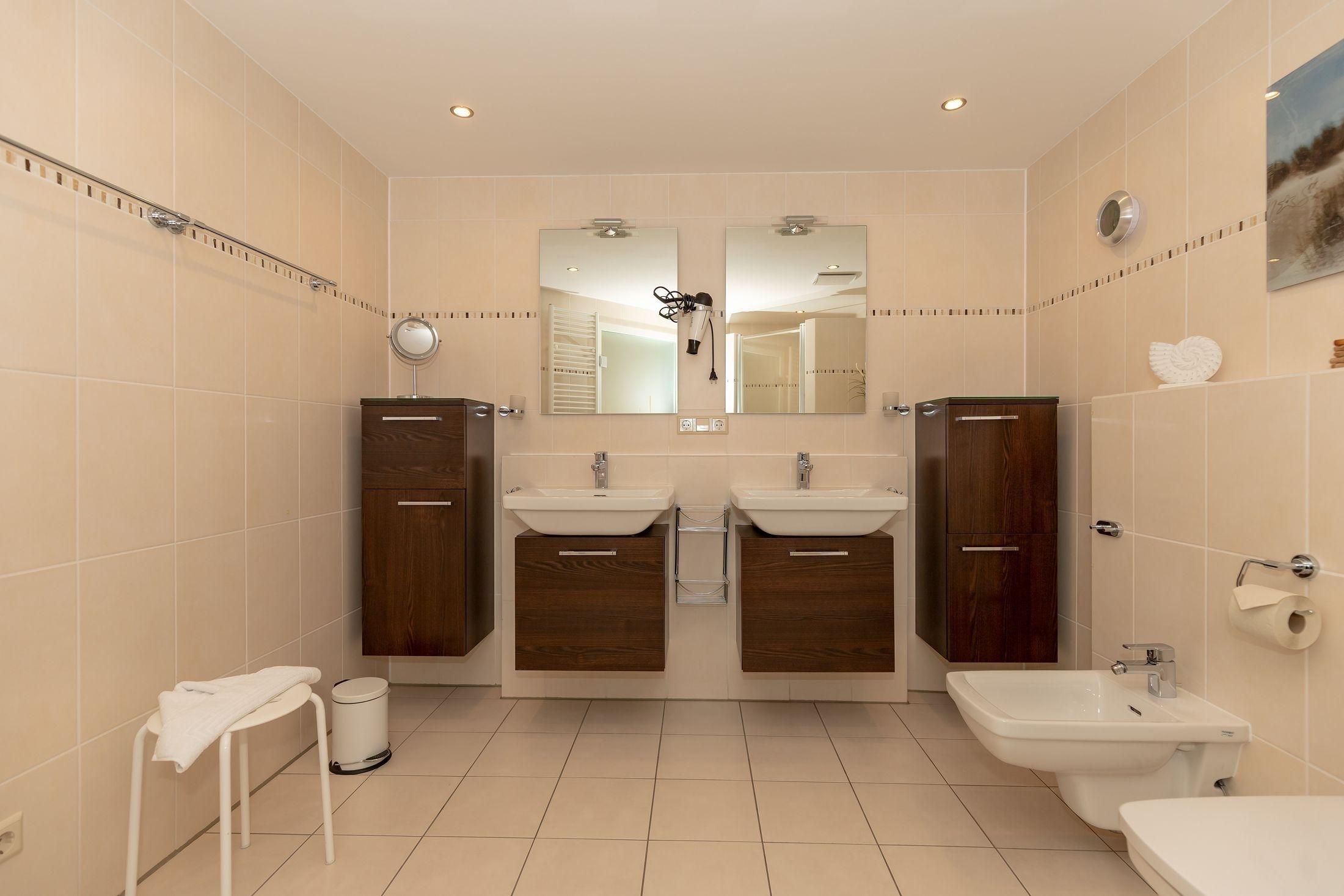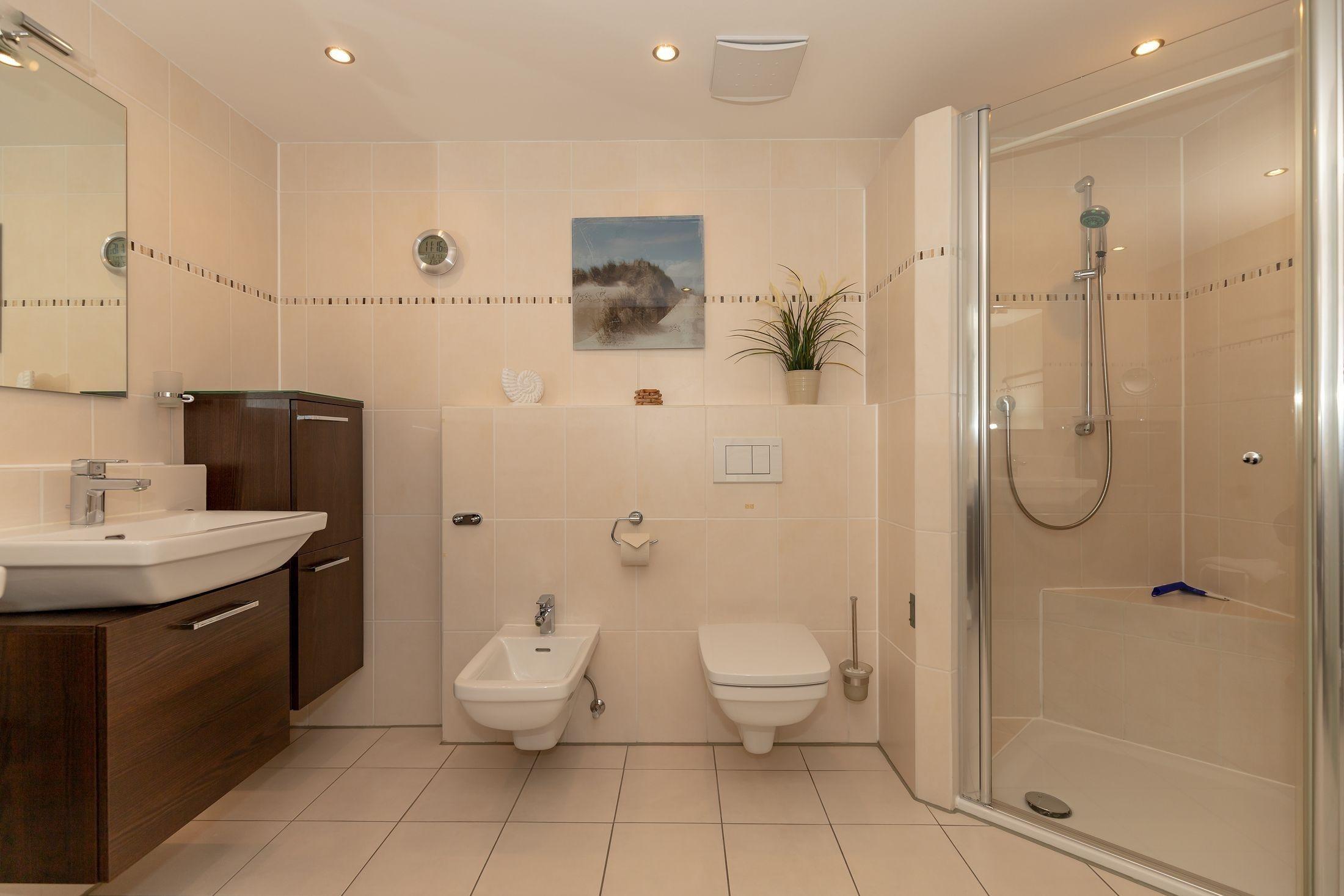 Das Duschbad ist mit Dusche, WC und Bidet modern eingerichtet.